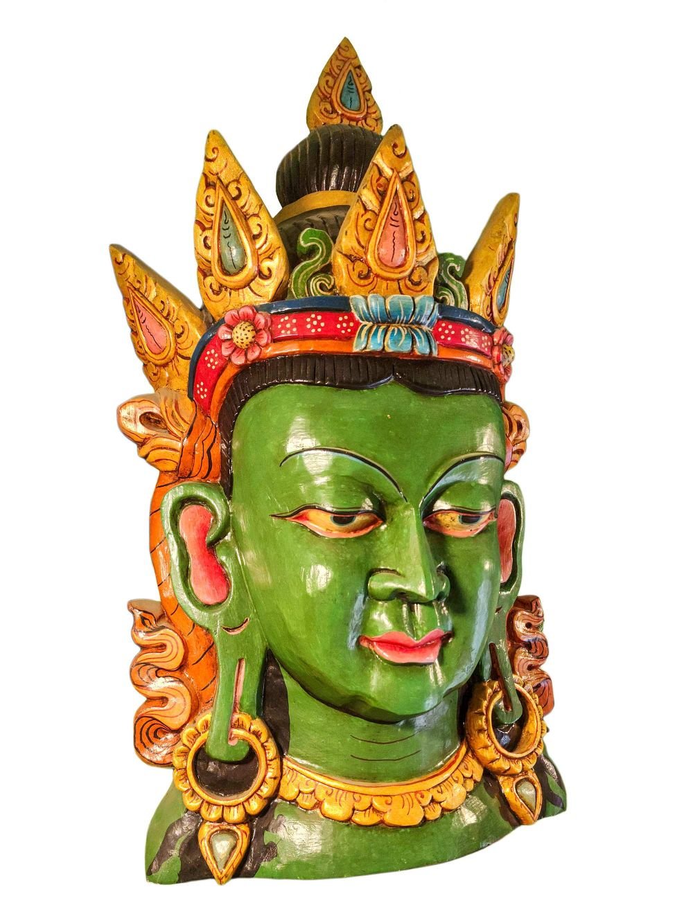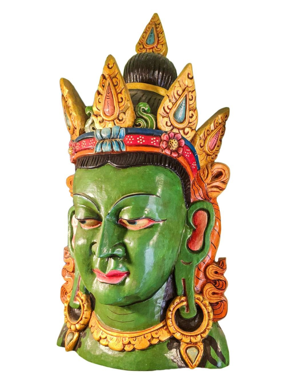 Green Tara Head, Handmade Wooden Mask, Wall Hanging, Painted, Poplar Wood , Goddess of Compassion, Protection, and Swift Action