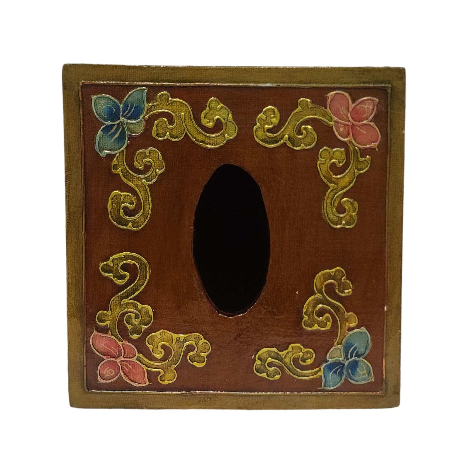 Tibetan Color Palette: Painted in the alluring colors reminiscent of Tibetan art, the tissue holder emanates an aura of serenity and tranquility. The beautiful hues of red, blue, green, and gold evoke a feeling of cultural enchantment, creating a harmonious atmosphere wherever it's placed.