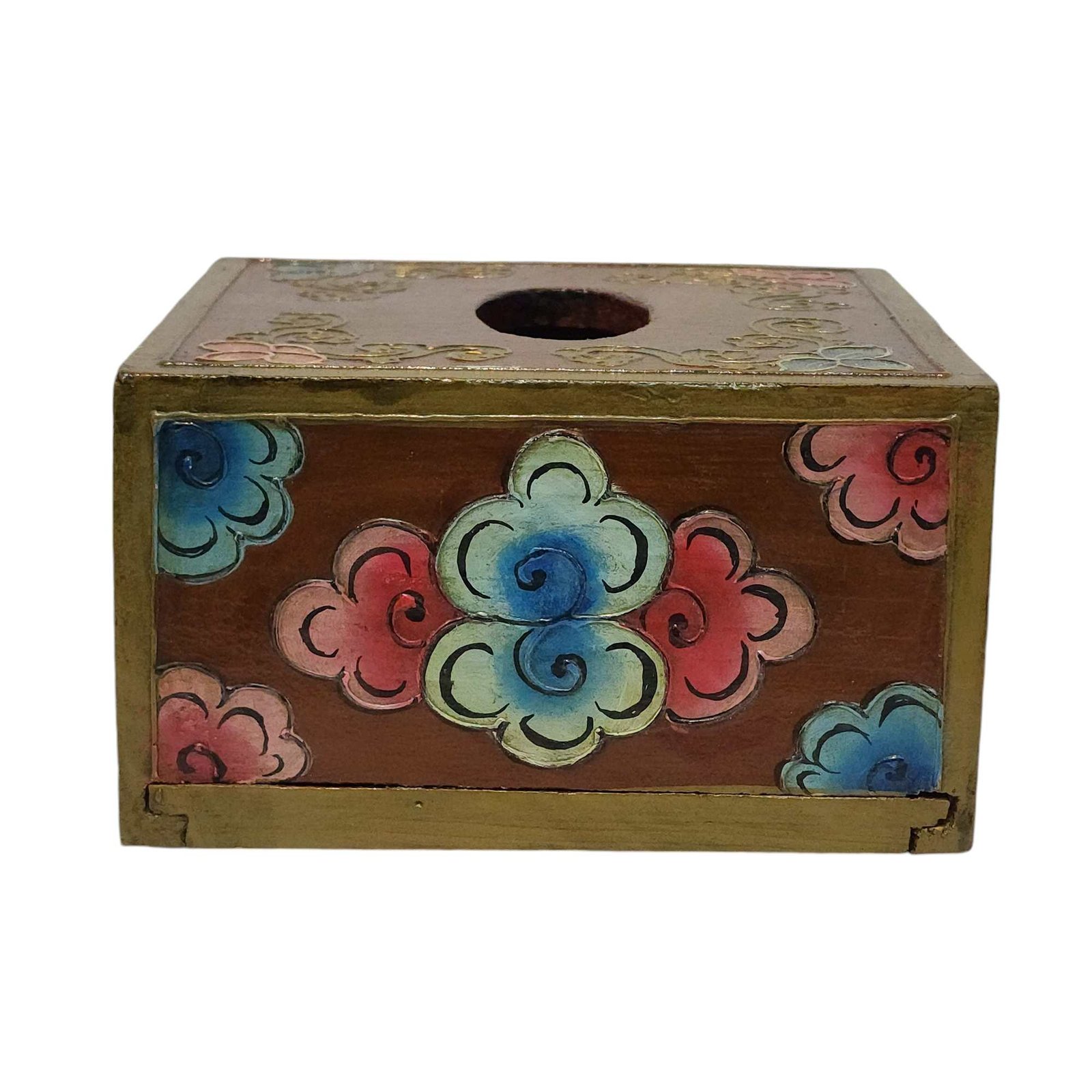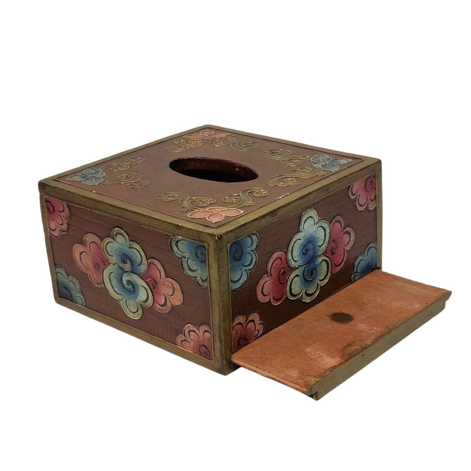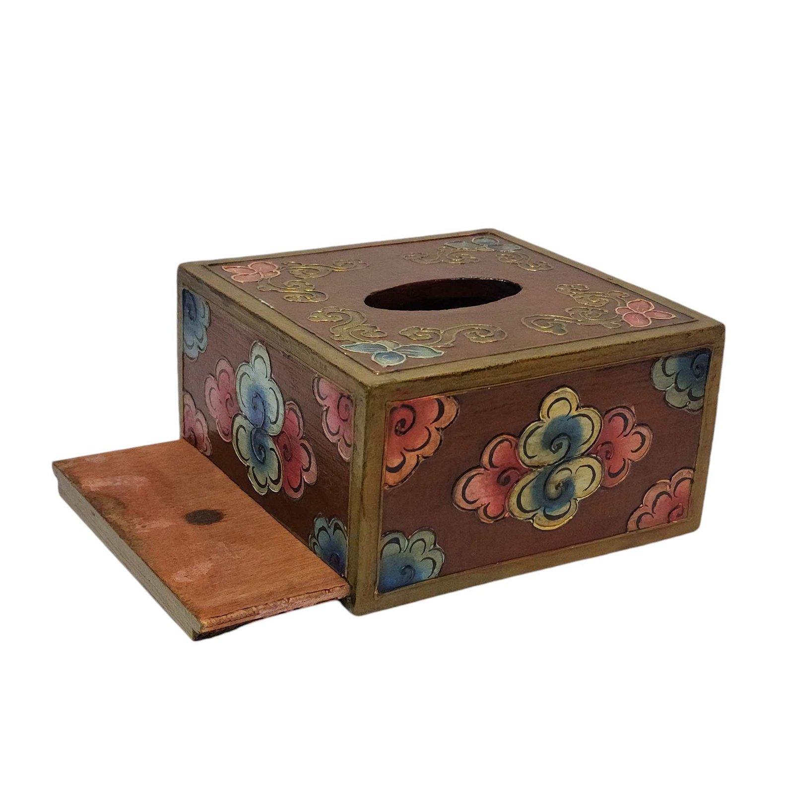 Tibetan Color Palette: Painted in the alluring colors reminiscent of Tibetan art, the tissue holder emanates an aura of serenity and tranquility. The beautiful hues of red, blue, green, and gold evoke a feeling of cultural enchantment, creating a harmonious atmosphere wherever it's placed.
