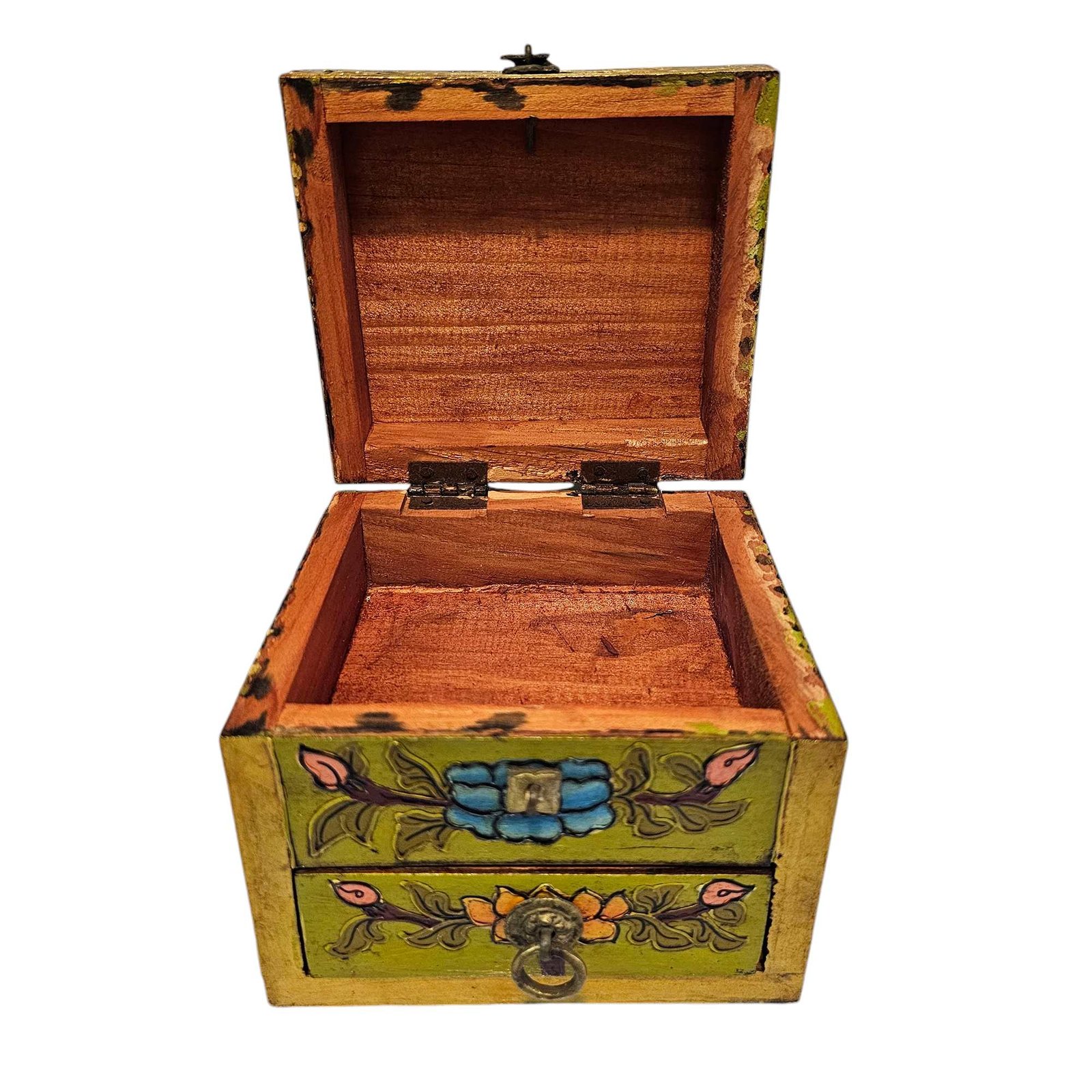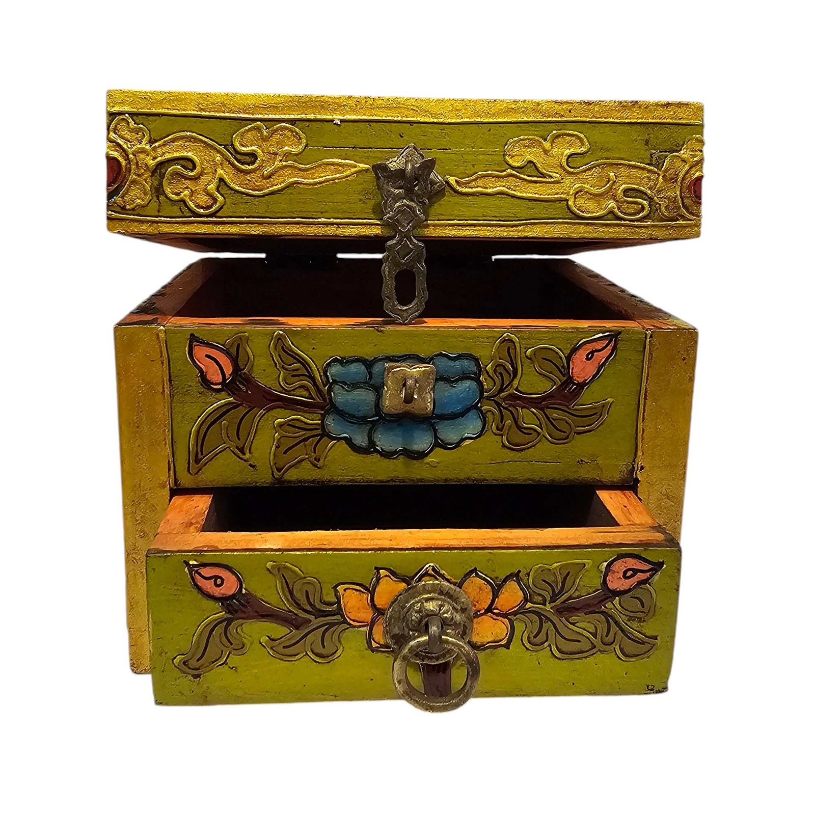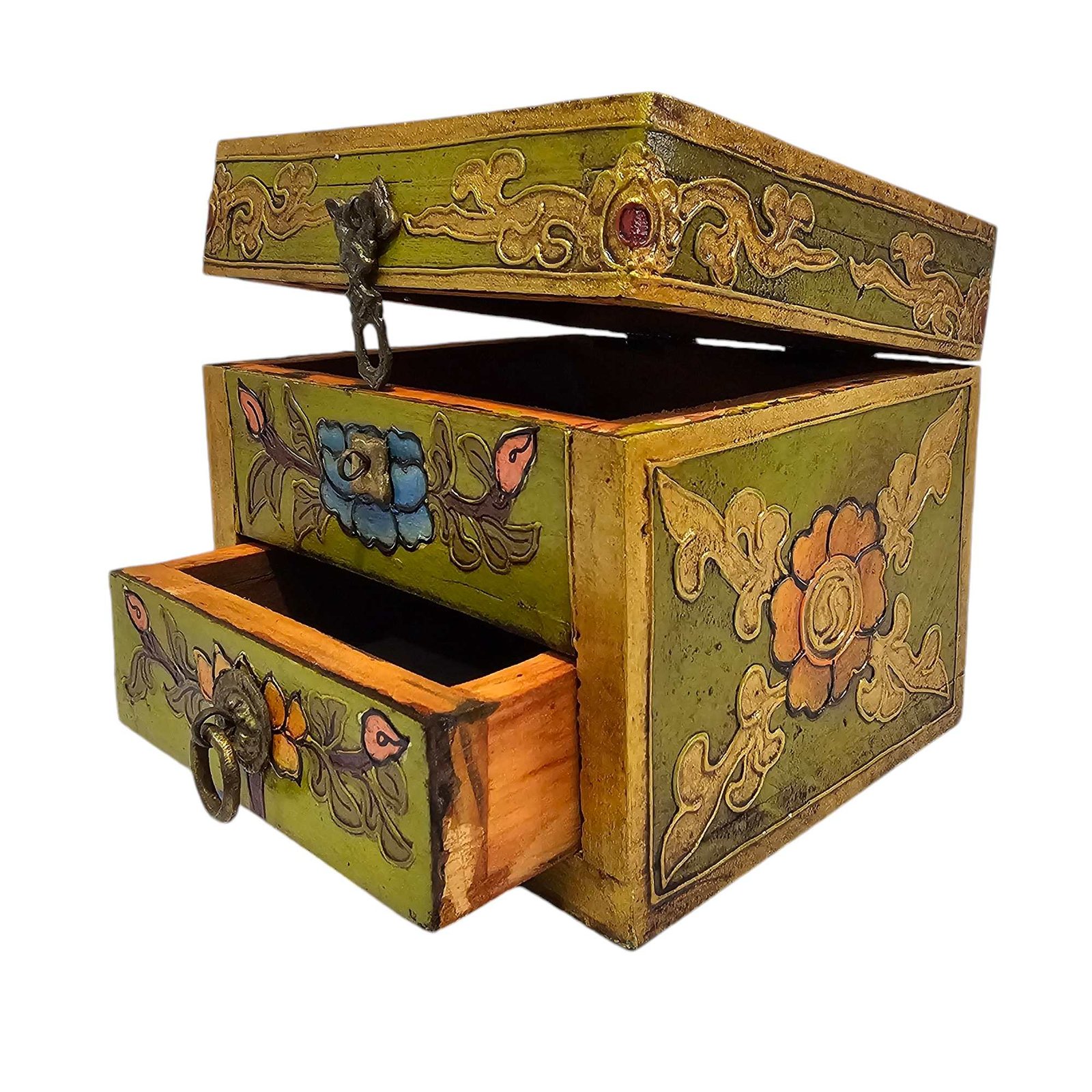 Tibetan Box with One Drawer and Top Opening Cabinet, Painted Green |