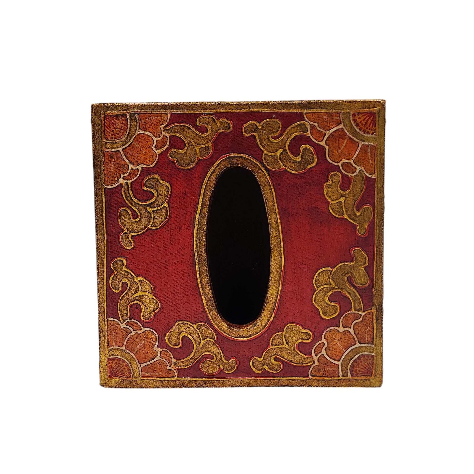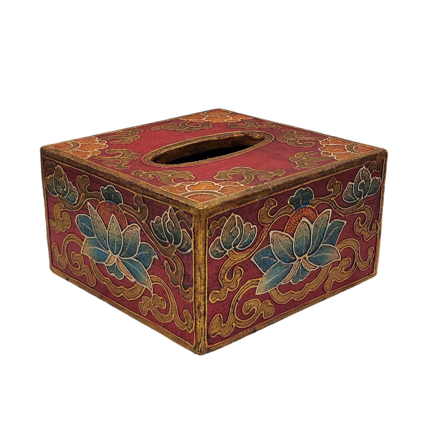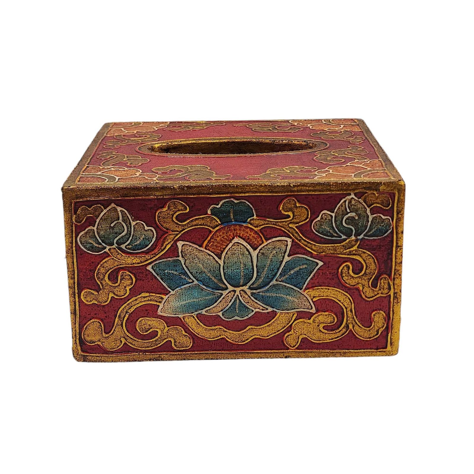 Tibetan Color Palette: Painted in the alluring colors reminiscent of Tibetan art, the tissue holder emanates an aura of serenity and tranquility. The beautiful hues of red, blue, green, and gold evoke a feeling of cultural enchantment, creating a harmonious atmosphere wherever it's placed.