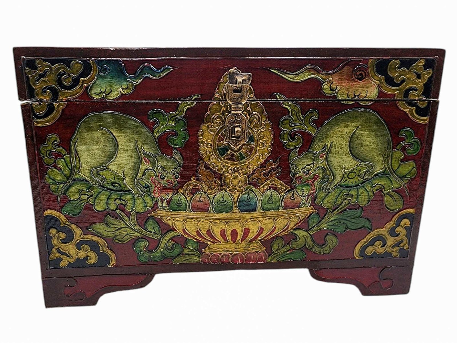 A Tibetan wooden box is a handcrafted storage container made from wood and often adorned with intricate Tibetan motifs and vibrant colors. These boxes are typically crafted by skilled artisans using traditional techniques passed down through generations. The decorations on the box usually include symbols of good fortune, such as lotus flowers, endless knots, dragons, or mythical creatures, and are painted in vivid hues like red, blue, green, and gold. These motifs not only add to the aesthetic appeal but also carry significant cultural and spiritual meanings in Tibetan Buddhism. Read More