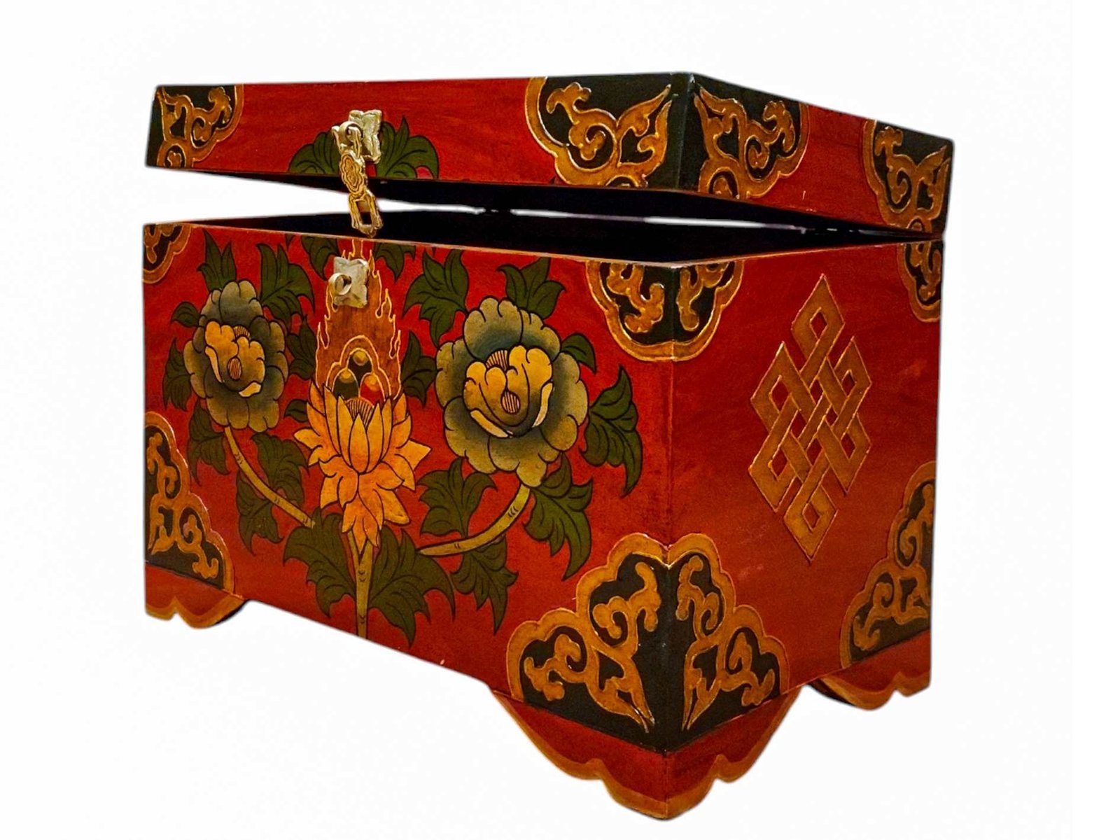 A Tibetan wooden box is a handcrafted storage container made from wood and often adorned with intricate Tibetan motifs and vibrant colors. These boxes are typically crafted by skilled artisans using traditional techniques passed down through generations. The decorations on the box usually include symbols of good fortune, such as lotus flowers, endless knots, dragons, or mythical creatures, and are painted in vivid hues like red, blue, green, and gold. These motifs not only add to the aesthetic appeal but also carry significant cultural and spiritual meanings in Tibetan Buddhism. Read More