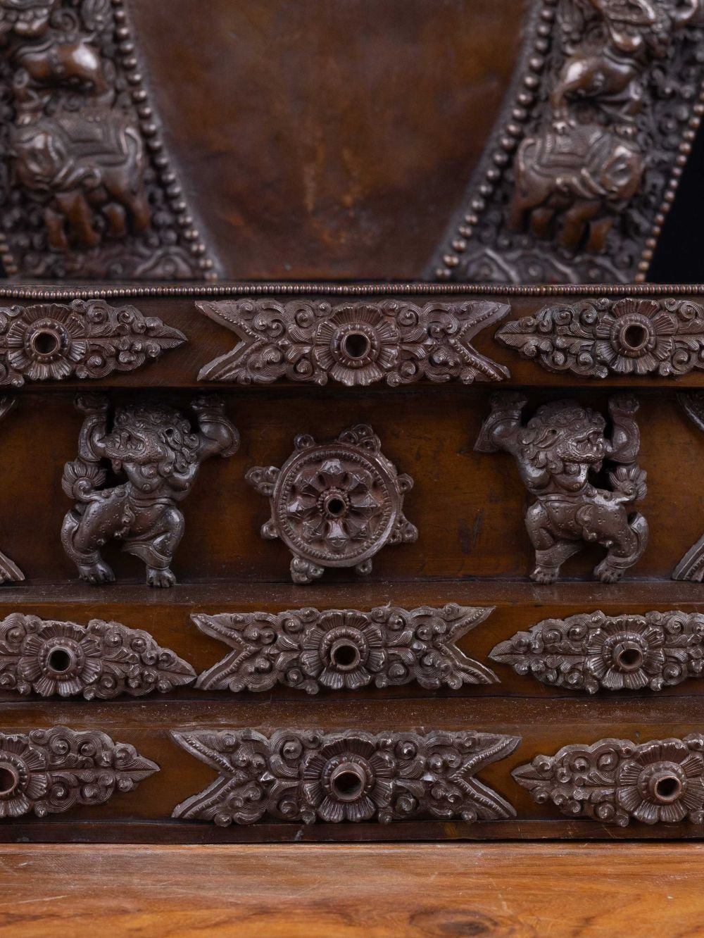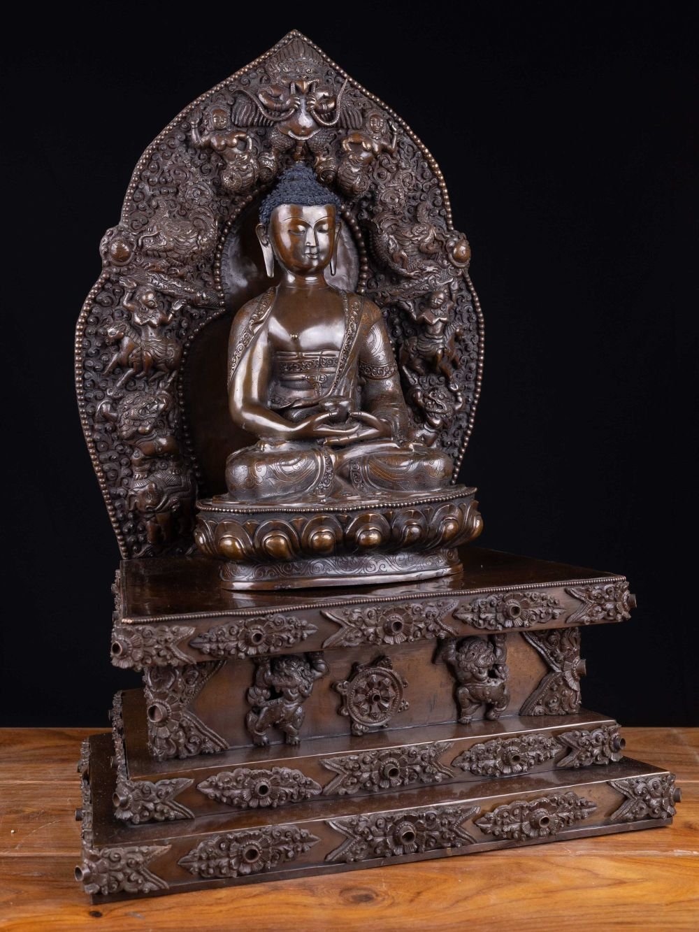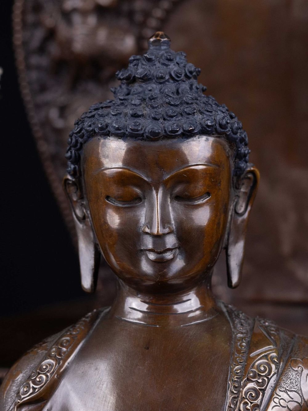 This Amitabha Buddha has been meticulously treated with a chocolate color antique patina. The intention behind this patina is to replicate the appearance of a copper statue that has gracefully aged over a century. Unlike a simple coat of paint, this patina is not applied superficially and is designed to endure. It undergoes an artificial oxidation process that adds depth and character, while also serving as a protective layer against natural oxidation.