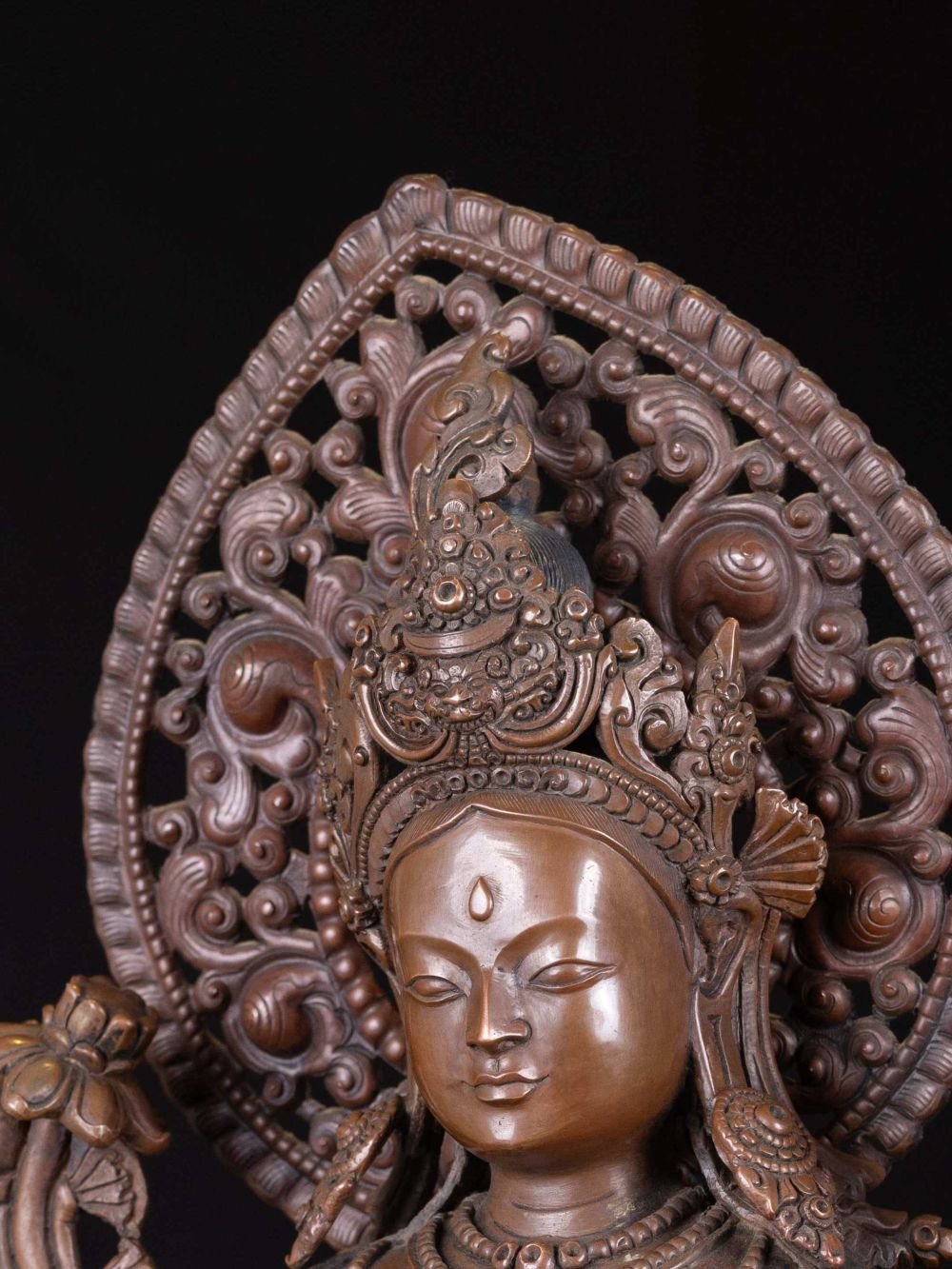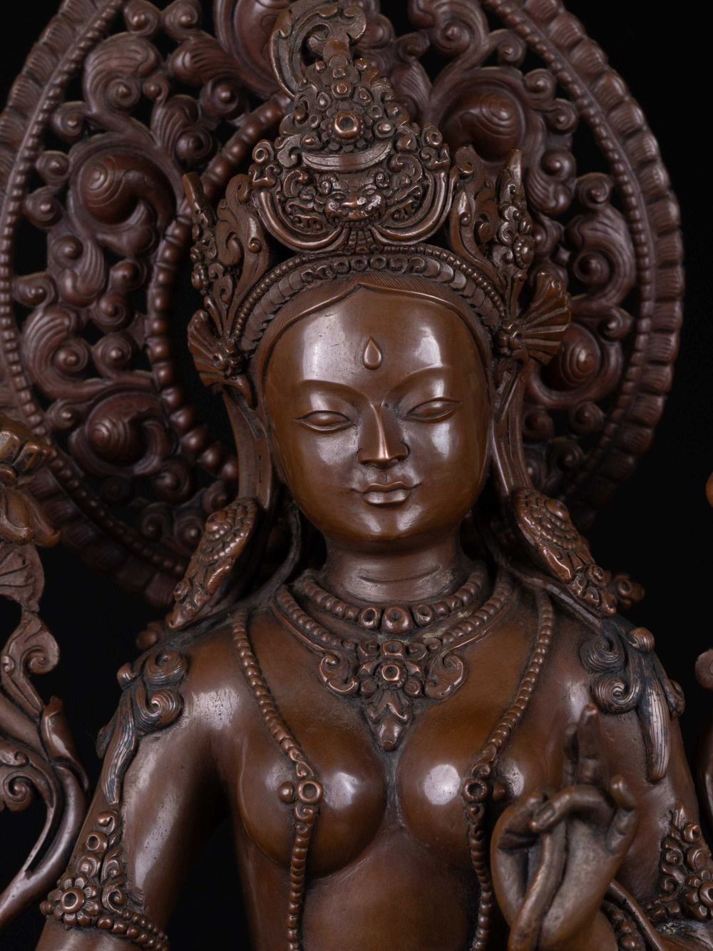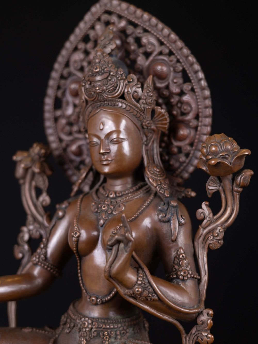 This Green Tara has been meticulously treated with a chocolate color antique patina. The intention behind this patina is to replicate the appearance of a copper statue that has gracefully aged over a century. Unlike a simple coat of paint, this patina is not applied superficially and is designed to endure. It undergoes an artificial oxidation process that adds depth and character, while also serving as a protective layer against natural oxidation.