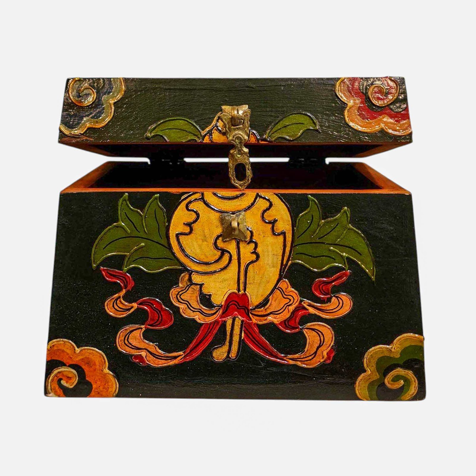 A Tibetan wooden box is a handcrafted storage container made from wood and often adorned with intricate Tibetan motifs and vibrant colors. These boxes are typically crafted by skilled artisans using traditional techniques passed down through generations. The decorations on the box usually include symbols of good fortune, such as lotus flowers, endless knots, dragons, or mythical creatures, and are painted in vivid hues like red, blue, green, and gold. These motifs not only add to the aesthetic appeal but also carry significant cultural and spiritual meanings in Tibetan Buddhism. Read More