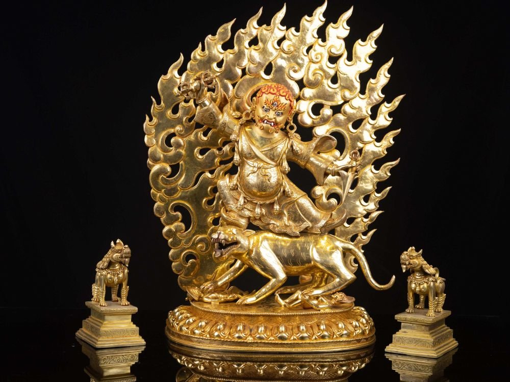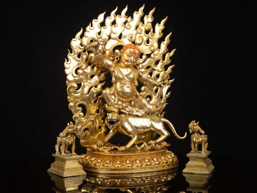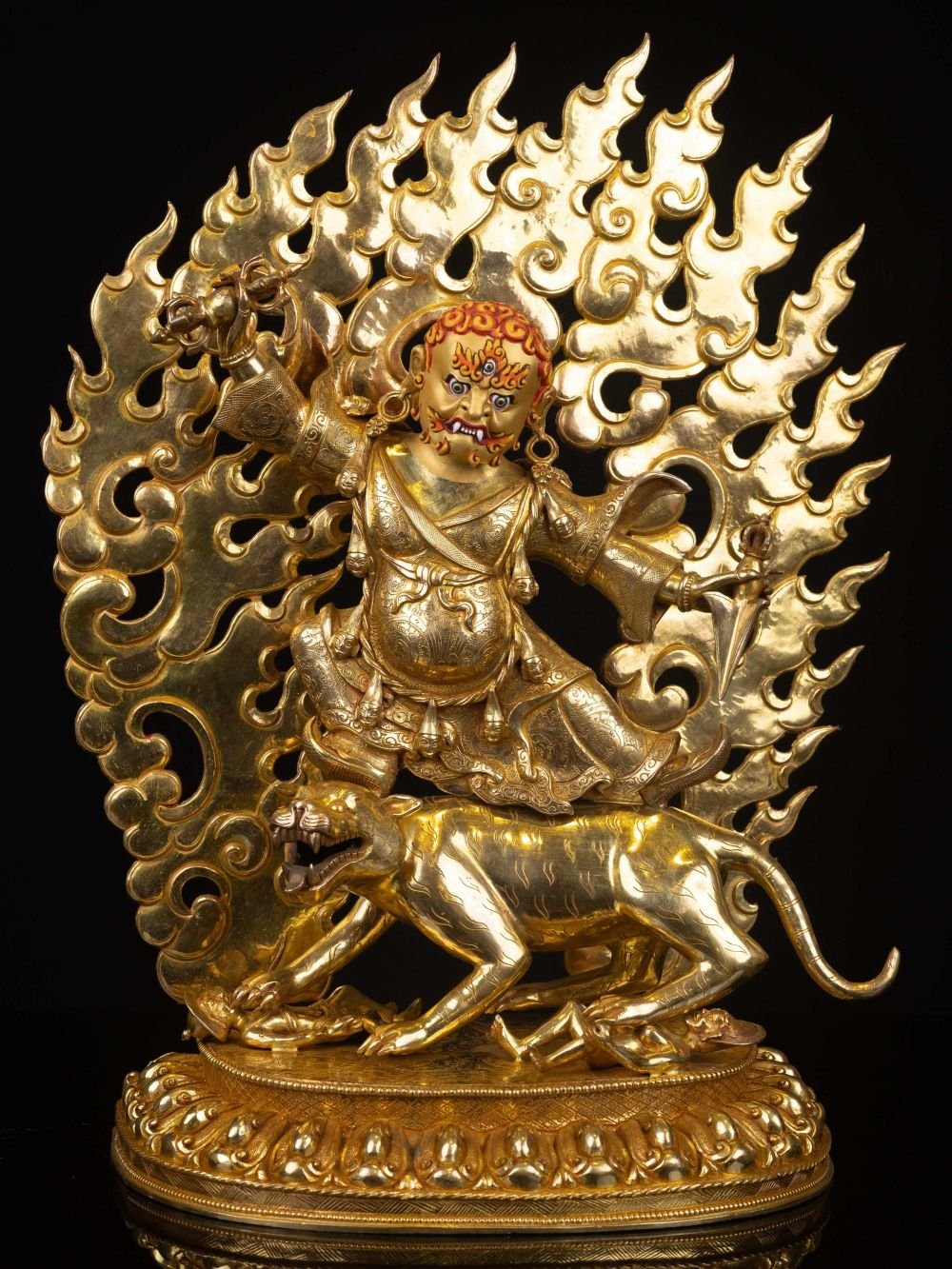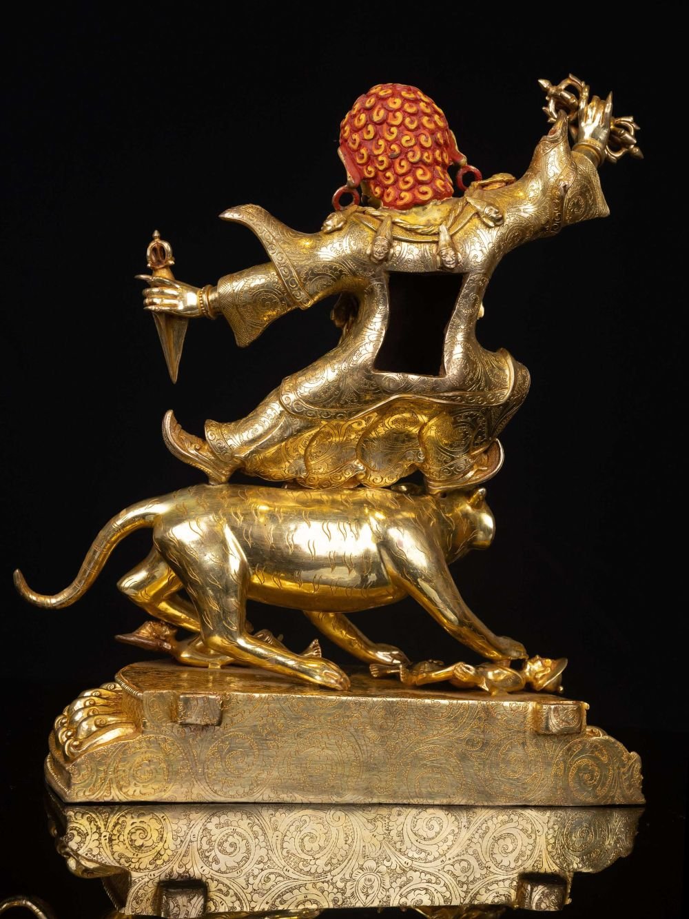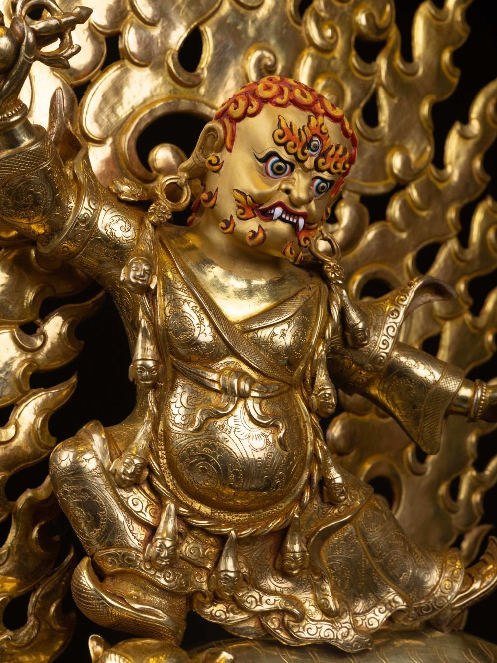 The face of Dorje Drolo is painted with gold to enhance its significant features, particularly the eyes, and lips. This detailed painting is essential as it brings forth the crucial attributes of the expression of eyes and lips that metal carving alone cannot capture.