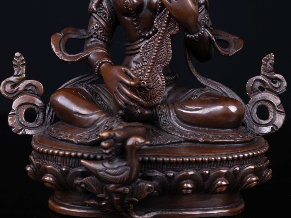 This Saraswati has been meticulously treated with a chocolate color antique patina. The intention behind this patina is to replicate the appearance of a copper statue that has gracefully aged over a century. Unlike a simple coat of paint, this patina is not applied superficially and is designed to endure. It undergoes an artificial oxidation process that adds depth and character, while also serving as a protective layer against natural oxidation.