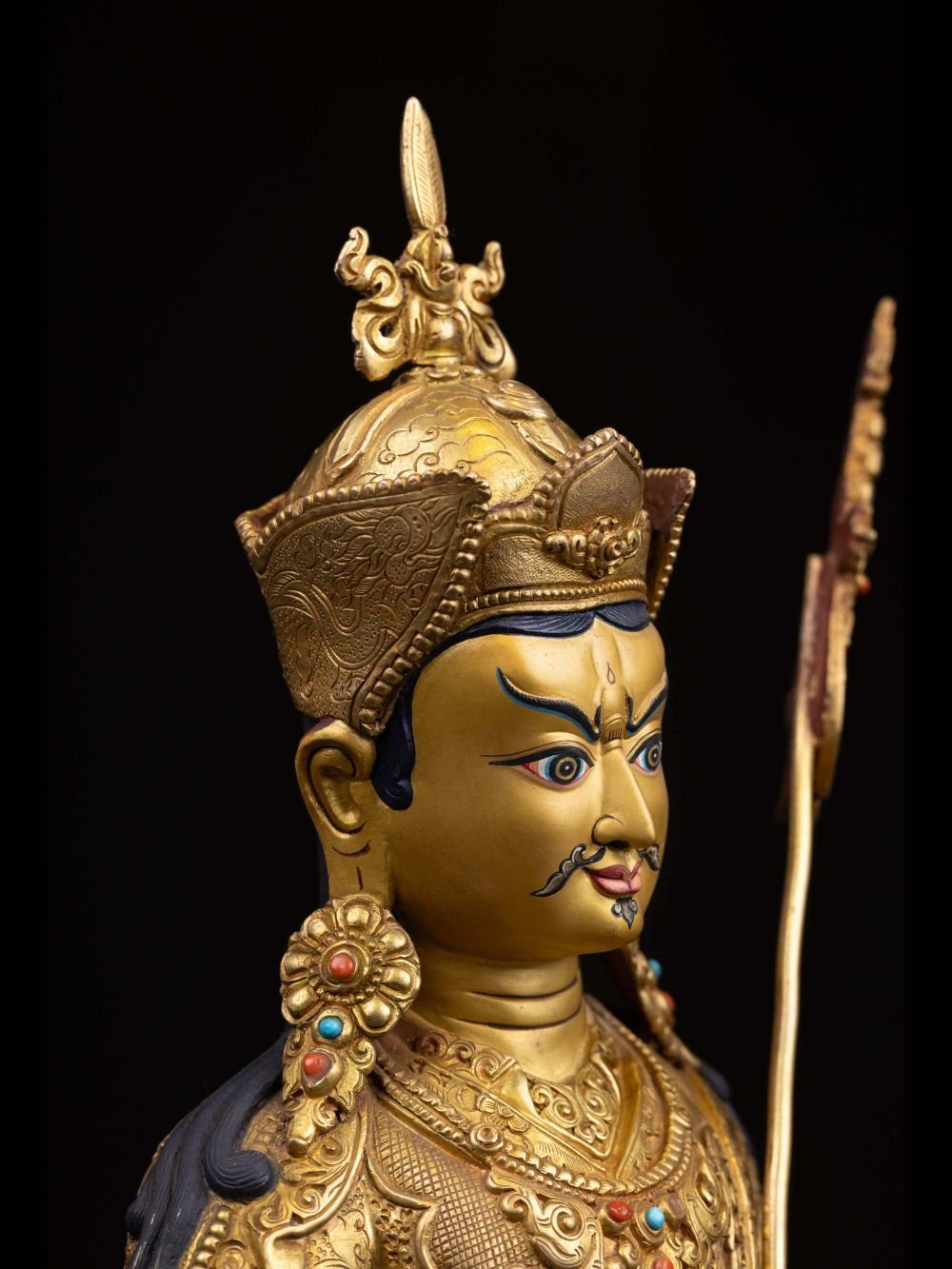 The face of Padmasambhava is painted with gold to enhance its significant features, particularly the eyes, and lips. This detailed painting is essential as it brings forth the crucial attributes of the expression of eyes and lips that metal carving alone cannot capture.