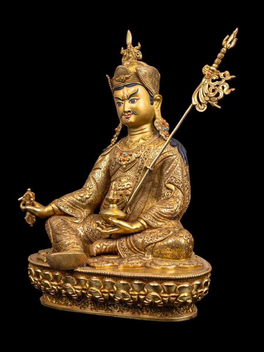 This Padmasambhava is finished with full gold plating. also known as mercury gold plating or fire gold plating. This traditional technique involves the application of a genuine layer of gold onto the Padmasambhava. Referred to as mercury gold plating, it is considered the correct and authentic form of gold plating in Nepal. Despite being more expensive than electroplating, this traditional mercury gold plating is gaining popularity again in Nepal. People are drawn to its authenticity, longevity, and the unmatched beauty it brings to the Padmasambhava. The resurgence of interest in this traditional form of gold plating reflects a growing appreciation for the craftsmanship and cultural heritage of Nepal Read More