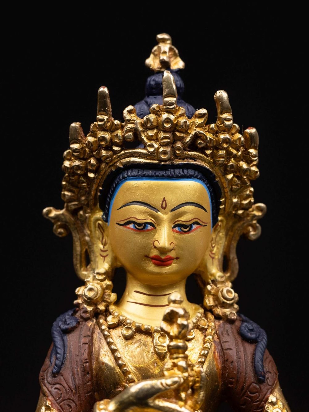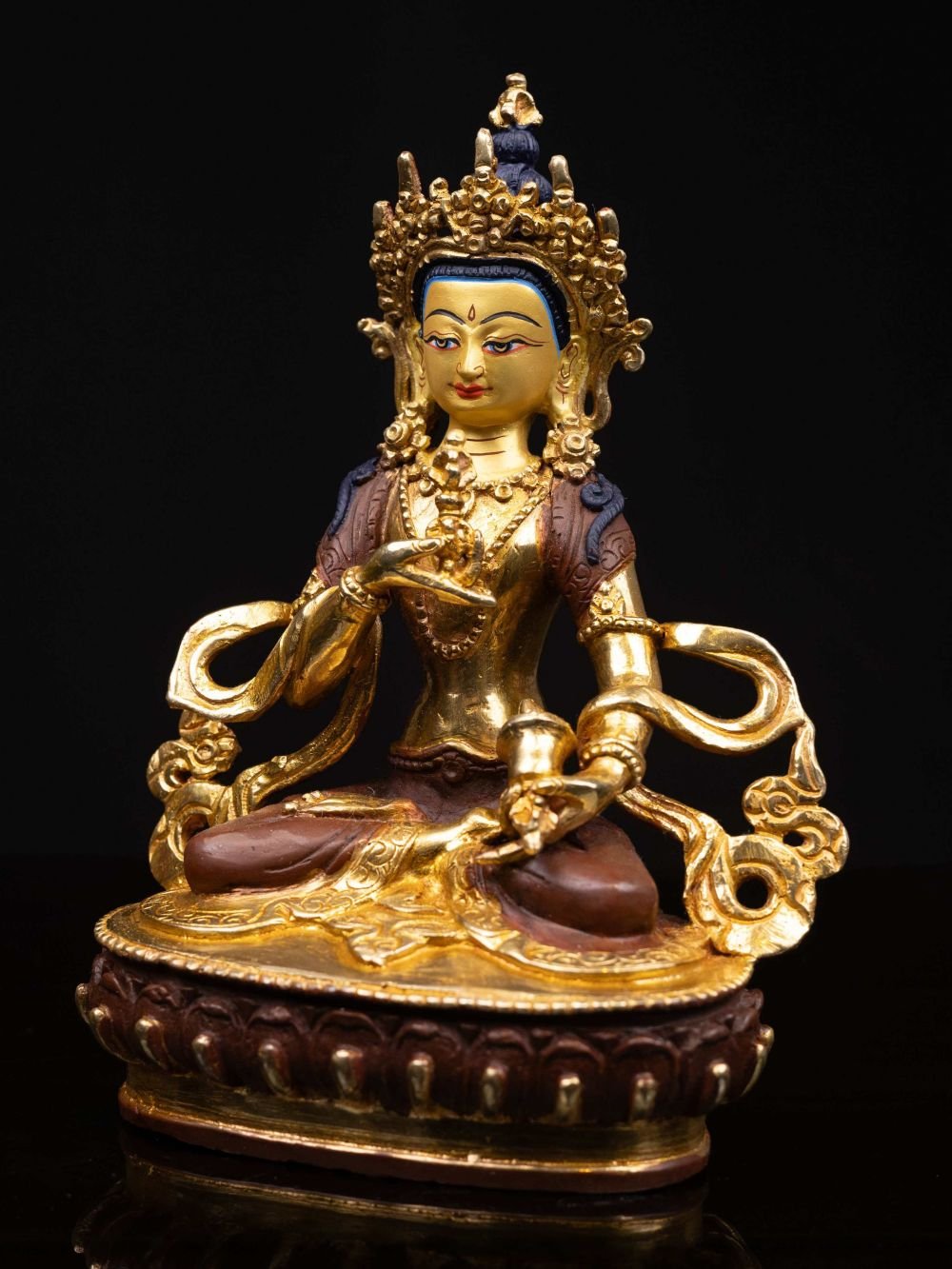 The face of Vajrasattva is painted with gold to enhance its significant features, particularly the eyes, and lips. This detailed painting is essential as it brings forth the crucial attributes of the expression of eyes and lips that metal carving alone cannot capture.