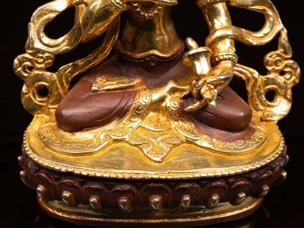 This Vajrasattva has a Partly gold-plated finish. Partly fire gold gilding, a common practice in Nepali handicrafts. This technique is skillfully employed by artisans to create intricate designs on various metal objects, including statues, jewelry, and decorative items. Through a process, a mask or resist is applied to safeguard specific areas from the gold plating. The object is then subjected to high temperatures, allowing the gold to beautifully adhere to exposed surfaces using a combination of heat and pressure.