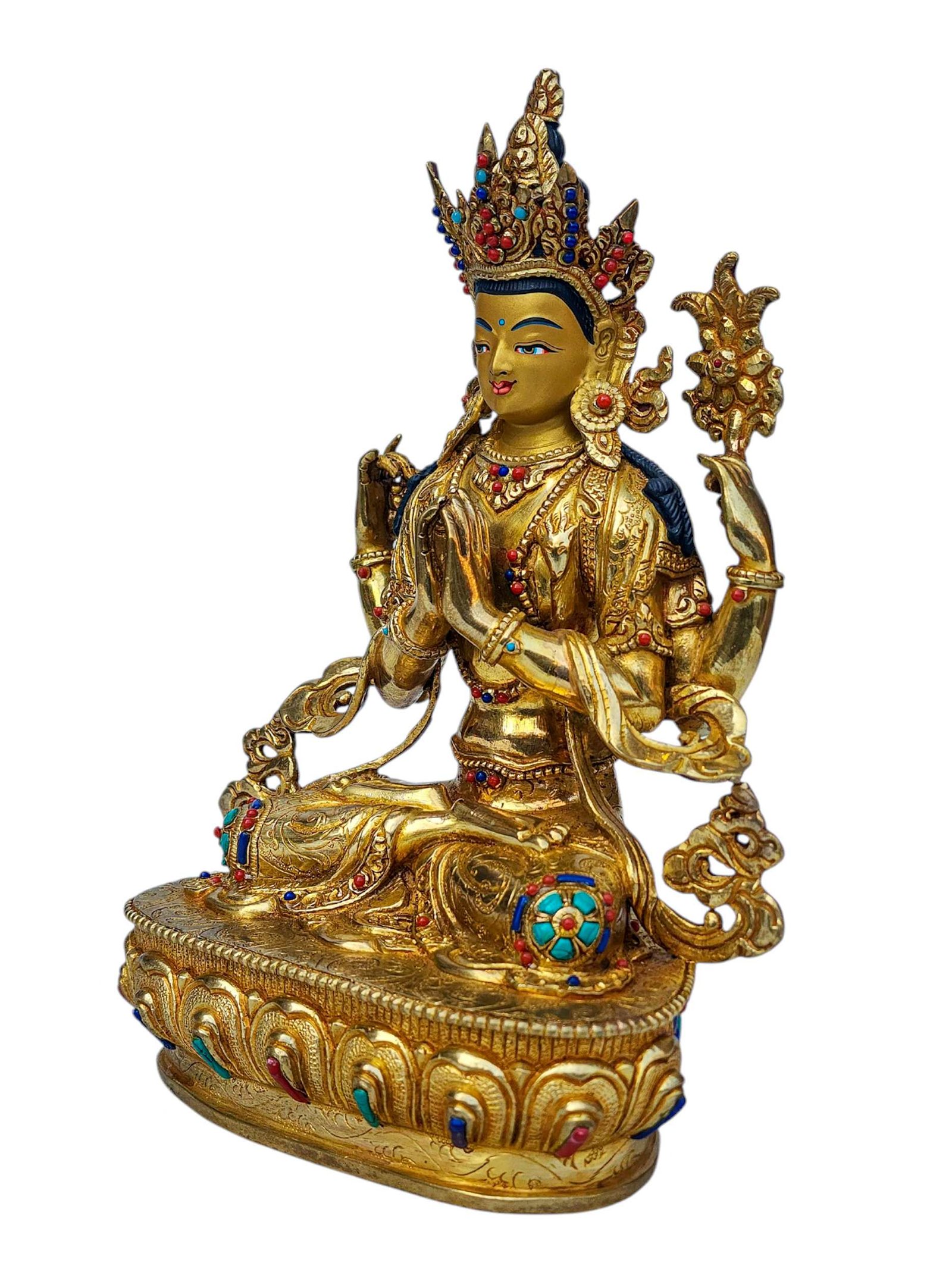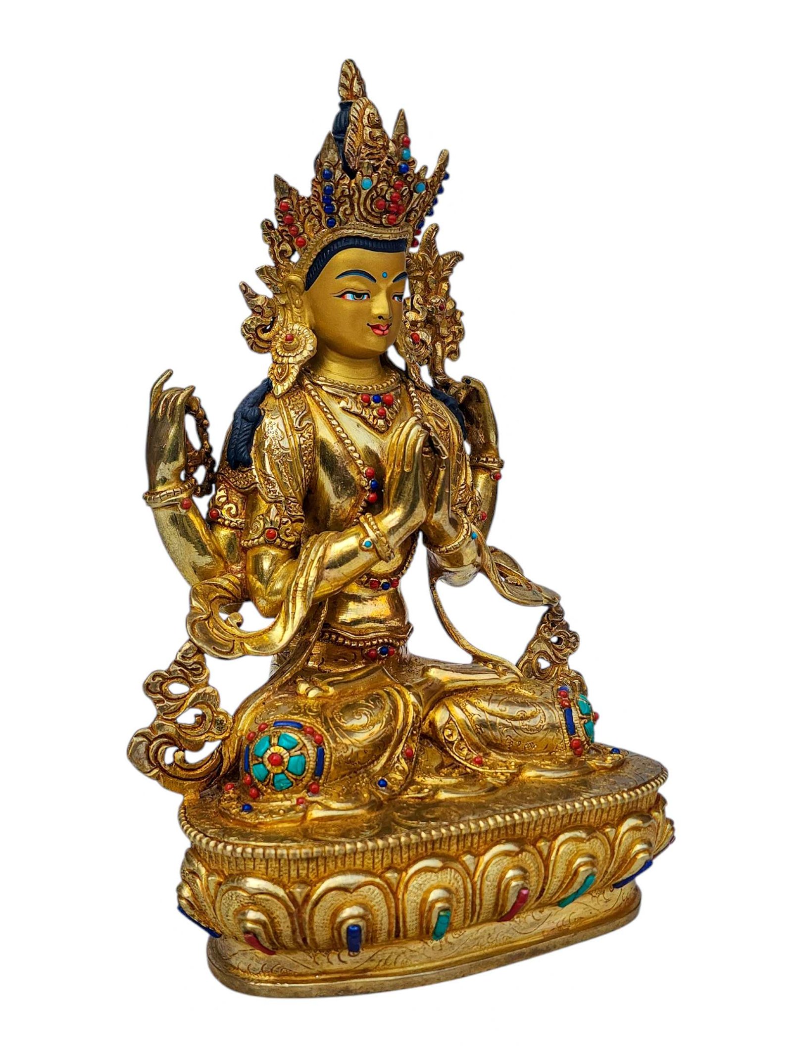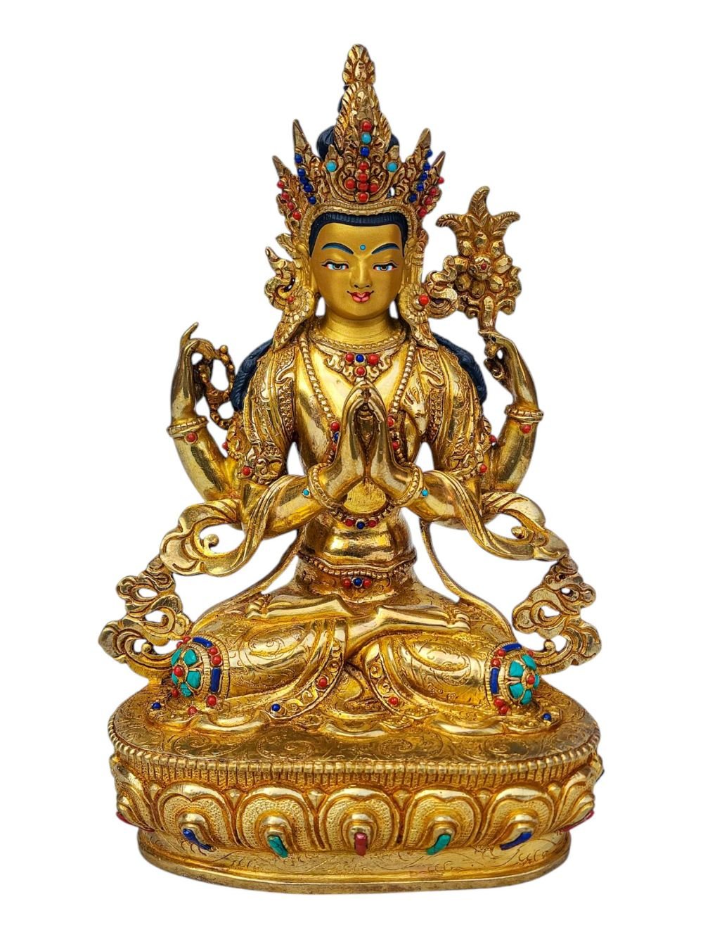 Chenrezig, Buddhist Handmade Statue, Full Gold Plated, Face Painted, Stone Setting and High Quality , Bodhisattva of Compassion, Protector of All Beings