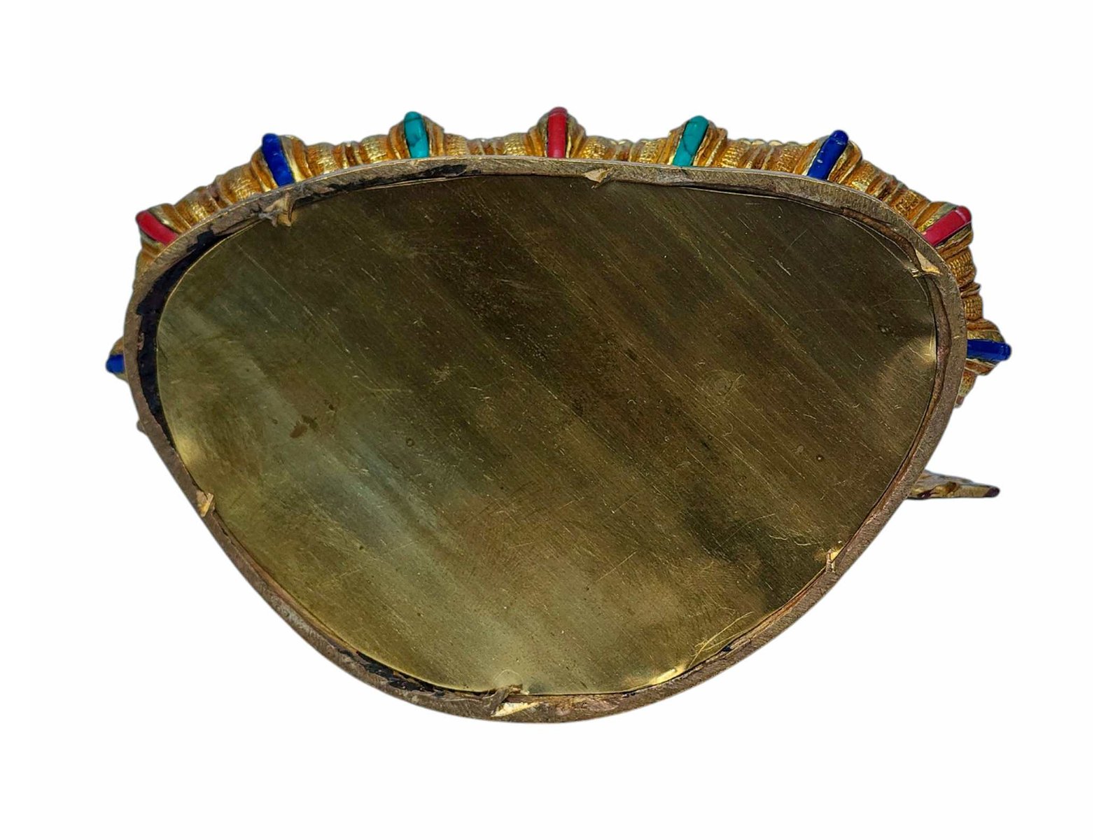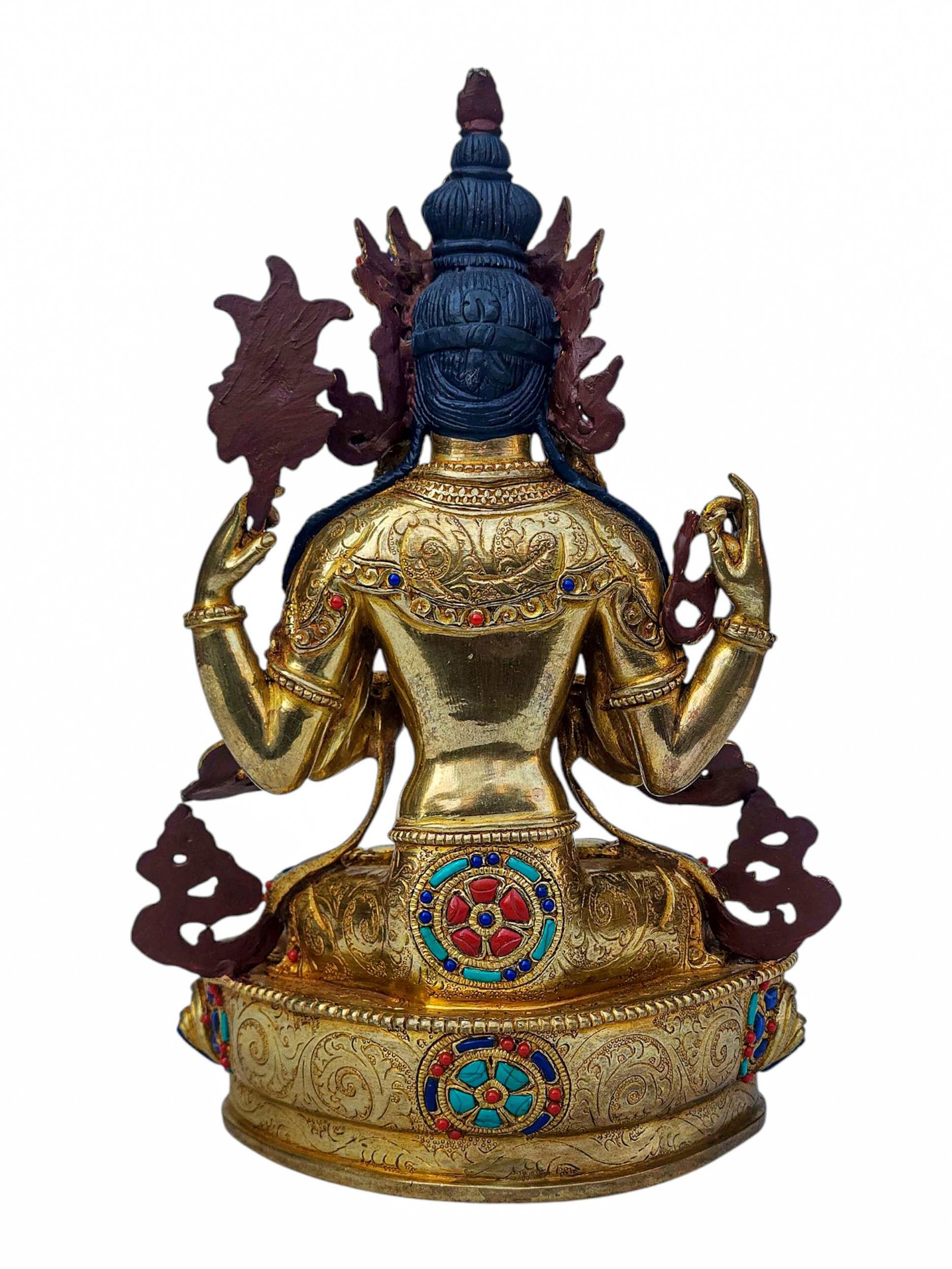 The Chenrezig is adorned with an exquisite array of semi-precious stones, including turquoise, coral, and lapis lazuli. These stones are carefully selected and meticulously placed on the Chenrezig's surface, adding a touch of opulence and enhancing its overall beauty. Each stone is thoughtfully positioned using a high-quality adhesive, ensuring secure and long-lasting attachment. The vibrant colors and unique patterns of the stones create a captivating contrast against the backdrop of the Chenrezig, elevating its visual appeal and making it truly eye-catching. Read More