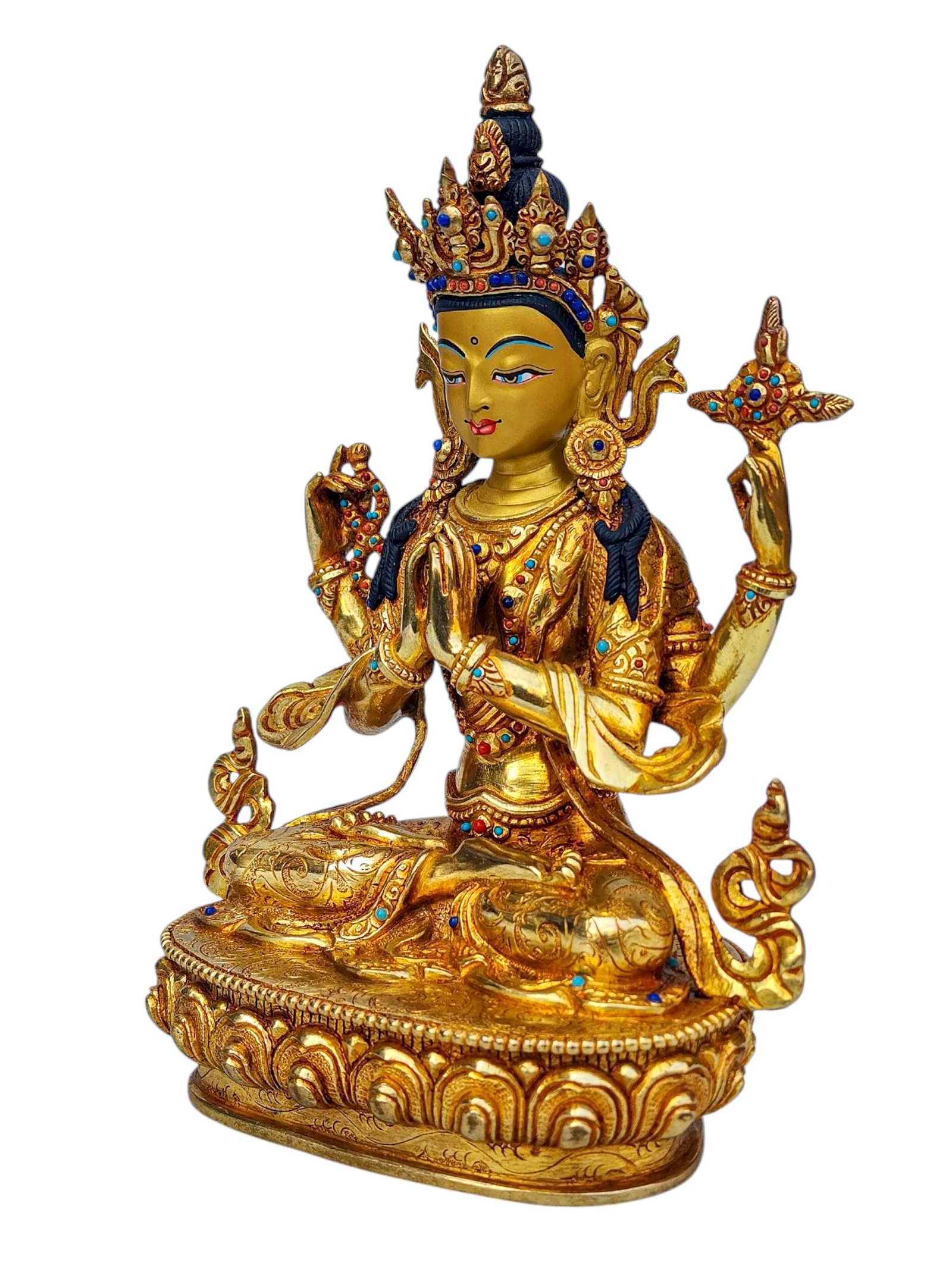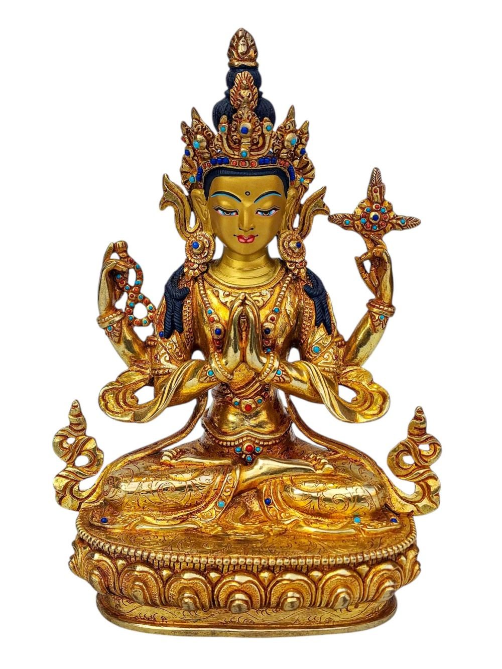 Chenrezig, Buddhist Handmade Statue, Full Gold Plated, Face Painted, Stone Setting and High Quality , Bodhisattva of Compassion, Protector of All Beings
