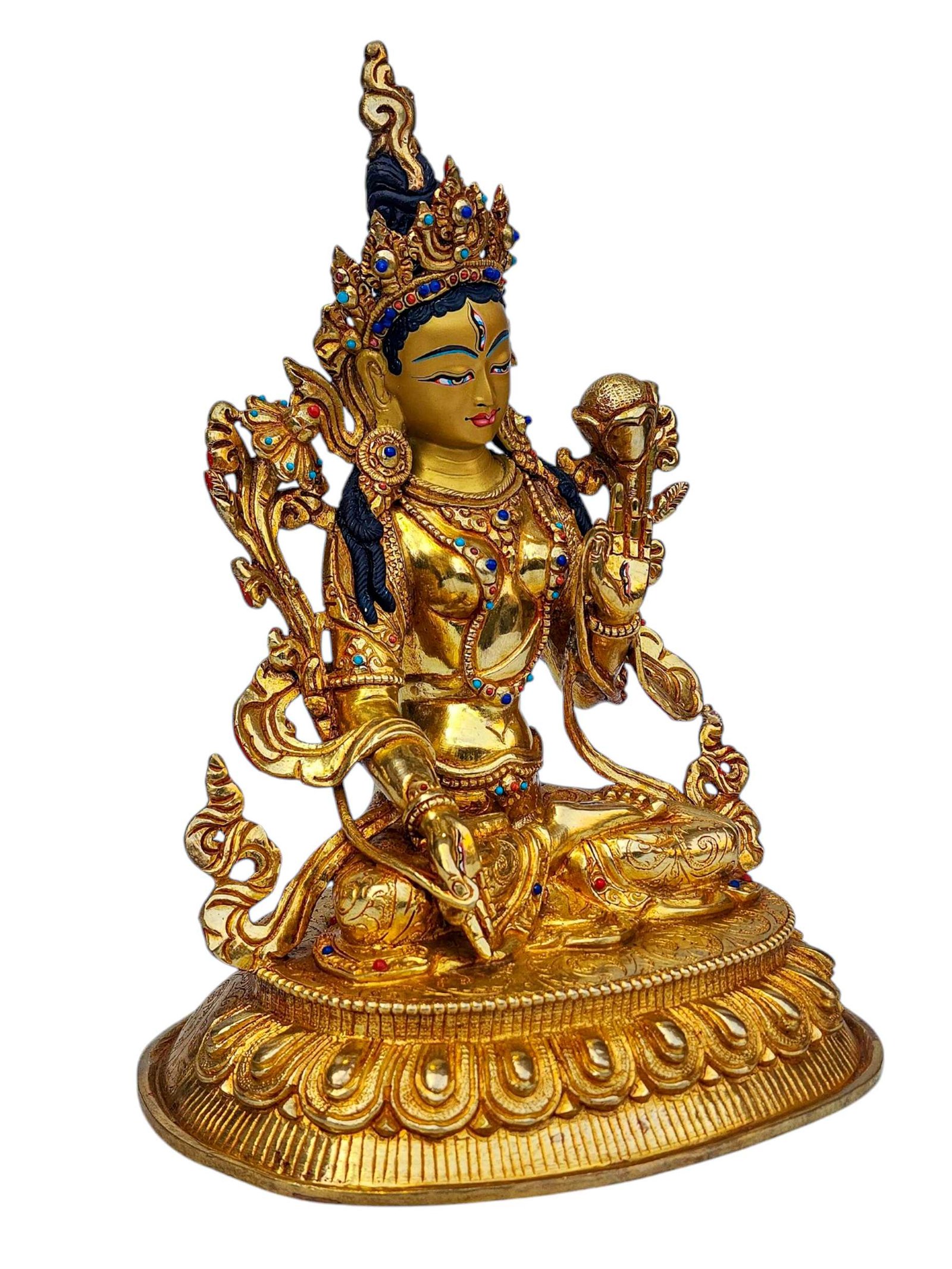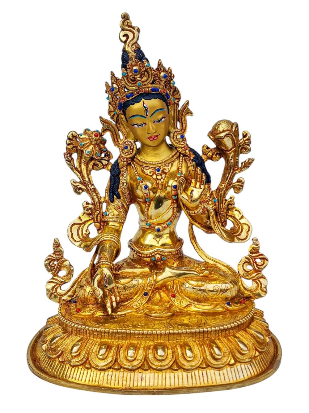 White Tara, Buddhist Handmade Statue, Full Gold Plated, Face Painted, Stone Setting and High Quality , Goddess of longevity, healing, and serene compassion