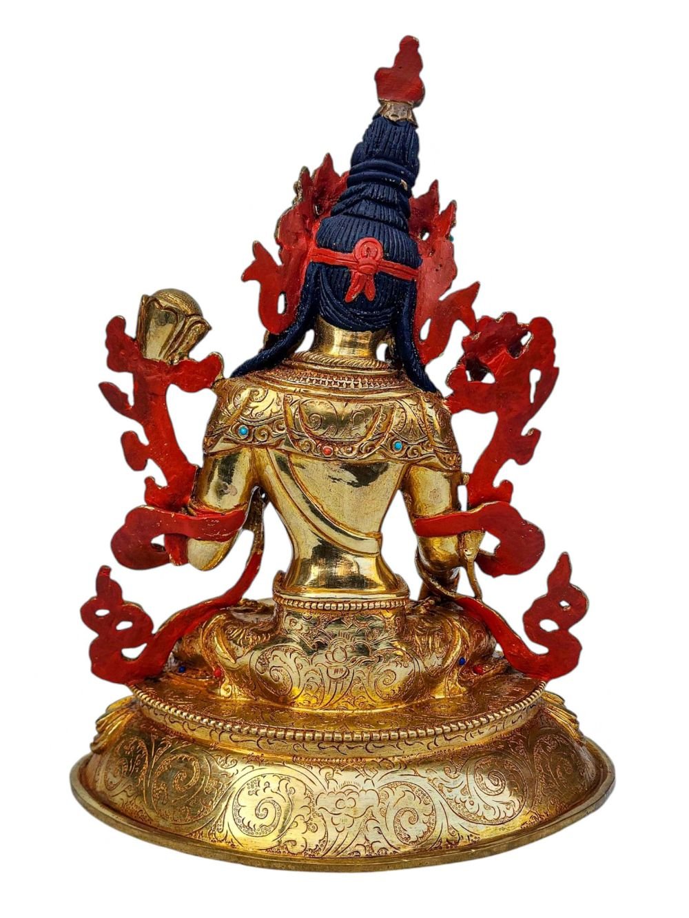 This White Tara is finished with full gold plating. also known as mercury gold plating or fire gold plating. This traditional technique involves the application of a genuine layer of gold onto the White Tara. Referred to as mercury gold plating, it is considered the correct and authentic form of gold plating in Nepal. Despite being more expensive than electroplating, this traditional mercury gold plating is gaining popularity again in Nepal. People are drawn to its authenticity, longevity, and the unmatched beauty it brings to the White Tara. The resurgence of interest in this traditional form of gold plating reflects a growing appreciation for the craftsmanship and cultural heritage of Nepal Read More