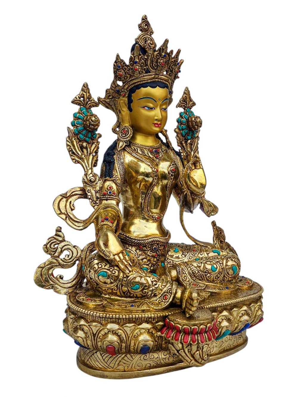Green Tara, Buddhist Handmade Statue, Full Gold Plated, Face Painted, Stone Setting and High Quality , Goddess of Compassion, Protection, and Swift Action
