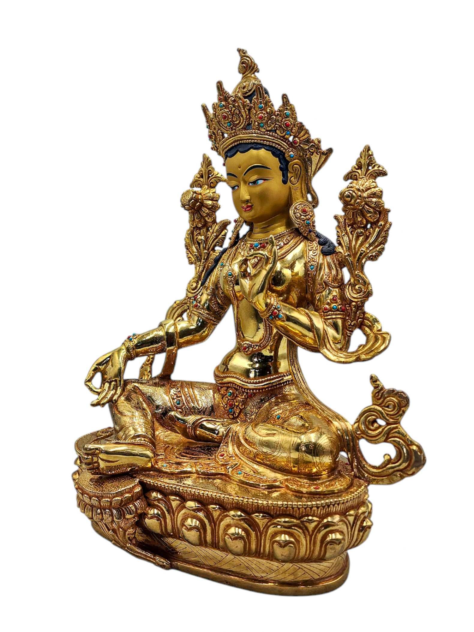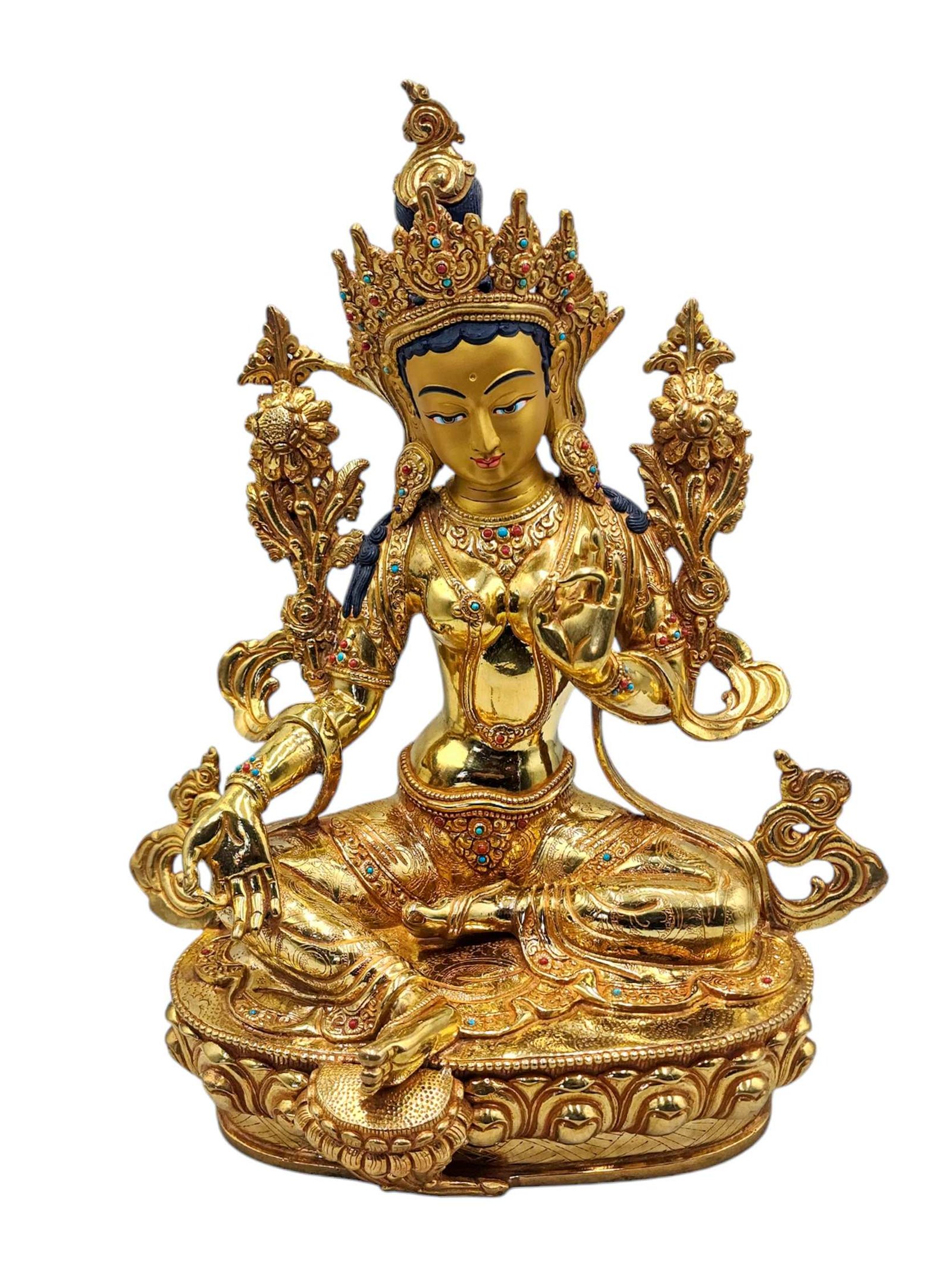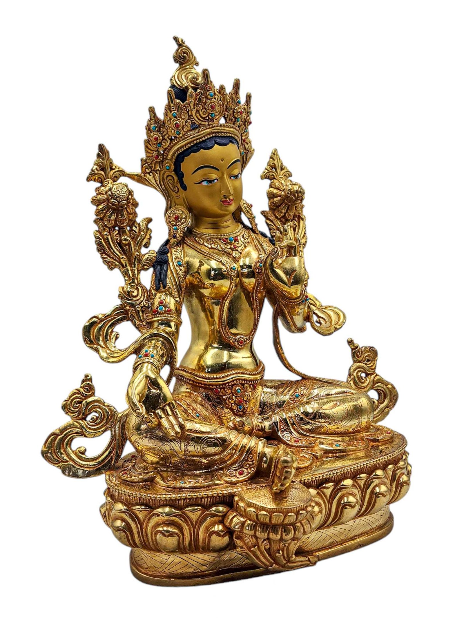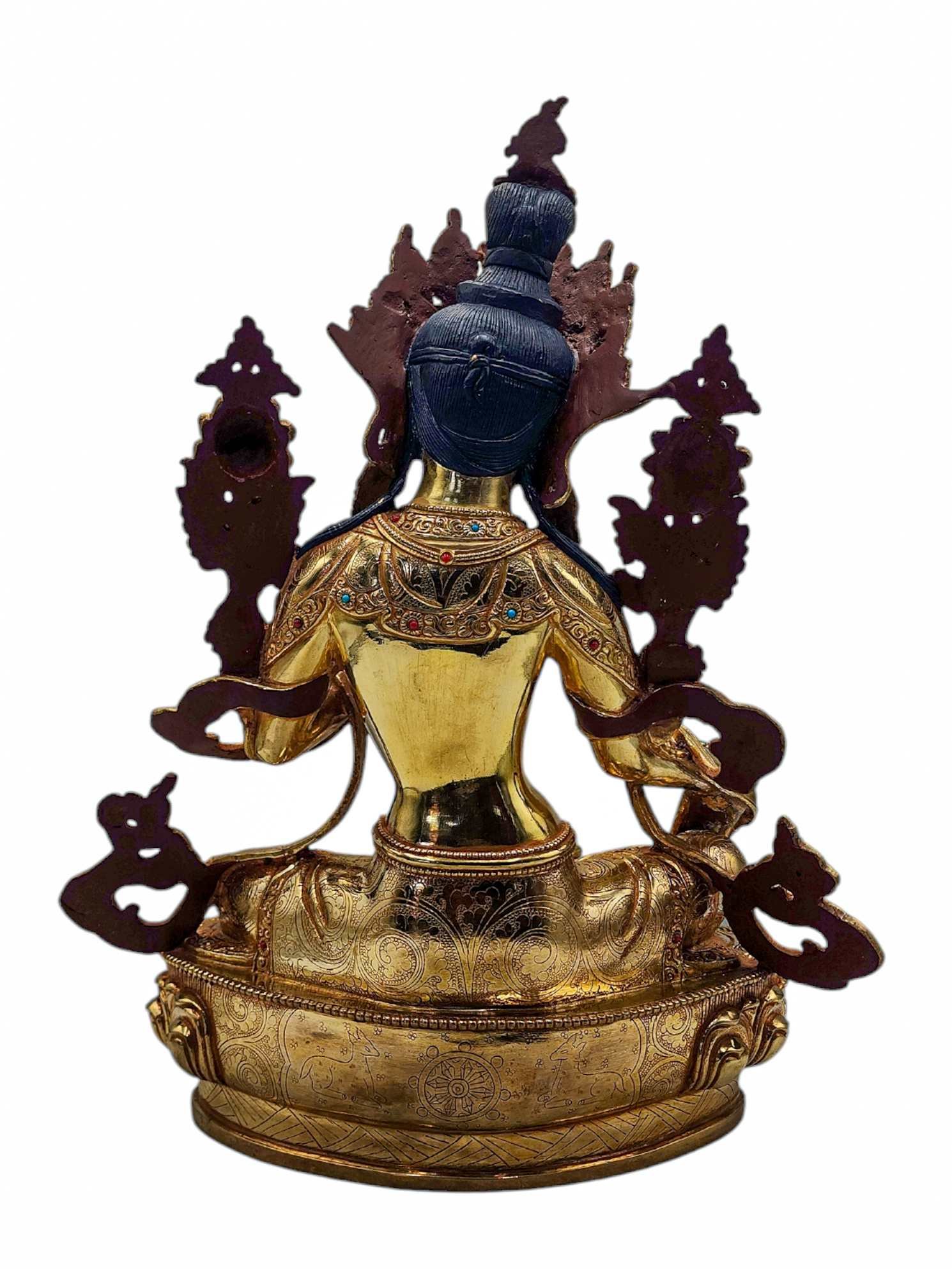Green Tara, Buddhist Handmade Statue, Full Gold Plated, Face Painted, Stone Setting and High Quality , Goddess of Compassion, Protection, and Swift Action