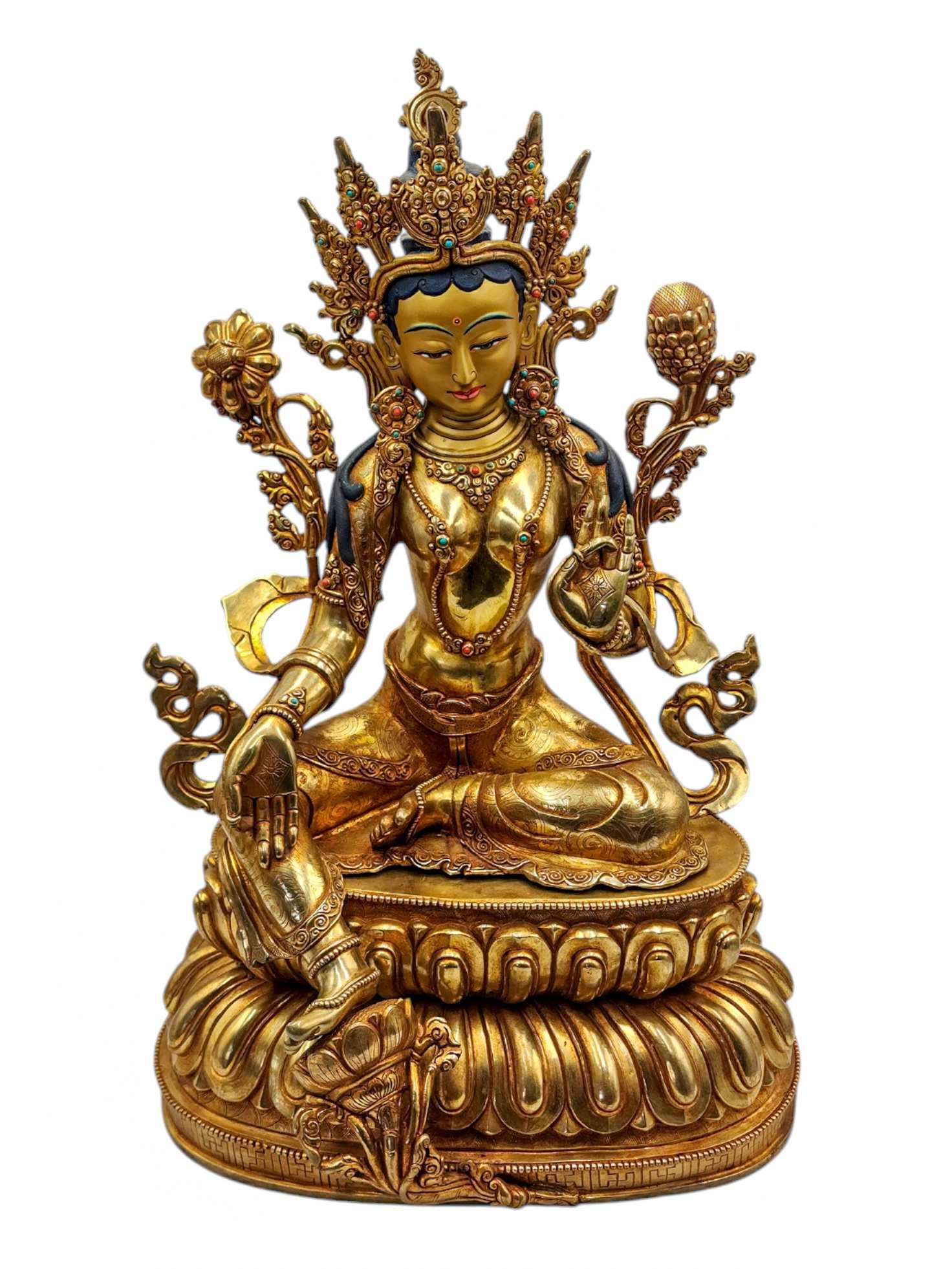 Green Tara Buddhist Handmade Statue with Double Base, Full Gold Plated, Face Painted, High Quality , Goddess of Compassion, Protection, and Swift Action