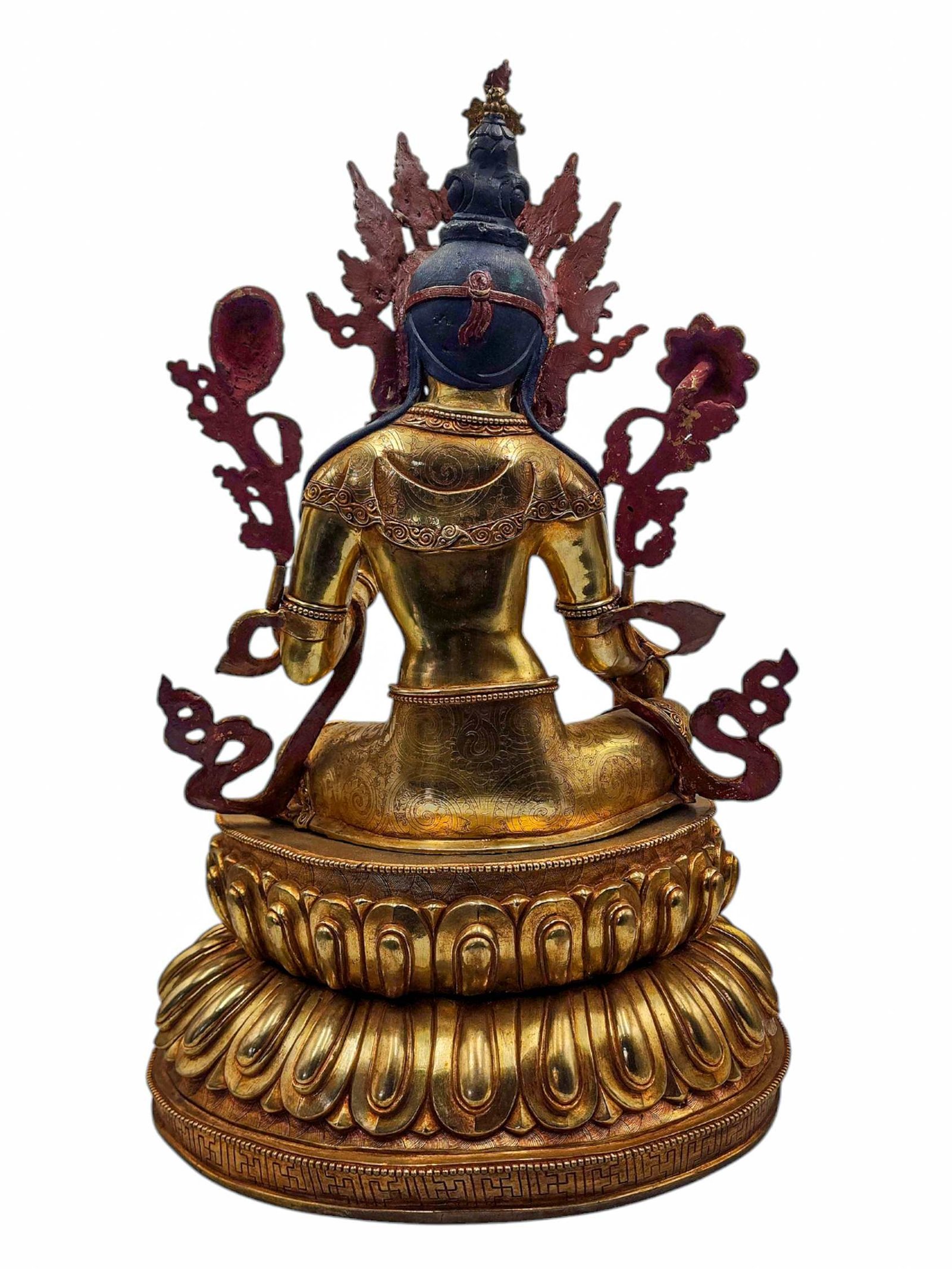 This Green Tara is finished with full gold plating. also known as mercury gold plating or fire gold plating. This traditional technique involves the application of a genuine layer of gold onto the Green Tara. Referred to as mercury gold plating, it is considered the correct and authentic form of gold plating in Nepal. Despite being more expensive than electroplating, this traditional mercury gold plating is gaining popularity again in Nepal. People are drawn to its authenticity, longevity, and the unmatched beauty it brings to the Green Tara. The resurgence of interest in this traditional form of gold plating reflects a growing appreciation for the craftsmanship and cultural heritage of Nepal Read More
