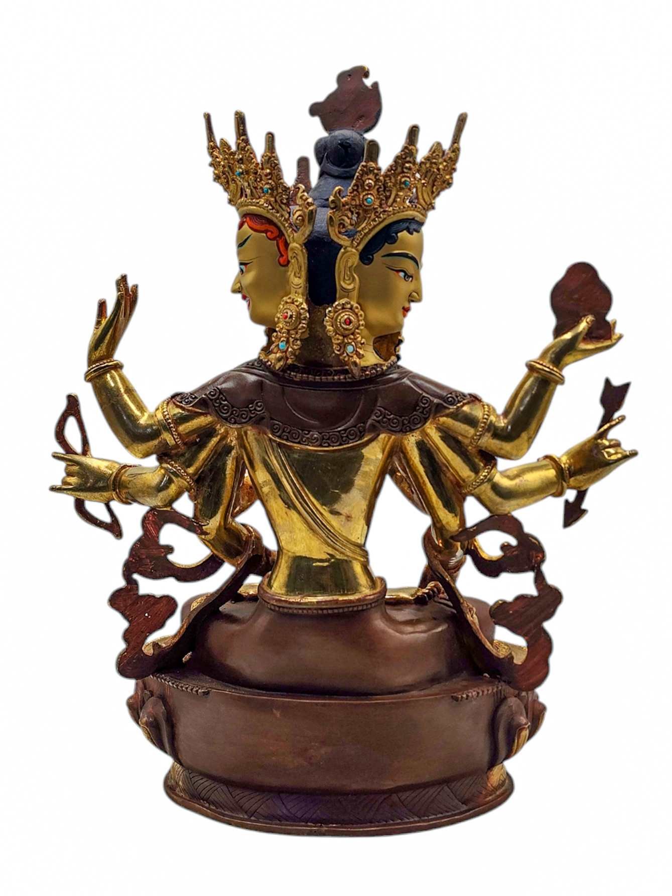 The face of Namgyalma is painted with gold to enhance its significant features, particularly the eyes, and lips. This detailed painting is essential as it brings forth the crucial attributes of the expression of eyes and lips that metal carving alone cannot capture.