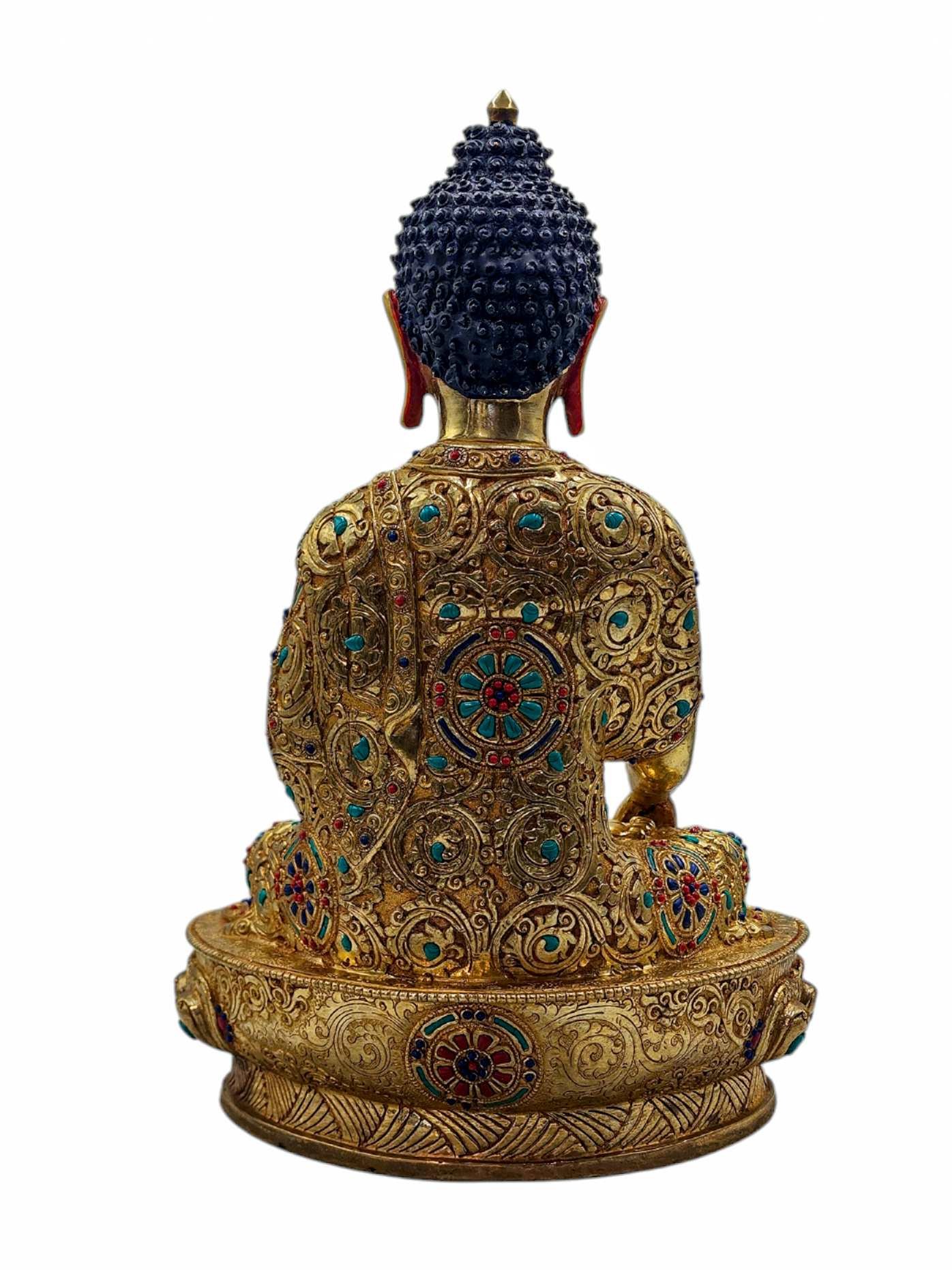 The Shakyamuni Buddha is adorned with an exquisite array of semi-precious stones, including turquoise, coral, and lapis lazuli. These stones are carefully selected and meticulously placed on the Shakyamuni Buddha's surface, adding a touch of opulence and enhancing its overall beauty. Each stone is thoughtfully positioned using a high-quality adhesive, ensuring secure and long-lasting attachment. The vibrant colors and unique patterns of the stones create a captivating contrast against the backdrop of the Shakyamuni Buddha, elevating its visual appeal and making it truly eye-catching. Read More