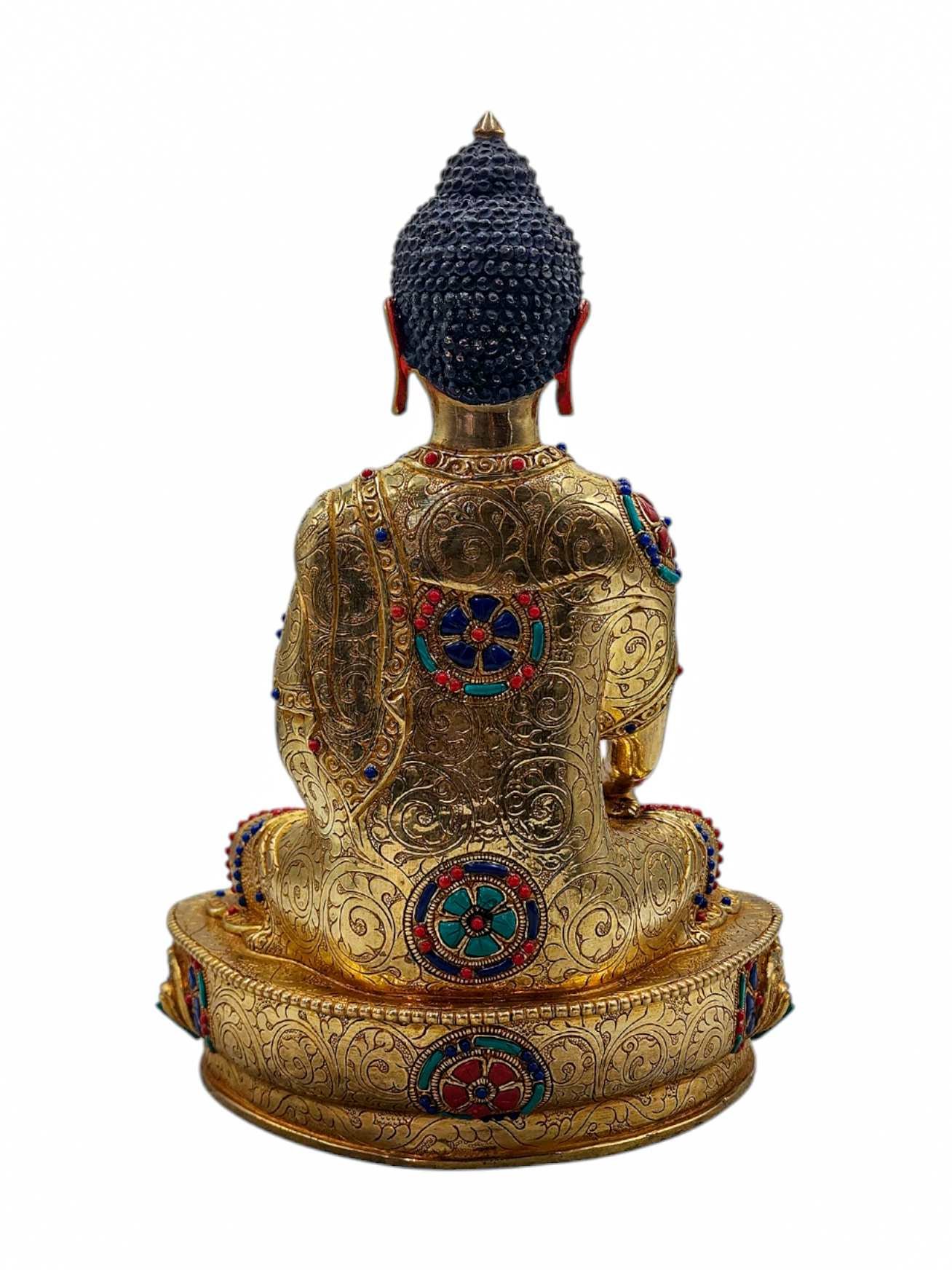The Shakyamuni Buddha is adorned with an exquisite array of semi-precious stones, including turquoise, coral, and lapis lazuli. These stones are carefully selected and meticulously placed on the Shakyamuni Buddha's surface, adding a touch of opulence and enhancing its overall beauty. Each stone is thoughtfully positioned using a high-quality adhesive, ensuring secure and long-lasting attachment. The vibrant colors and unique patterns of the stones create a captivating contrast against the backdrop of the Shakyamuni Buddha, elevating its visual appeal and making it truly eye-catching. Read More