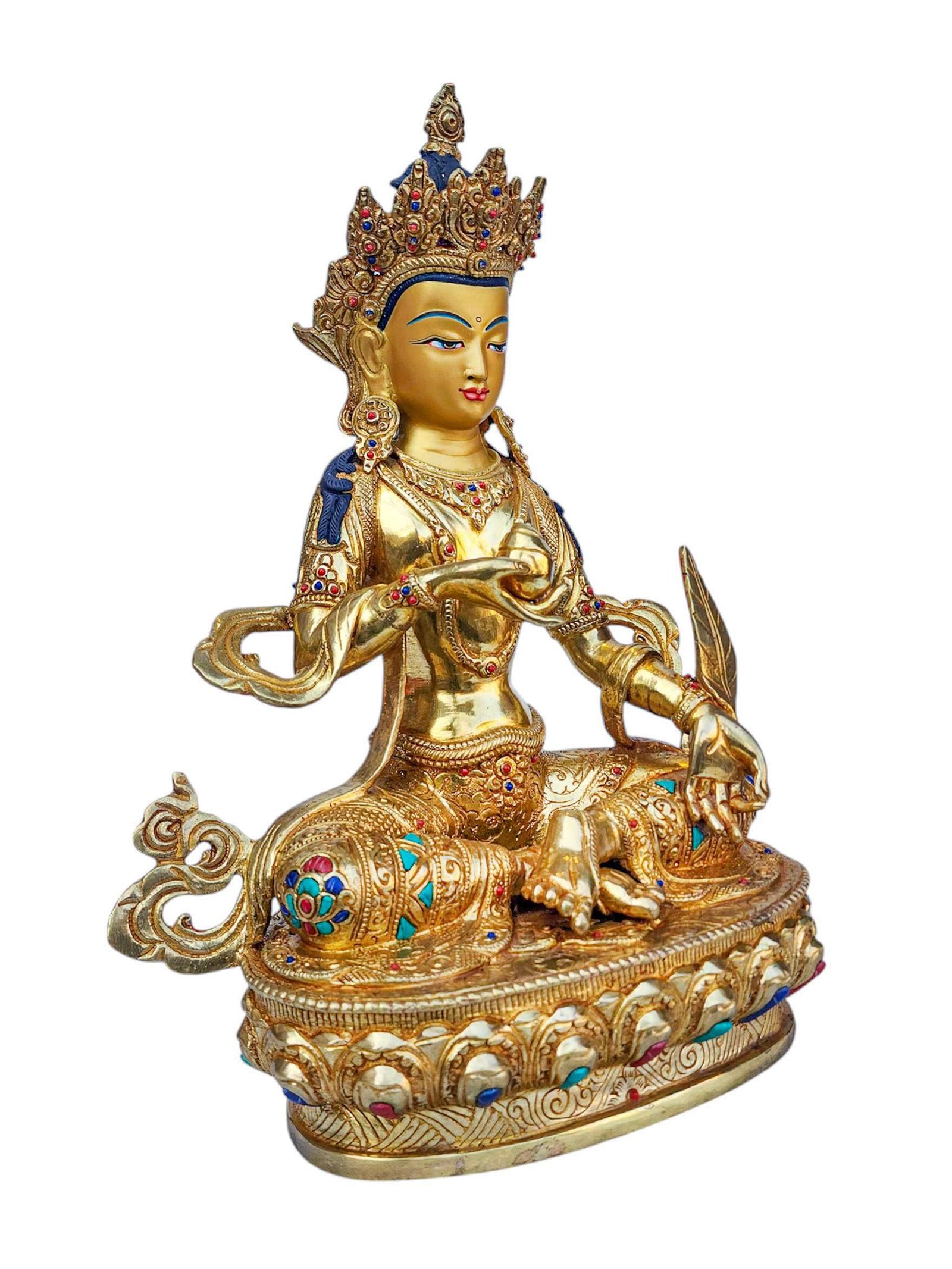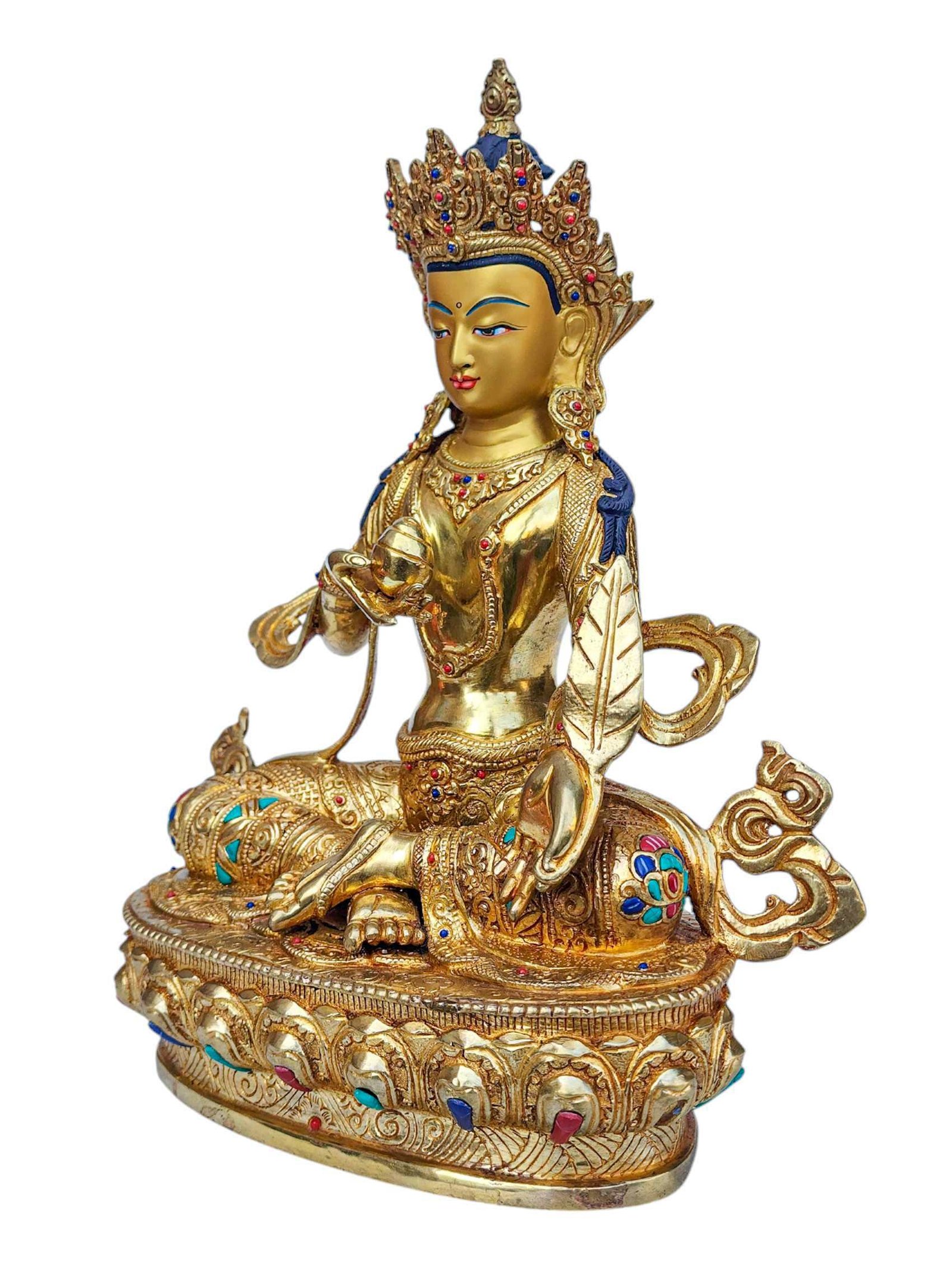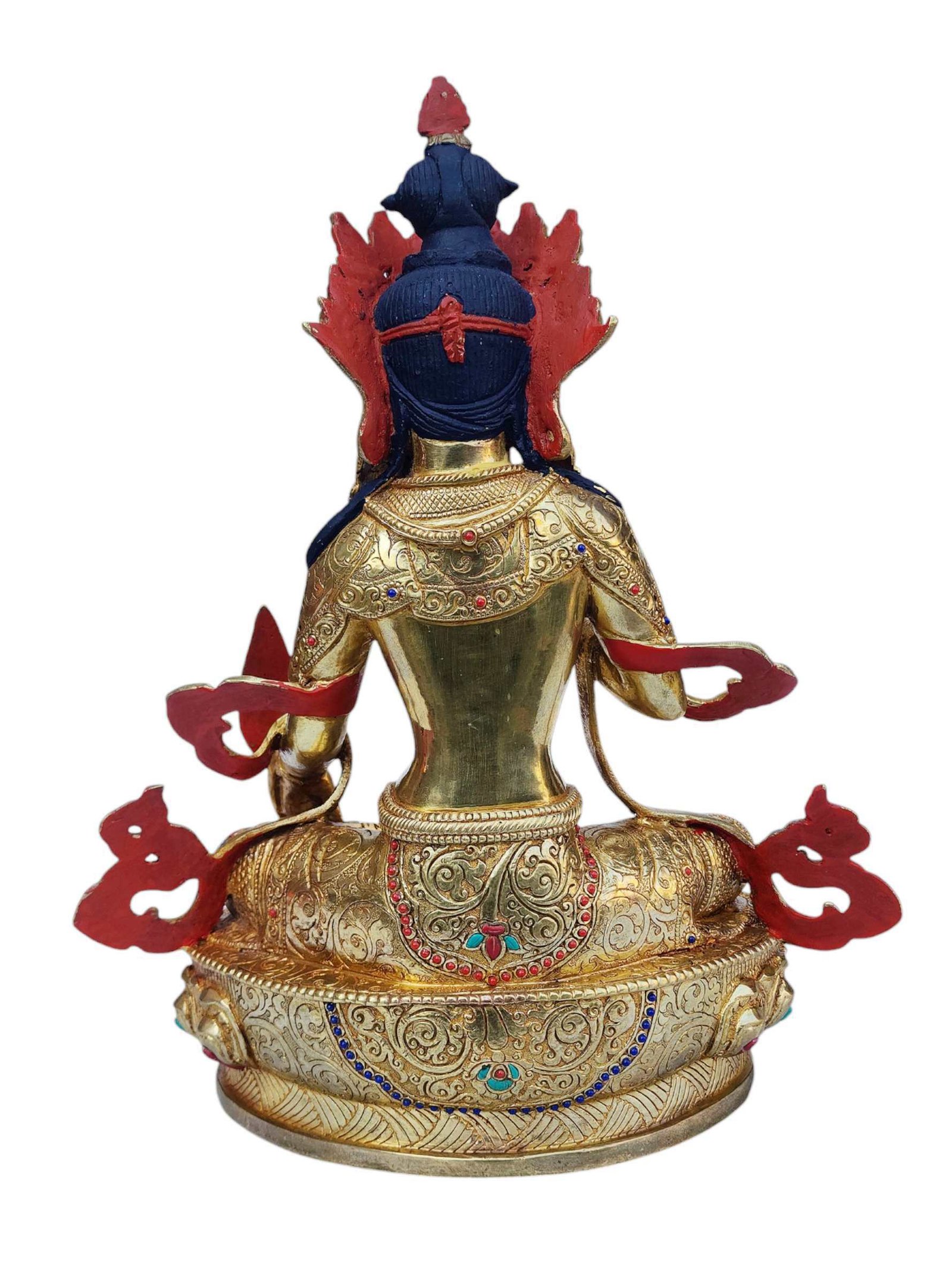 The ksitigarbha is adorned with an exquisite array of semi-precious stones, including turquoise, coral, and lapis lazuli. These stones are carefully selected and meticulously placed on the ksitigarbha's surface, adding a touch of opulence and enhancing its overall beauty. Each stone is thoughtfully positioned using a high-quality adhesive, ensuring secure and long-lasting attachment. The vibrant colors and unique patterns of the stones create a captivating contrast against the backdrop of the ksitigarbha, elevating its visual appeal and making it truly eye-catching. Read More