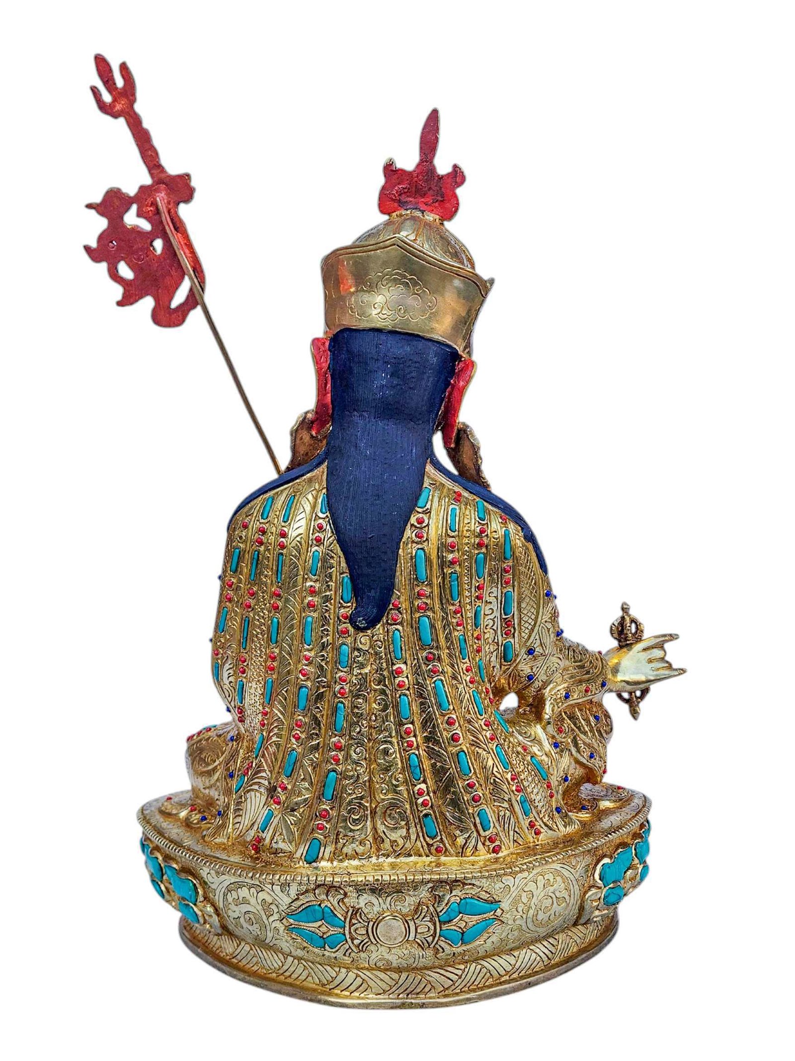 The Padmasambhava is adorned with an exquisite array of semi-precious stones, including turquoise, coral, and lapis lazuli. These stones are carefully selected and meticulously placed on the Padmasambhava's surface, adding a touch of opulence and enhancing its overall beauty. Each stone is thoughtfully positioned using a high-quality adhesive, ensuring secure and long-lasting attachment. The vibrant colors and unique patterns of the stones create a captivating contrast against the backdrop of the Padmasambhava, elevating its visual appeal and making it truly eye-catching. Read More