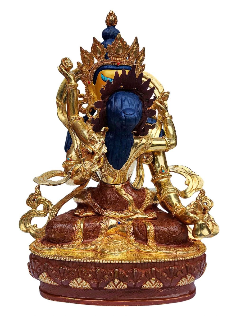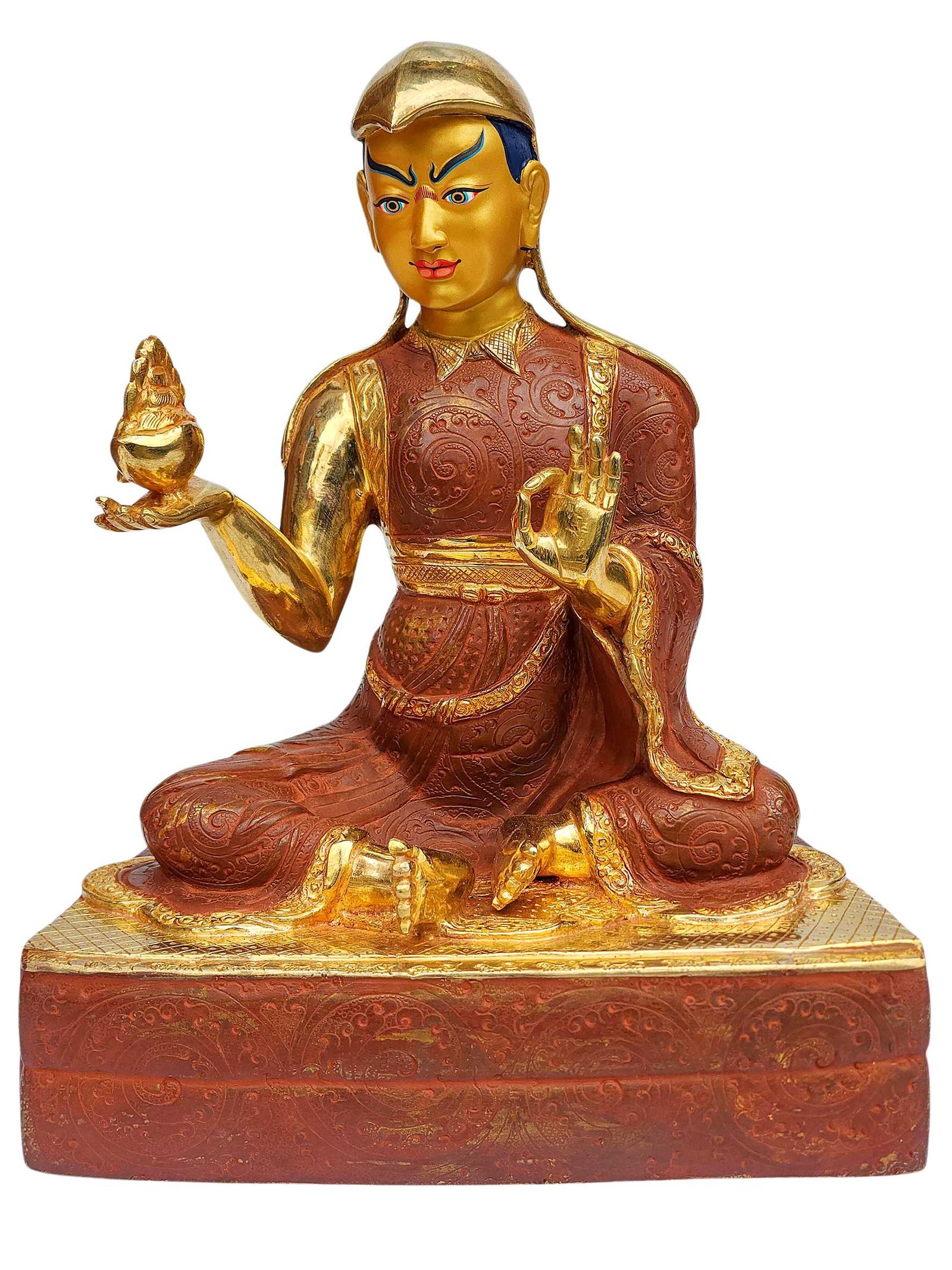 The face of Dorje Drolo is painted with gold to enhance its significant features, particularly the eyes, and lips. This detailed painting is essential as it brings forth the crucial attributes of the expression of eyes and lips that metal carving alone cannot capture.
