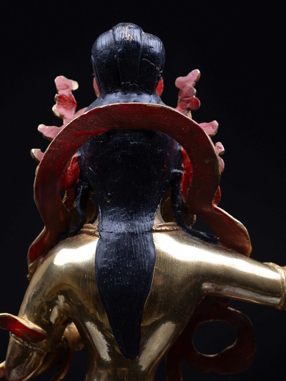 This Sherab Chamma has a Partly gold-plated finish. Partly fire gold gilding, a common practice in Nepali handicrafts. This technique is skillfully employed by artisans to create intricate designs on various metal objects, including statues, jewelry, and decorative items. Through a process, a mask or resist is applied to safeguard specific areas from the gold plating. The object is then subjected to high temperatures, allowing the gold to beautifully adhere to exposed surfaces using a combination of heat and pressure.