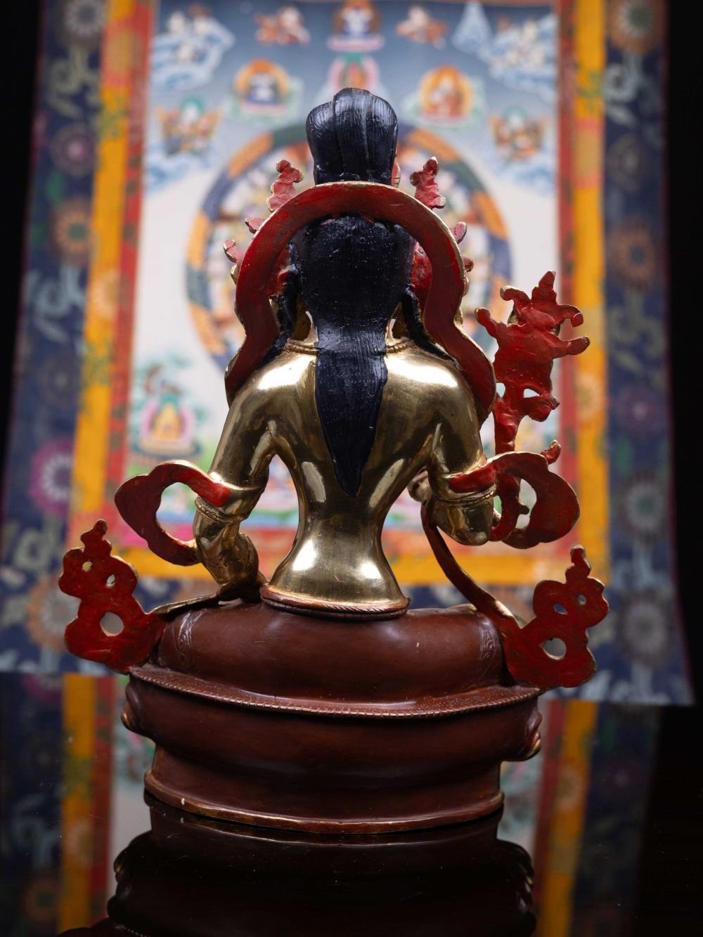The face of White Tara is painted with gold to enhance its significant features, particularly the eyes, and lips. This detailed painting is essential as it brings forth the crucial attributes of the expression of eyes and lips that metal carving alone cannot capture.