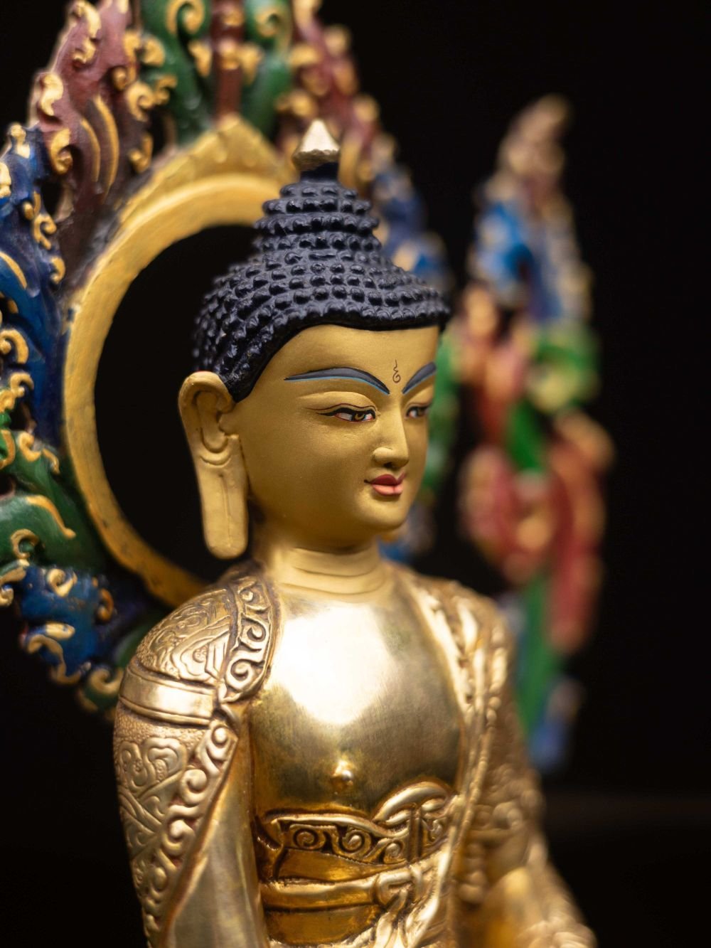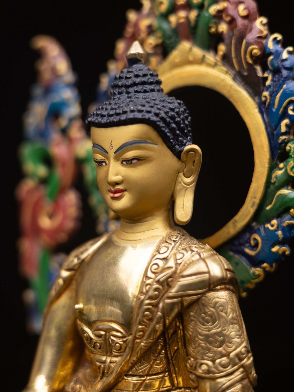 The face of Shakyamuni Buddha is painted with gold to enhance its significant features, particularly the eyes, and lips. This detailed painting is essential as it brings forth the crucial attributes of the expression of eyes and lips that metal carving alone cannot capture.