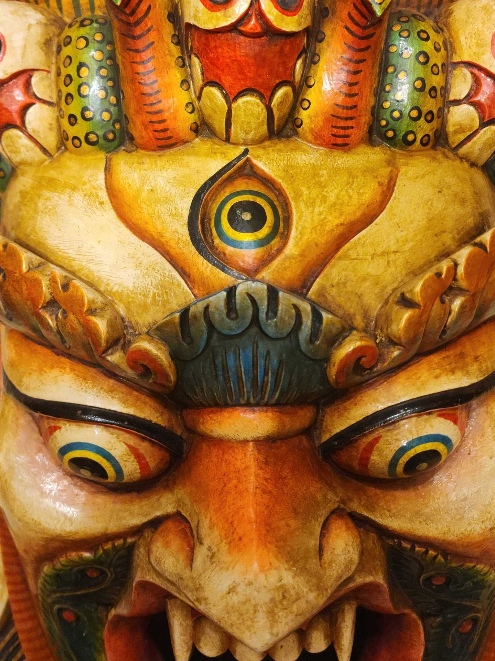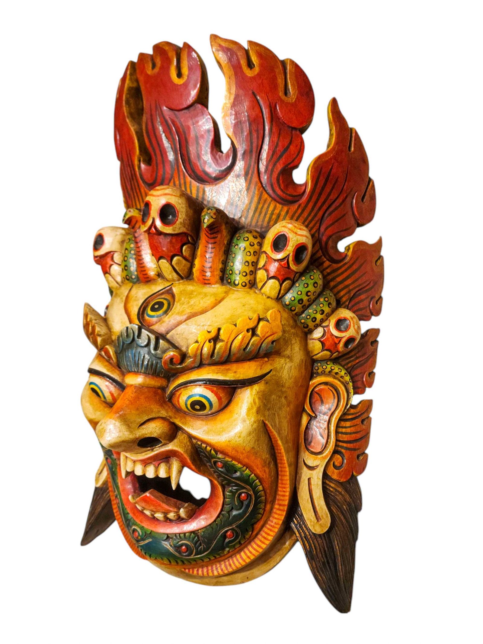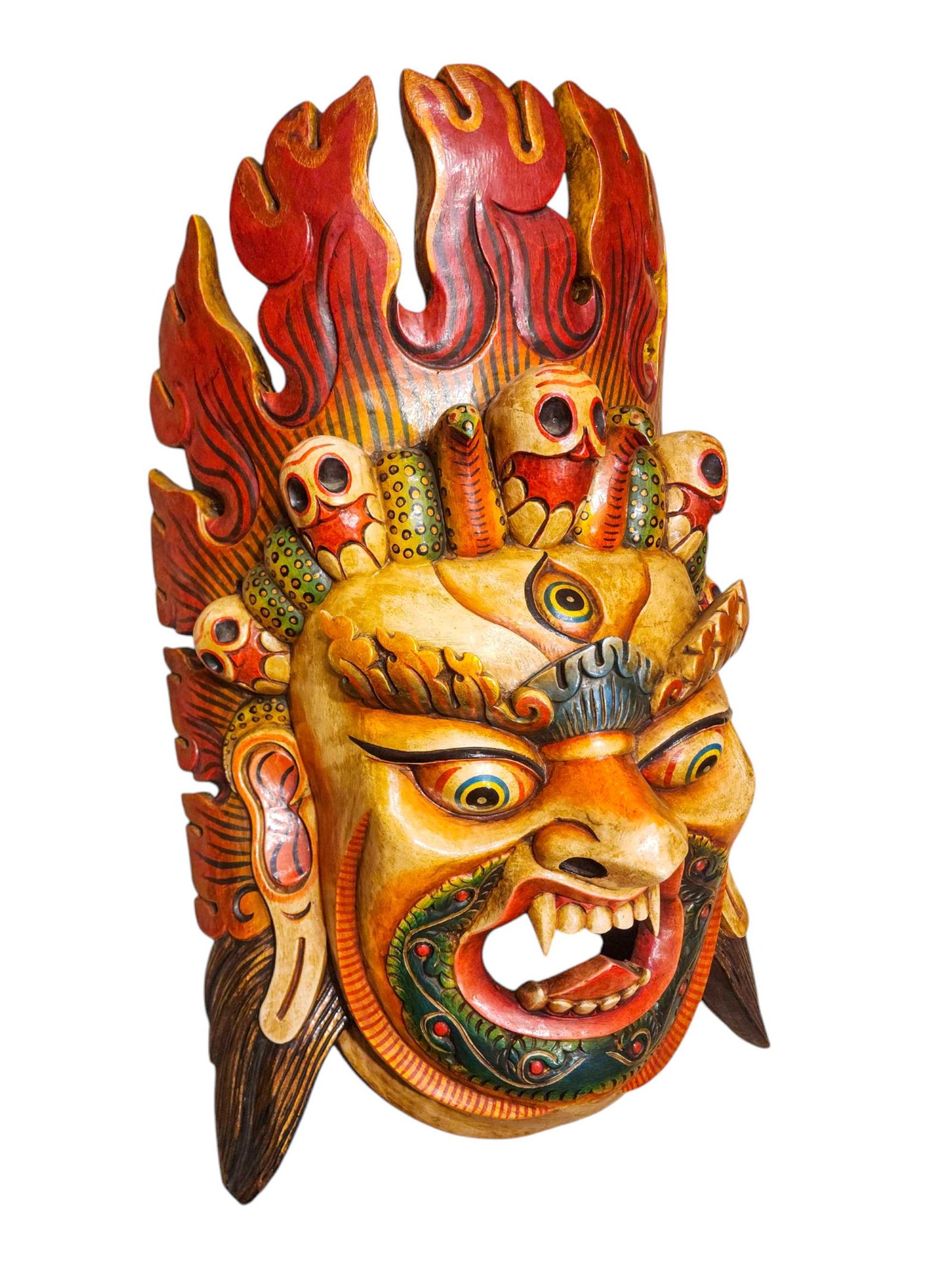 this Bhairav mask is Nepali handmade mask and we are Introducing our exquisite collection of Nepali handmade hand-carved wooden Buddhist masks and wall hangings, meticulously crafted by skilled artisans. Each piece in this collection reflects the rich cultural heritage and spiritual significance of Nepal. These masks and wall hangings are not just decorative pieces but hold deep symbolic meaning, making them perfect for adding an authentic touch to your living spaces or meditation rooms. Read More