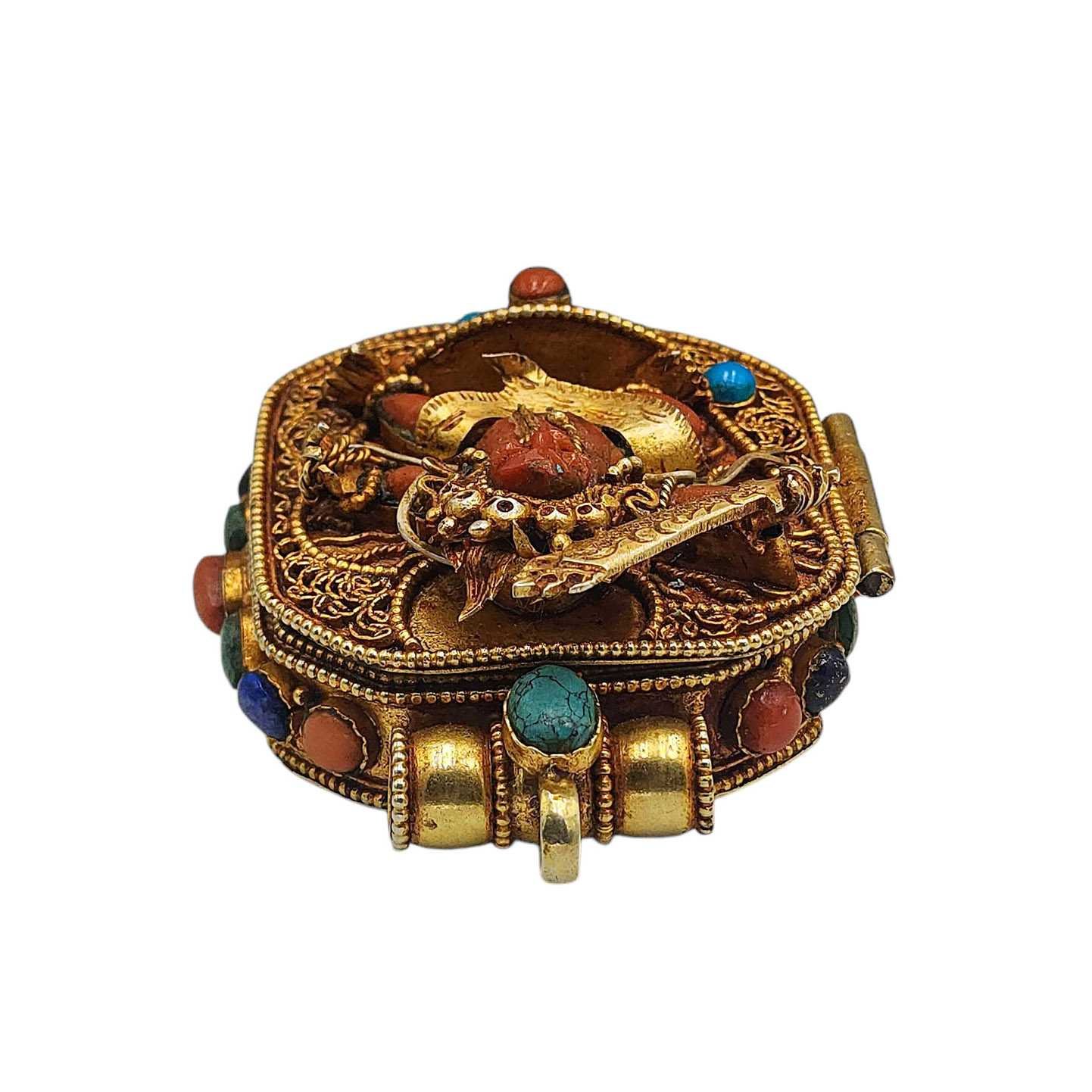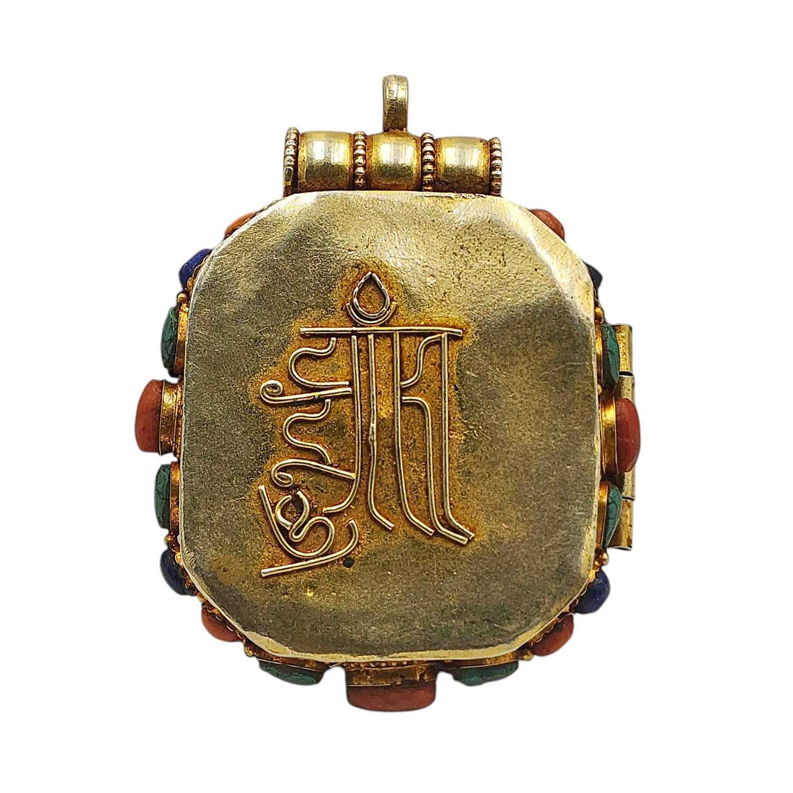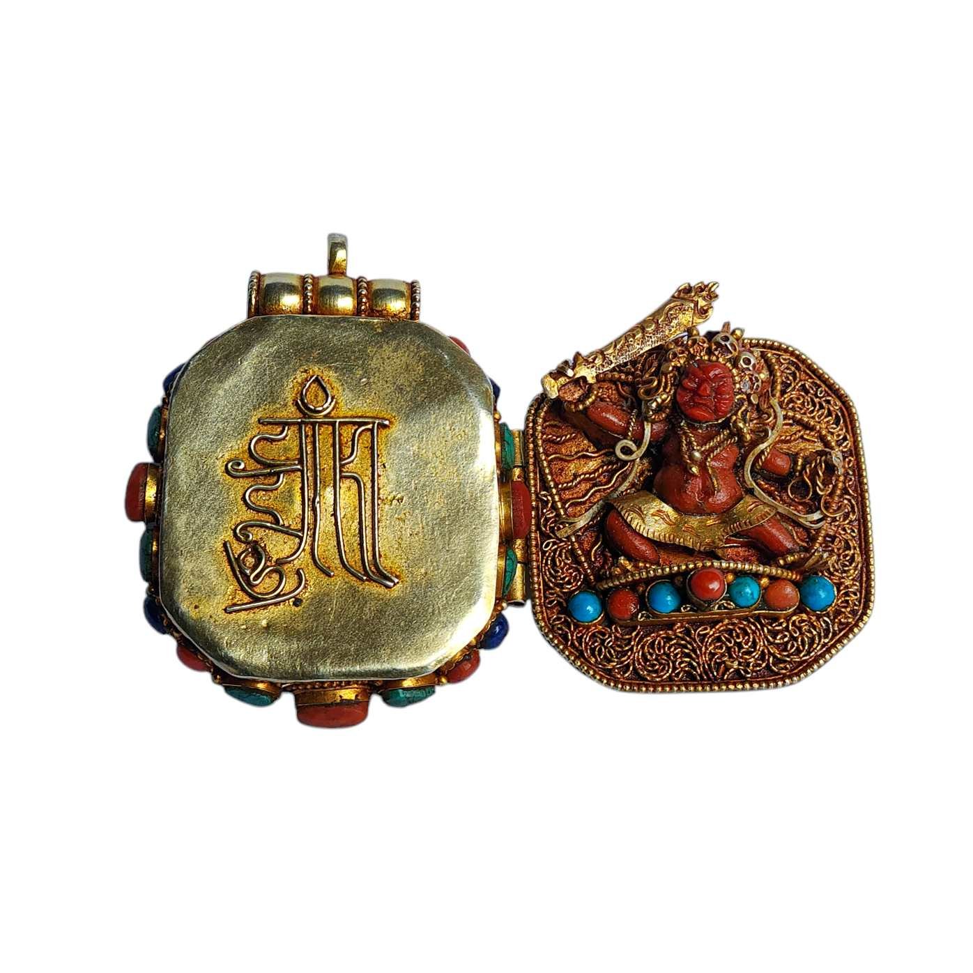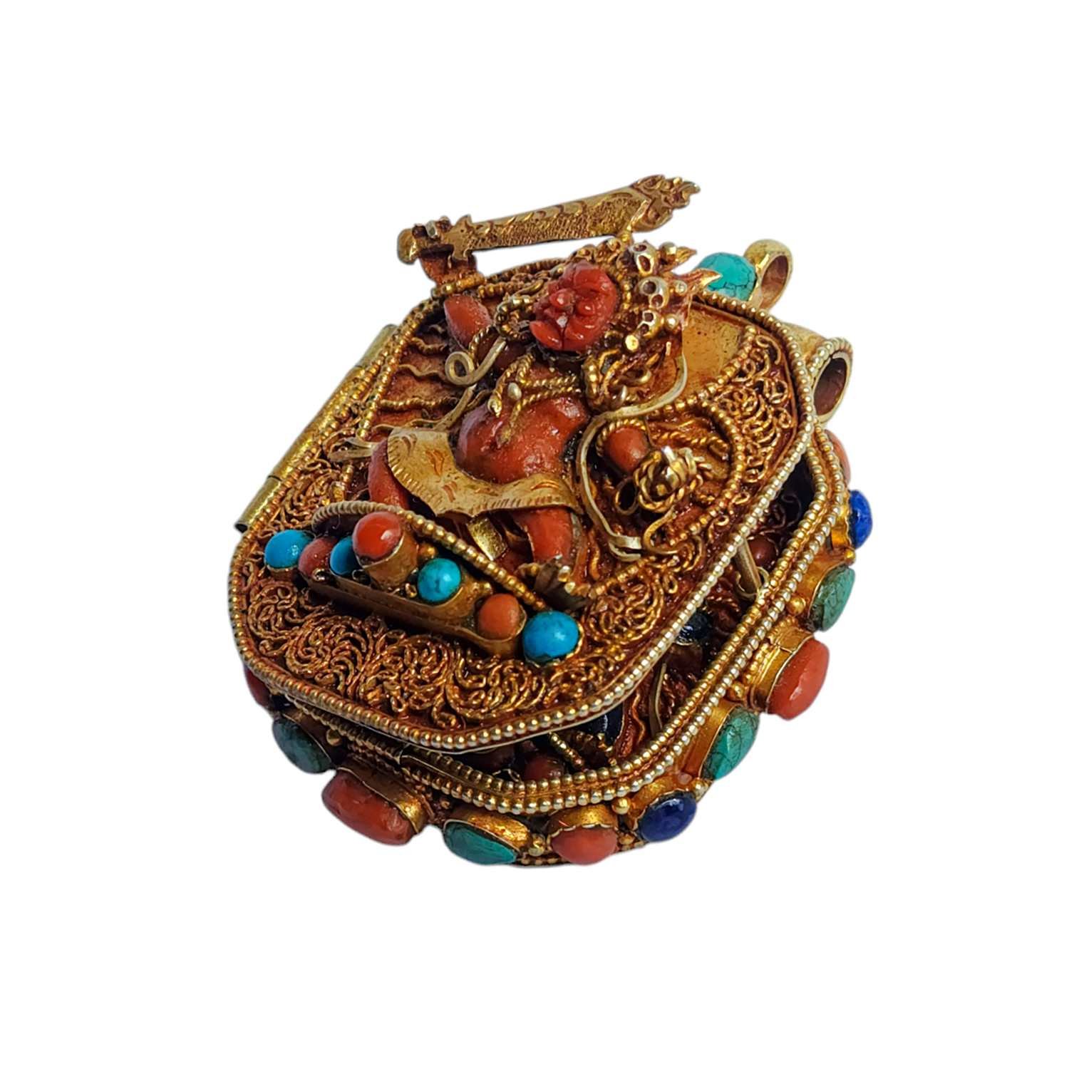 Silver Tibetan Ghau Box with Manjushree, Gold Plated and Stone Setting
