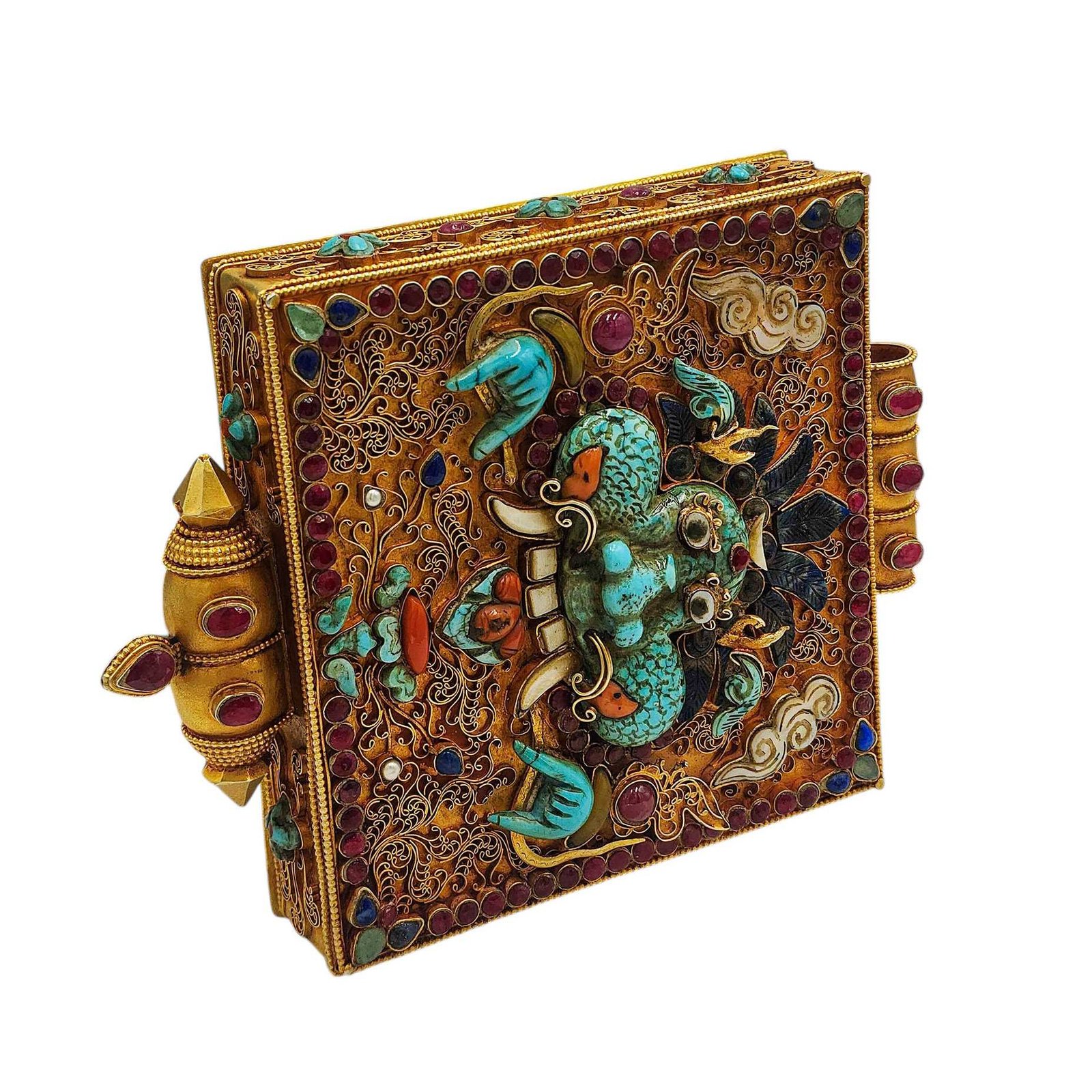 Ghau is a portable shrine in which an image of the owner's personal deity (Ishta Devata) is kept wrapped in silk cloth. Most Tibetans used Ghau at home and during traveling. At home, it is kept on alter but when traveling it is fastened at the cross belt. Generally, Ghau has trefoil shapes to and a window in the middle through which one can see the personal deity. Ghau is made of two parts which fit together to form a box. The back is usually left plain and the front is richly decorated. Read More