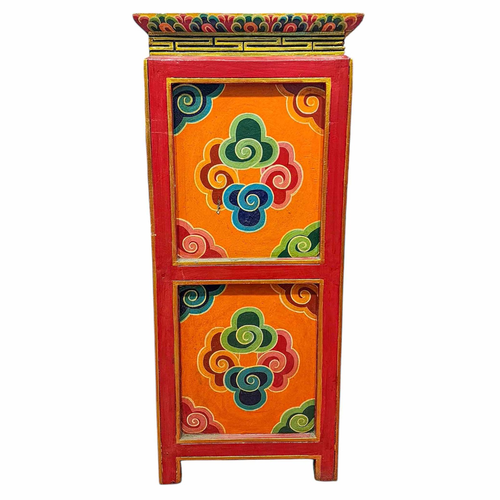 This exquisite Tibetan-style wooden cabinet, handcrafted and painted in Nepal, is a stunning blend of functionality and cultural artistry. Made from high-quality wood by skilled Nepali artisans, each piece is unique, showcasing meticulous hand-painted designs with vibrant colors and intricate motifs reflective of Tibetan spirituality and heritage. The cabinet provides ample storage with spacious shelves and compartments, making it ideal for various spaces in your home, such as the living room, bedroom, or entryway. Its rich detailing and auspicious symbols not only offer a touch of elegance but also embody a deep cultural significance, believed to bring good fortune and harmony. More than just a piece of furniture, this cabinet is a timeless art piece that elevates your decor while preserving the vibrant traditions of Tibetan and Nepali craftsmanship. Read More