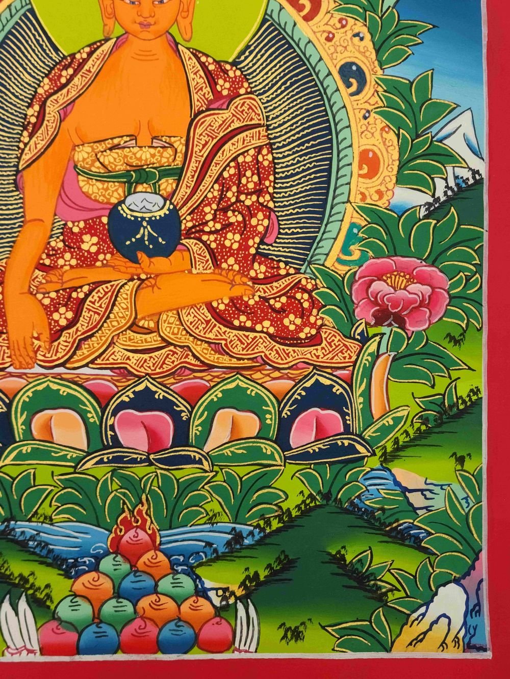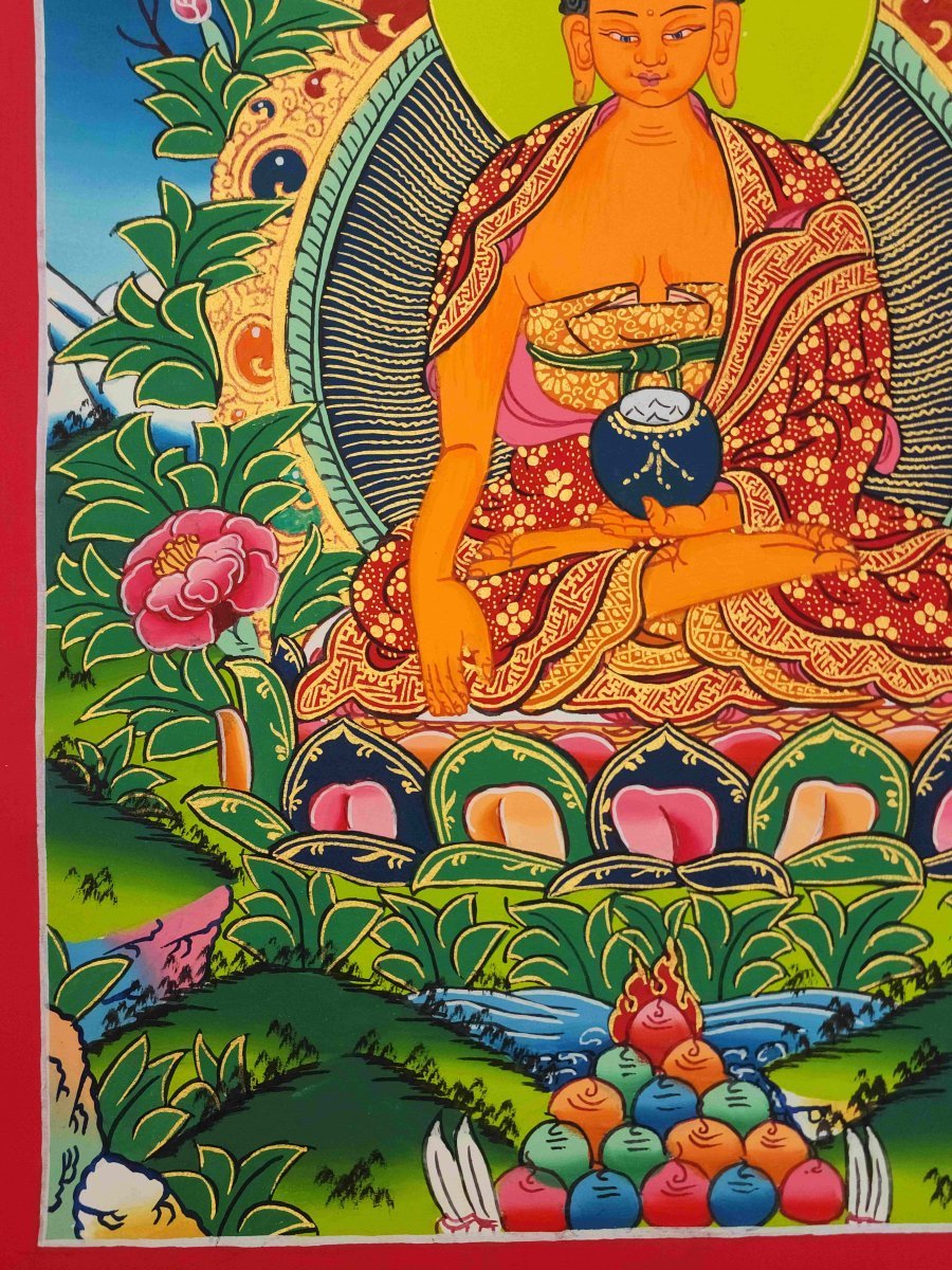 Gautama is painted with golden skin sitting in a lotus seat [Skt. Padmasana] also called the meditative seat [Skt. Dhyanasana] & upon a white moon disc which represents the male principle of method which itself is upon a lotus throne. His left hand touches the ground in what is called bhumisparse mudra which symbolises his own recognition of enlightened mind in one of the most iconic images in all Buddhism. The palm always faces inwards. His feet are deliberately drawn level with one another & enlarged, being specific marks of a Buddha. His right hand supports an alms bowl [Skt. Patra], containing the liquid elixir of eternal life. Somehow the simple image of the bowl reflects his overwhelming humility & kindness. He wears the traditionally maroon gold monk's patched robe [Skt. Samghati] made of twenty five pieces of cloth which the first Buddhist monks sewed together. The Buddha has a green nimbus and blue aureole around his body signifying the highest level of understanding. Siddhartha is surrounded by Pink Lotuses [Skt. Padma]. This kind of lotus is connected with loving kindness & a flowering of pure consciousness. The closed bud to his right side represents the past or originating mind, the blooming flower represents the present & the buds represents the future Buddha Maitreya and forthcoming realisations. His elongated earlobes depict his royal connection; his knotted black hair & topknot symbolise his abandonment of worldly possessions; the dot [Skt. Urna] on his brow on the command chakra [Skt. Ajna] represents his transcendent wisdom, the 31st mark of a Buddha.