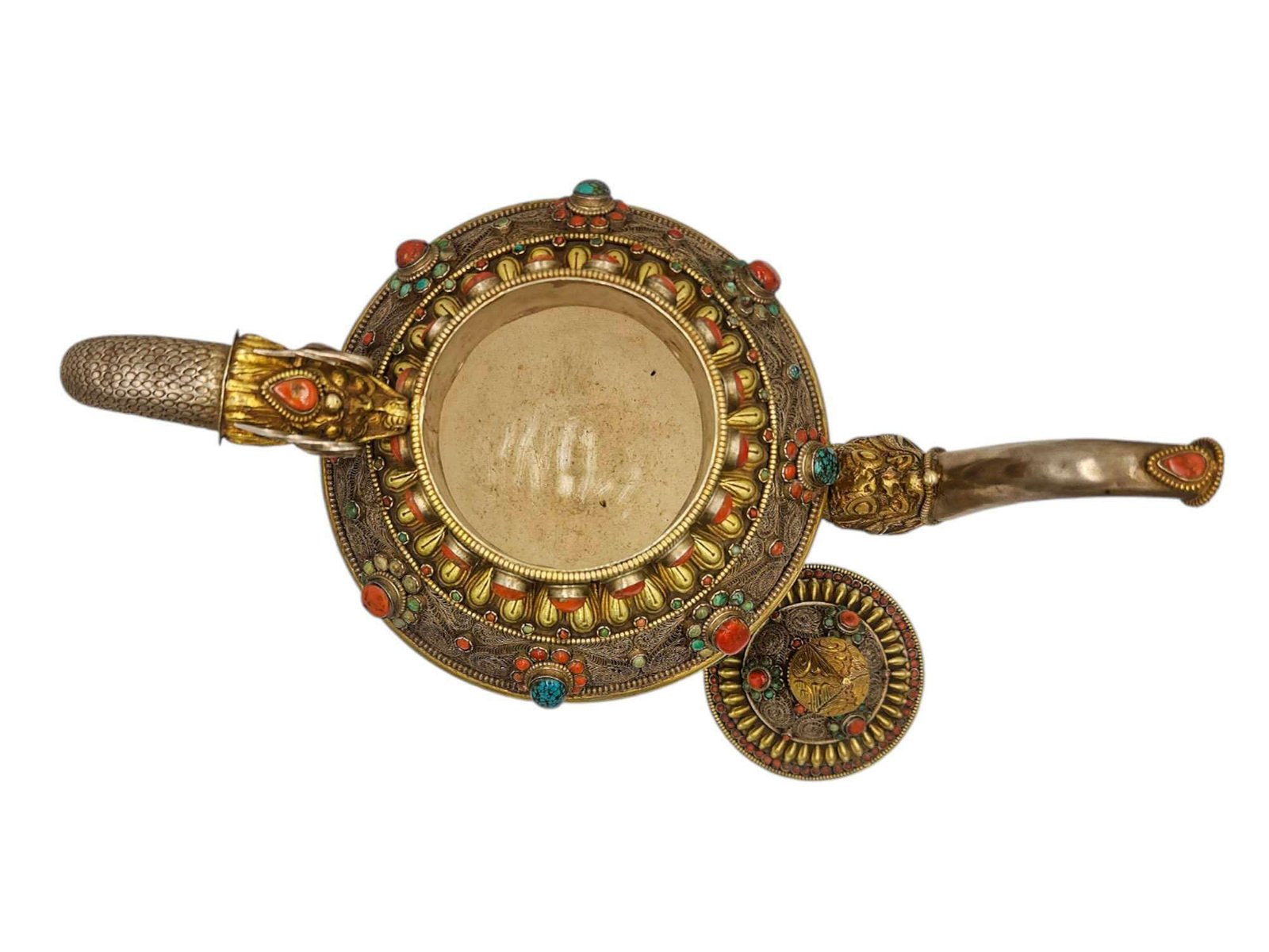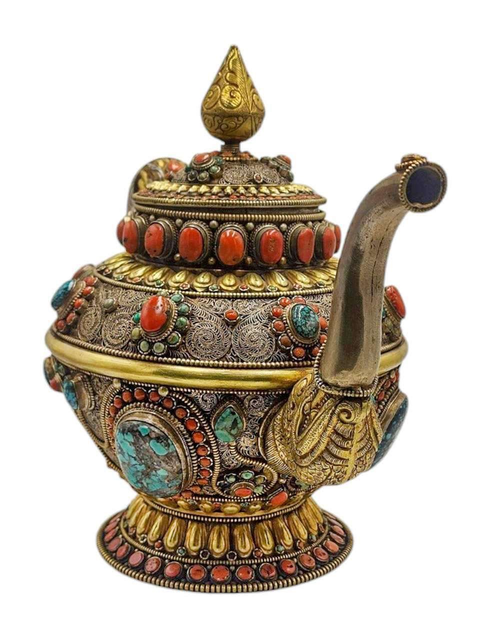 Tibetan Tea and Water offering Vessel Water Pot Silver and Gold, Antique Finishing and Stone Setting |