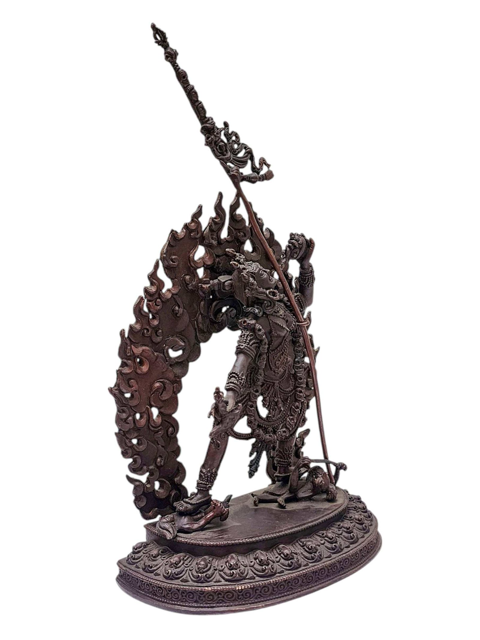 This Vajrayogini has been meticulously treated with a chocolate color antique patina. The intention behind this patina is to replicate the appearance of a copper statue that has gracefully aged over a century. Unlike a simple coat of paint, this patina is not applied superficially and is designed to endure. It undergoes an artificial oxidation process that adds depth and character, while also serving as a protective layer against natural oxidation.