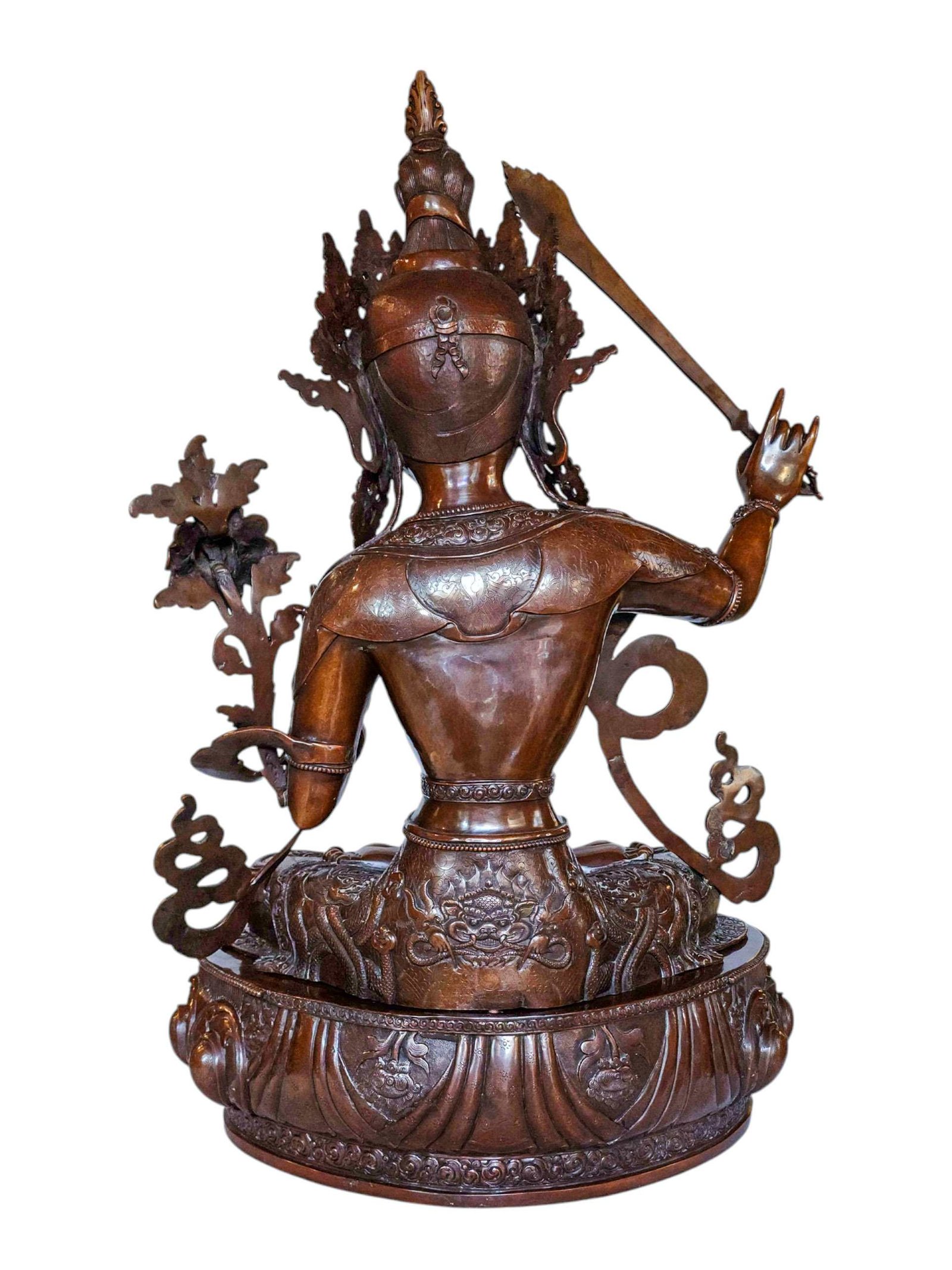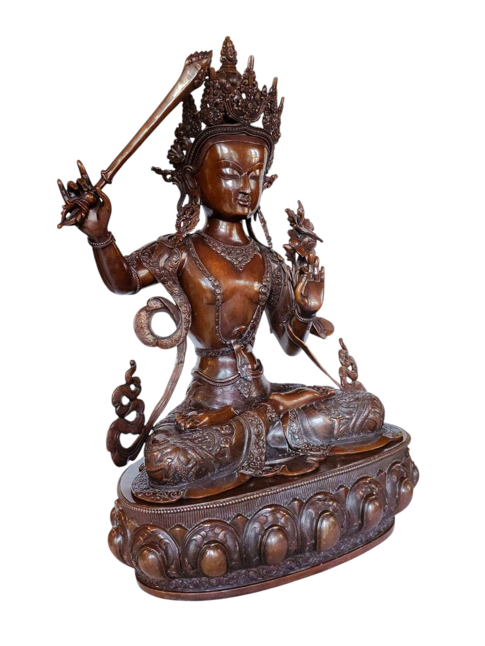 This Manjushri has been meticulously treated with a chocolate color antique patina. The intention behind this patina is to replicate the appearance of a copper statue that has gracefully aged over a century. Unlike a simple coat of paint, this patina is not applied superficially and is designed to endure. It undergoes an artificial oxidation process that adds depth and character, while also serving as a protective layer against natural oxidation.