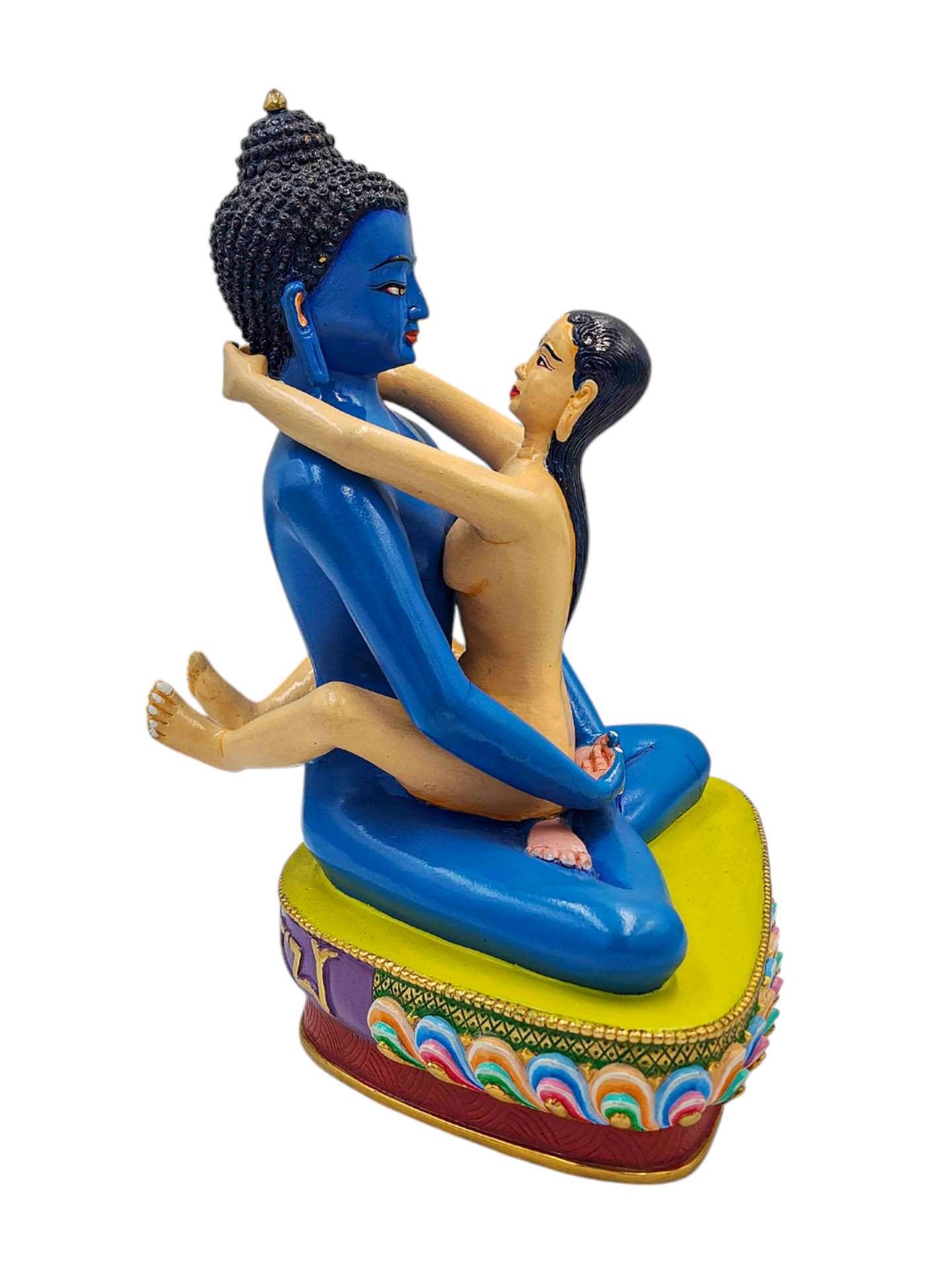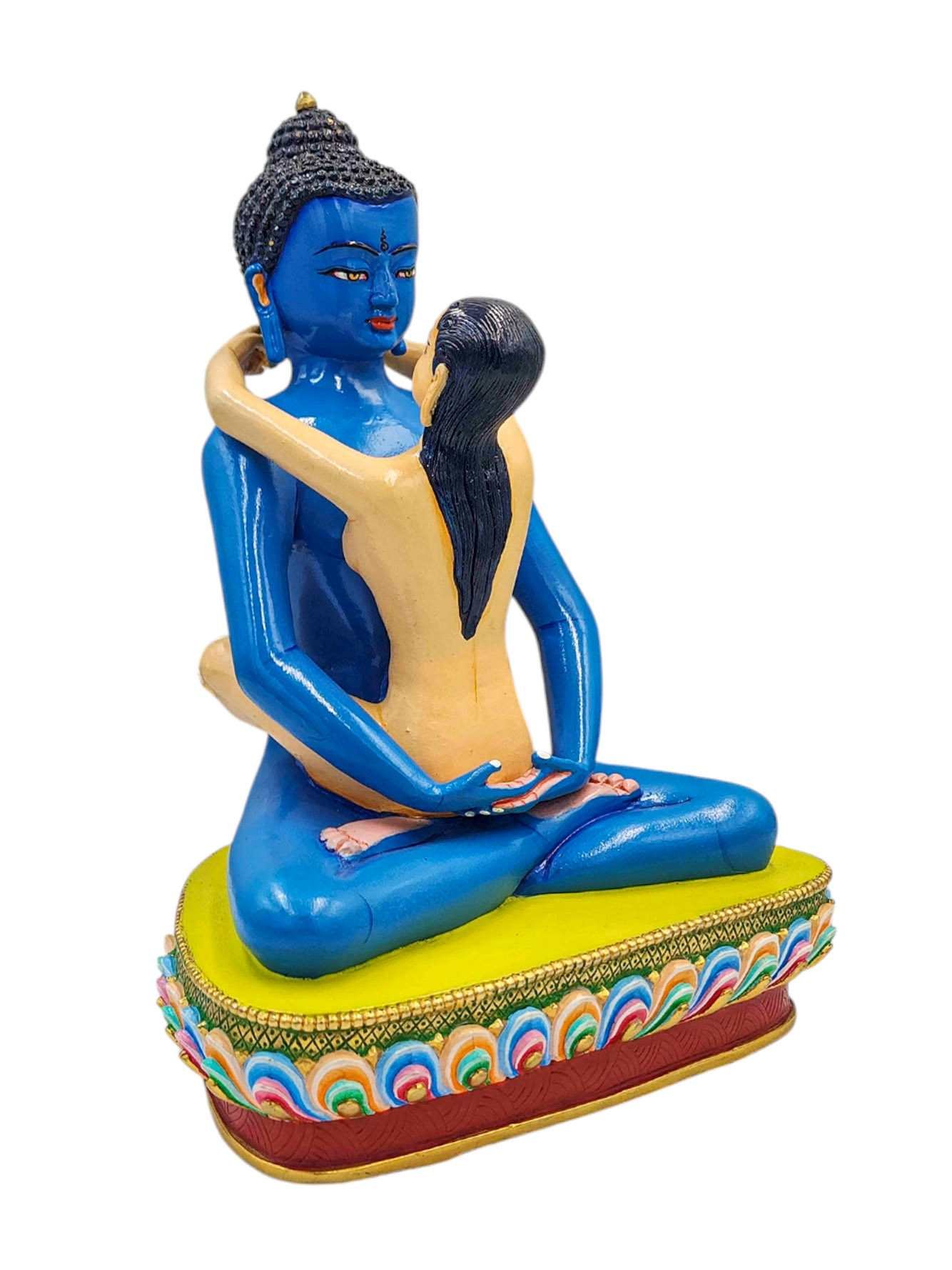 Samantabhadra also known as Visvabhadra, is naked called 'sky clad' , presented embracing figures the white female figure is called Samantabhadri in an body position [Skt. Asana] called Yib-Yum togetherness known as the body of blissful union called Sambhogakaya. The word Samantabhadra means Universal loving Virtue. A union of the inner and outer world. The principle of duality is visualized in male & female, dark-light, love-hate, day & night. The co-emergence [Skt. Sahaja] of wisdom [Skt. Prajna] with fitness of action [Skt. Upaya] which is similar to compassion leads one to a state of Great Bliss [Skt. Mahasukha]. The state of Great Bliss is akin to individual Nirvana.The eight embedded jewels represent the Eightfold Path realised by Sakyamuni. There is a small mirror [Skt. Aina or Darpana] representing introspection, sight or form together with a jewel offering in the foreground. The two hand symbols [Tib. Ting Sha] represent the sense offering of sound. The rainbow beams arising from the crimson nimbus around the head of Samanta Bhadra represent a mastery of Boddhi Nature & one manifestation of the Sambhogakaya is the Rainbow Body. There is a small mirror [Skt. Aina or Darpana] representing introspection, sight or form together with a jewel offering in the foreground. The two hand symbols [Tib. Ting-Sha] represent the sense offering of sound. The rainbow beams arising from the crimson nimbus around the head of Samanta Bhadra represent a mastery of Boddhi Nature & one manifestation of the Sambhogakaya is the Rainbow Body. The co-emergence [Skt. Sahaja] of wisdom [Skt. Prajna] withfitness of action [Skt. Upaya] which is similar to compassion leads one to a state of Great Bliss [Skt. Mahasukha].