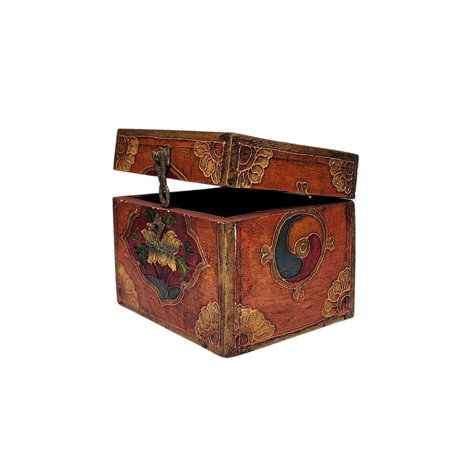 Buddhist Wooden Box with Lotus Design, Tibetan Style with Traditional Colors Antique Finishing |