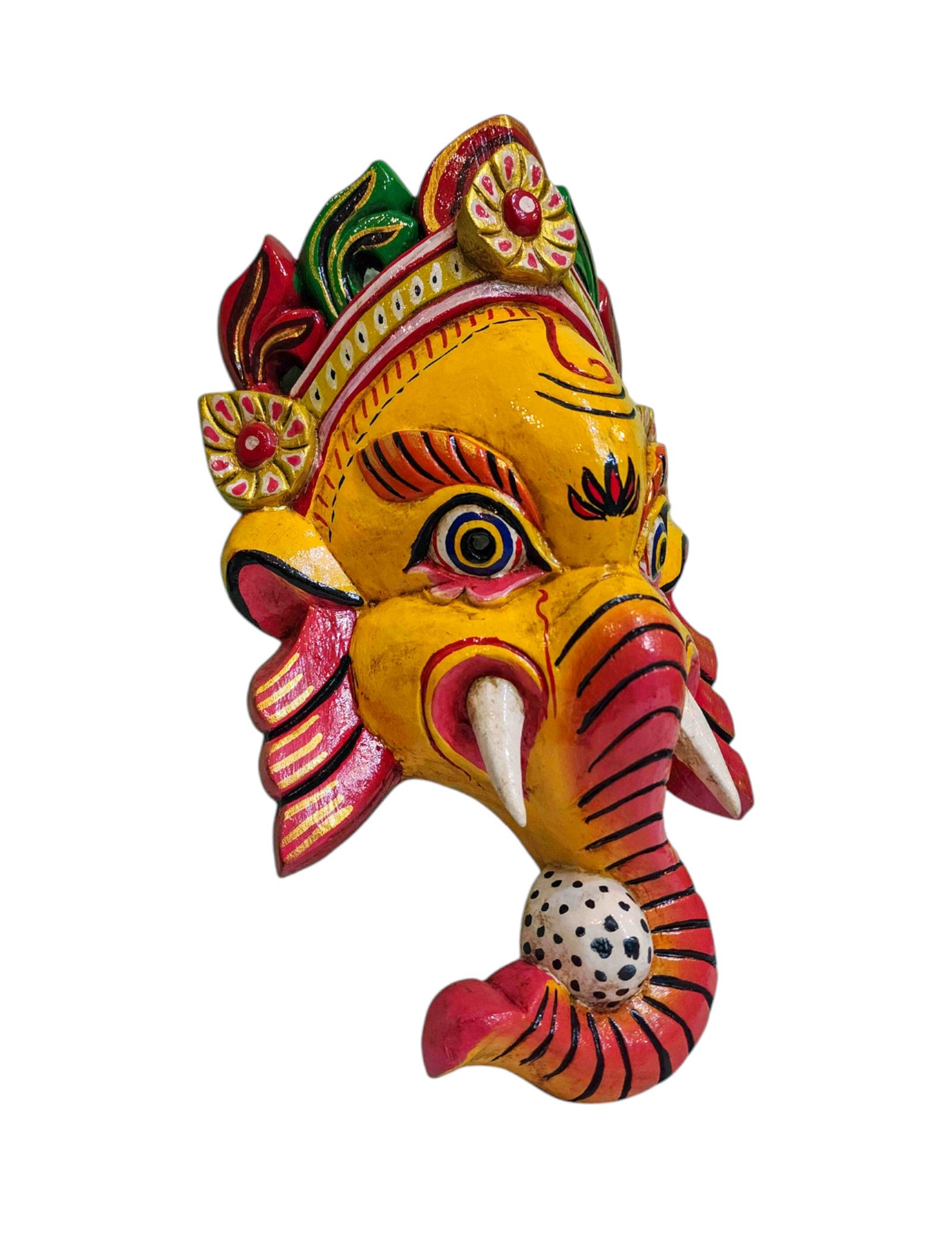Ganesh, Handmade Wooden Mask, Wall Hanging, Yellow Color, Poplar Wood , Remover of Obstacles, God of Wisdom and New Beginnings