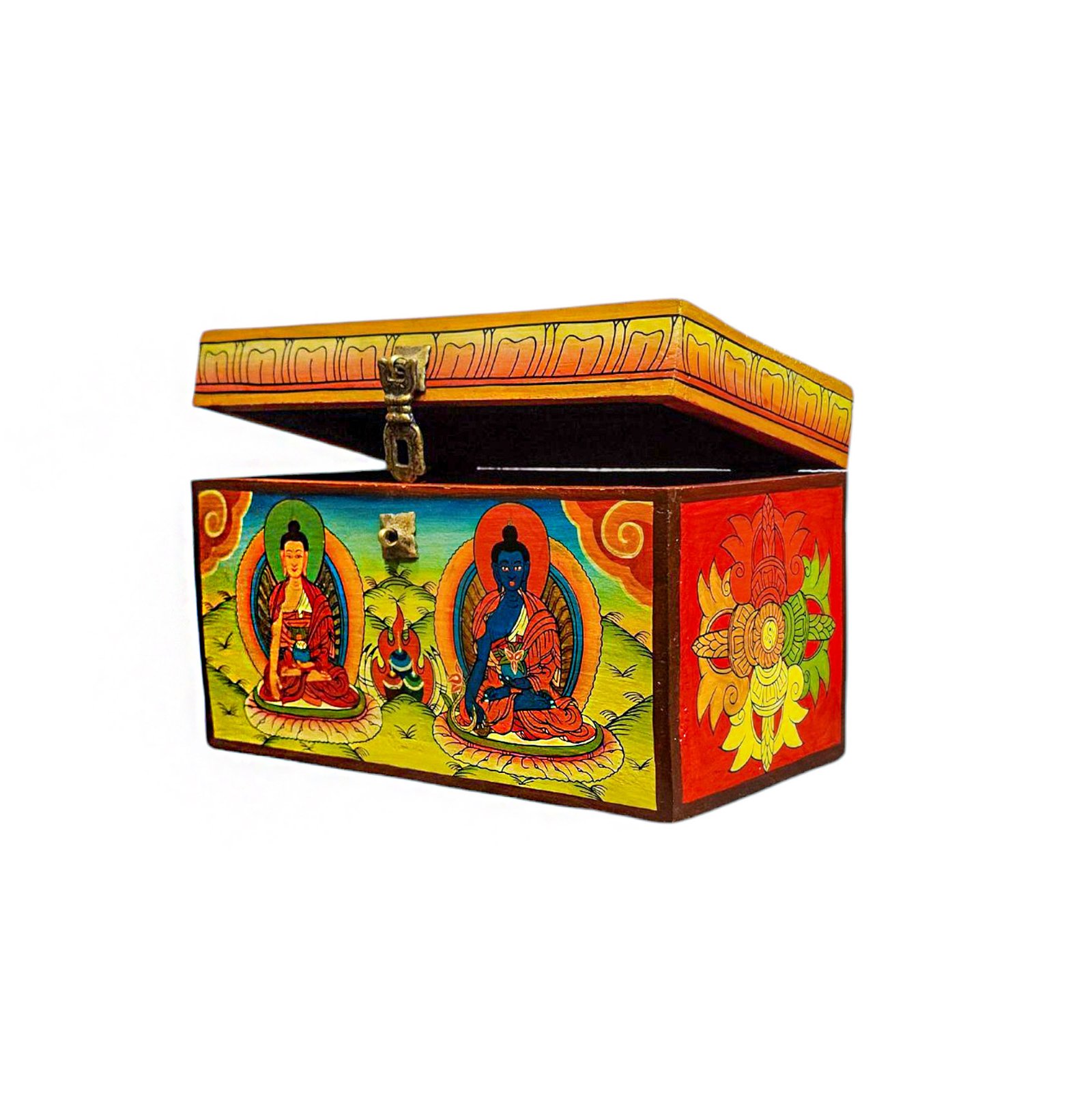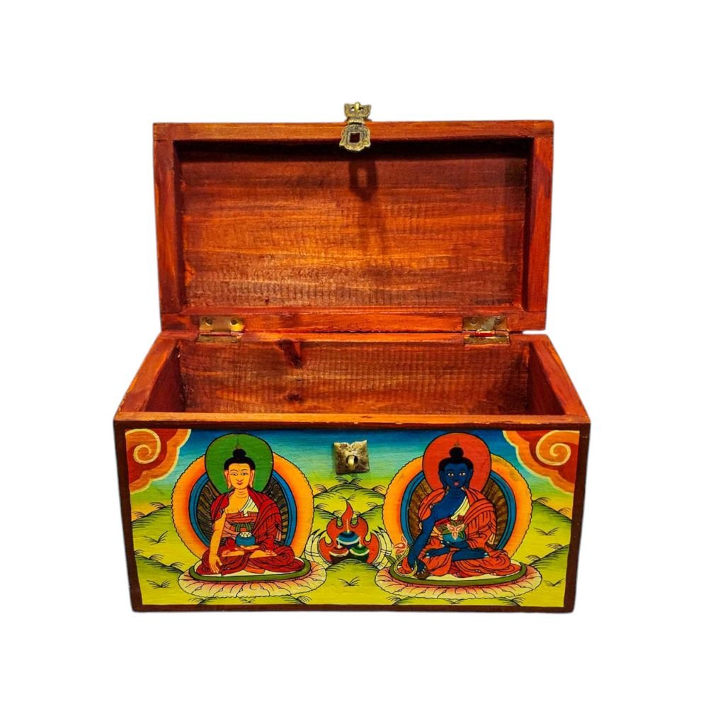 Buddhist Wooden Box with Shakyamuni and Medicine Buddha, Tibetan Style with Traditional Colors |