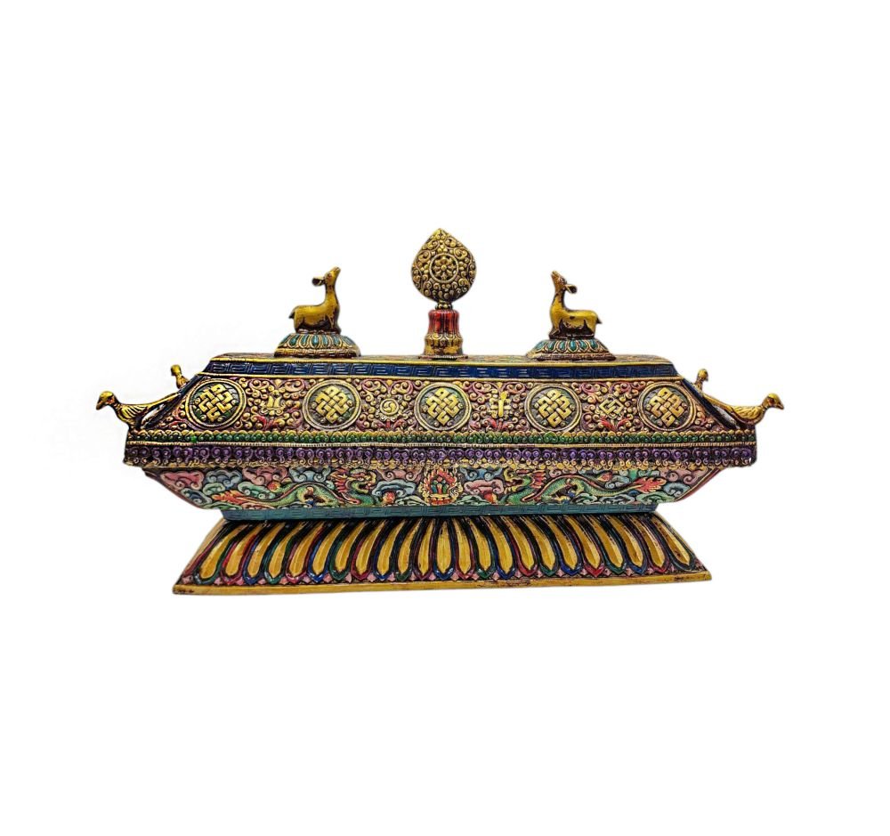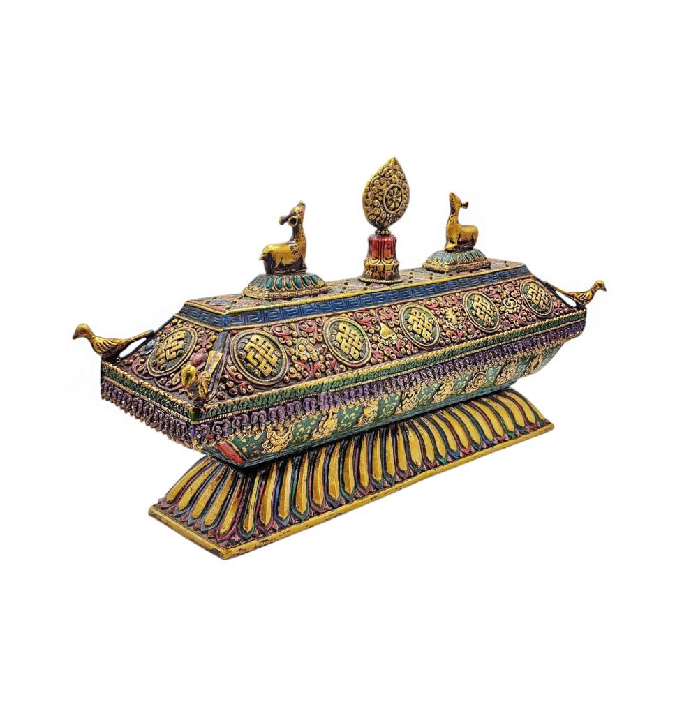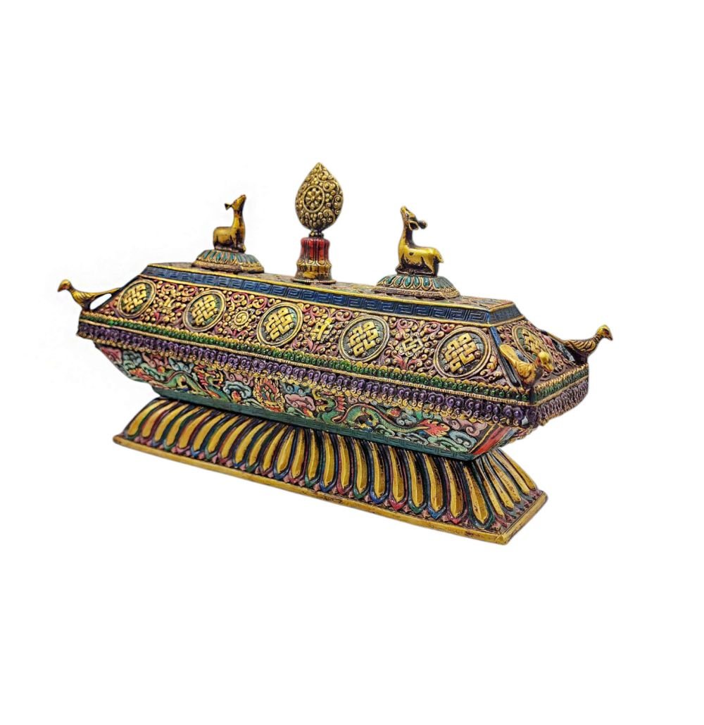 The Incense Burner is adorned with an exquisite array of semi-precious stones, including turquoise, coral, and lapis lazuli. These stones are carefully selected and meticulously placed on the Incense Burner's surface, adding a touch of opulence and enhancing its overall beauty. Each stone is thoughtfully positioned using a high-quality adhesive, ensuring secure and long-lasting attachment. The vibrant colors and unique patterns of the stones create a captivating contrast against the backdrop of the Incense Burner, elevating its visual appeal and making it truly eye-catching. Read More