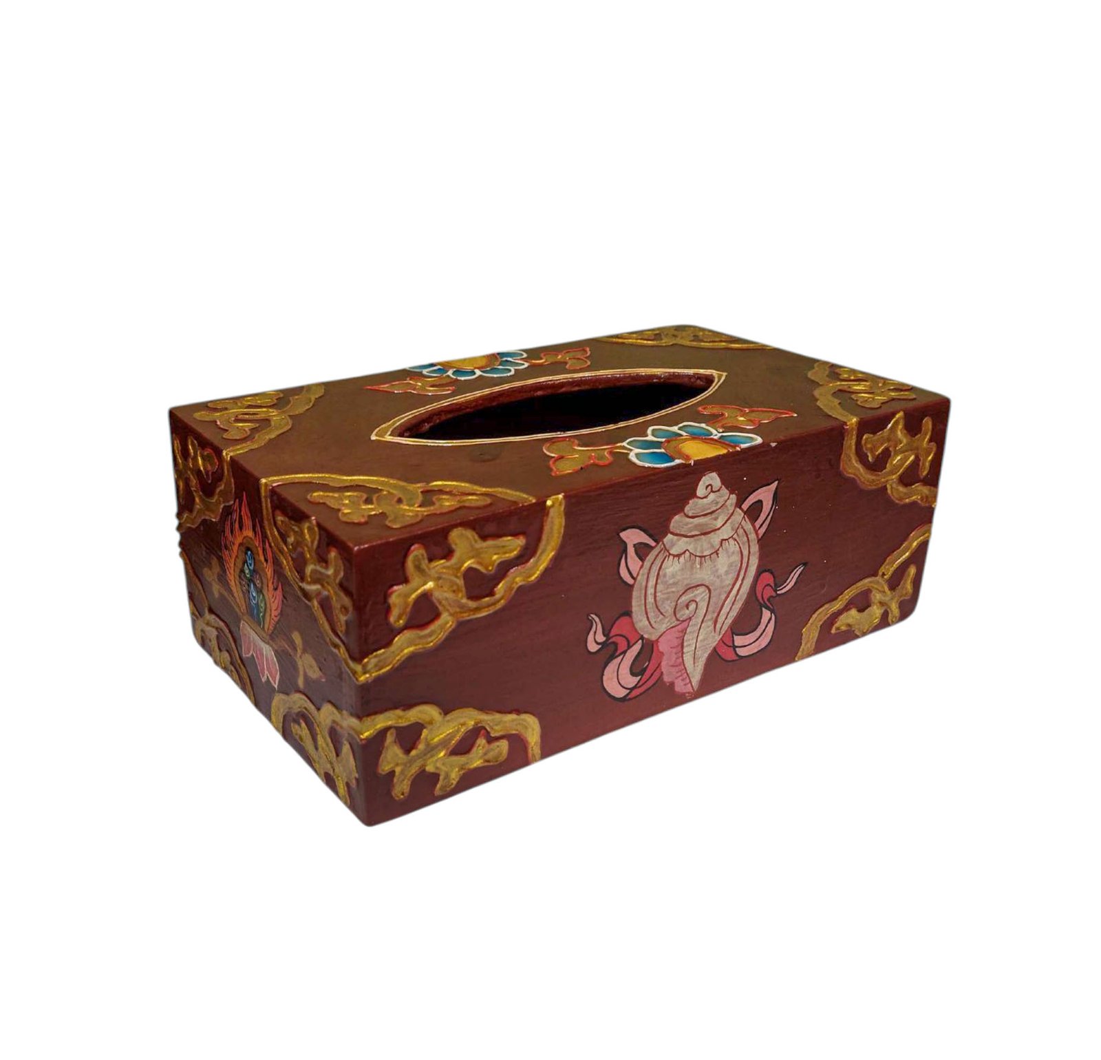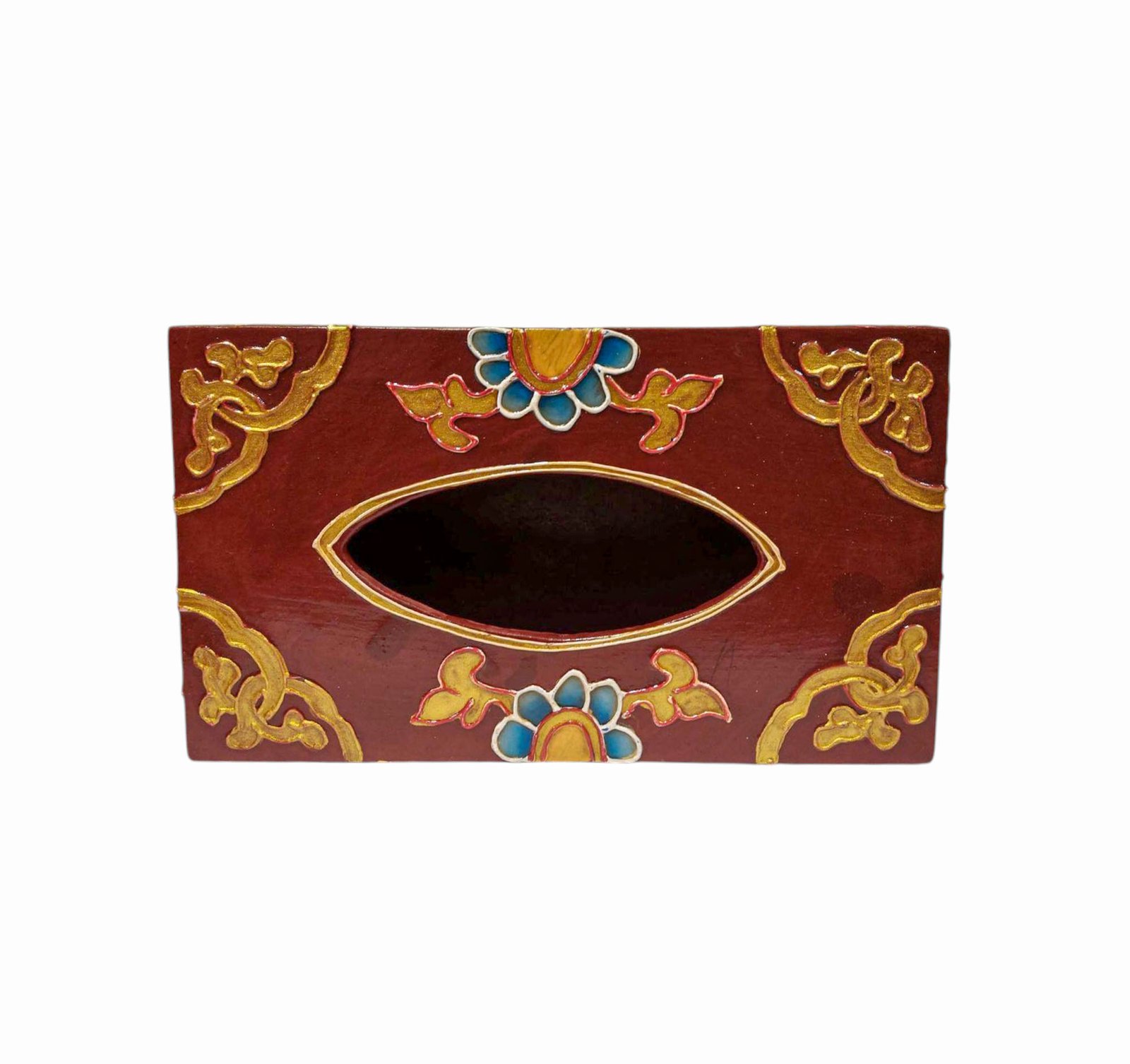 Tibetan Color Palette: Painted in the alluring colors reminiscent of Tibetan art, the tissue holder emanates an aura of serenity and tranquility. The beautiful hues of red, blue, green, and gold evoke a feeling of cultural enchantment, creating a harmonious atmosphere wherever it's placed.