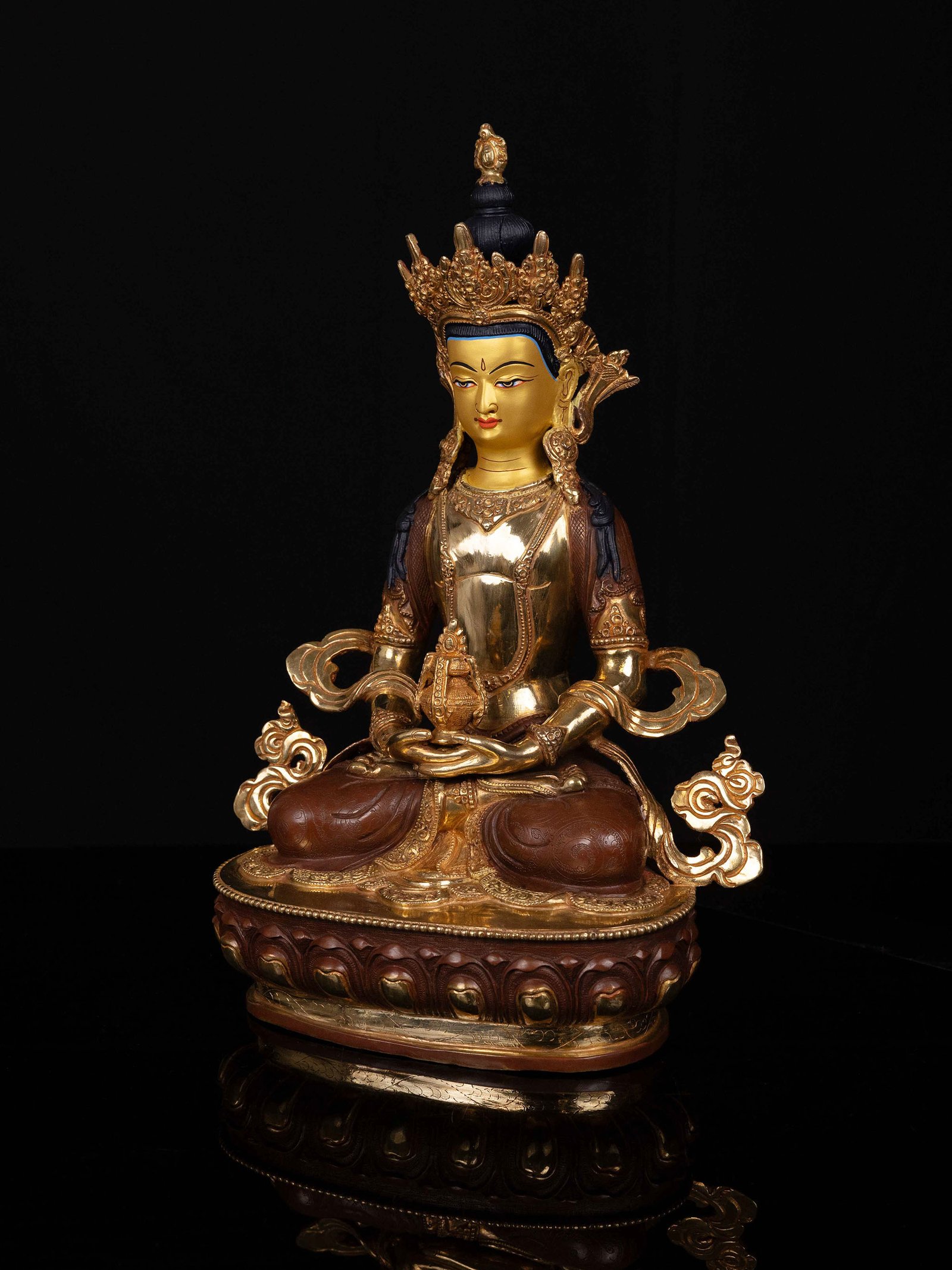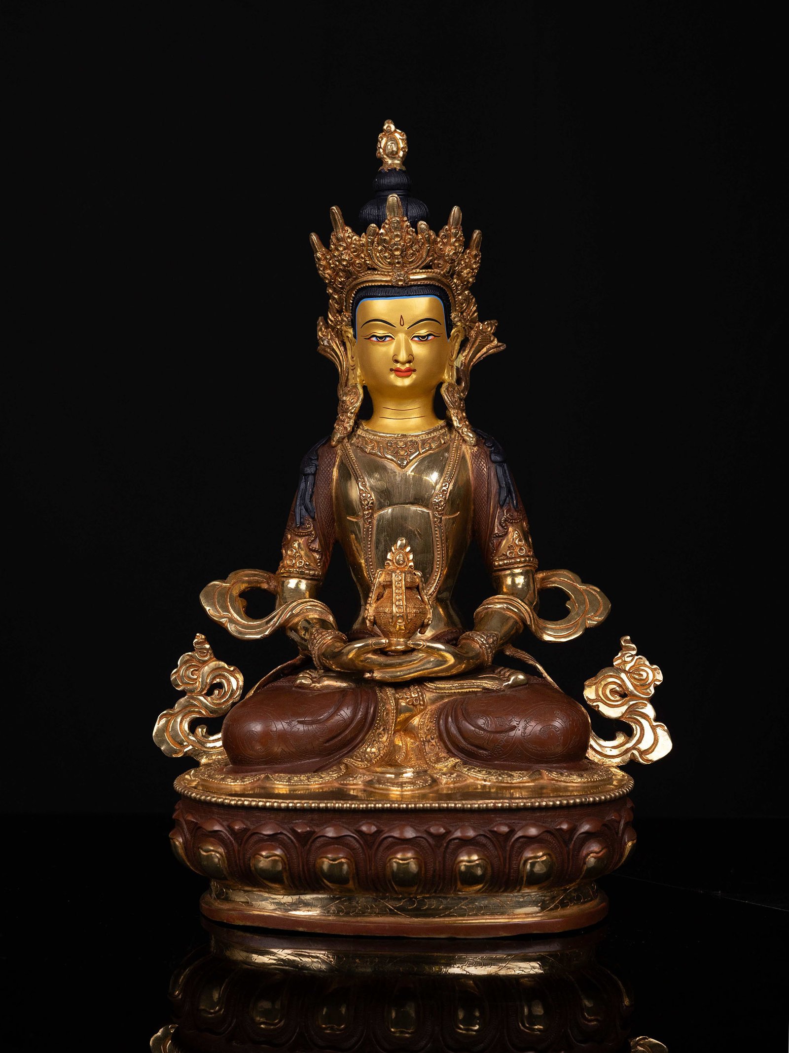 This Aparimita has a Partly gold-plated finish. Partly fire gold gilding, a common practice in Nepali handicrafts. This technique is skillfully employed by artisans to create intricate designs on various metal objects, including statues, jewelry, and decorative items. Through a process, a mask or resist is applied to safeguard specific areas from the gold plating. The object is then subjected to high temperatures, allowing the gold to beautifully adhere to exposed surfaces using a combination of heat and pressure.