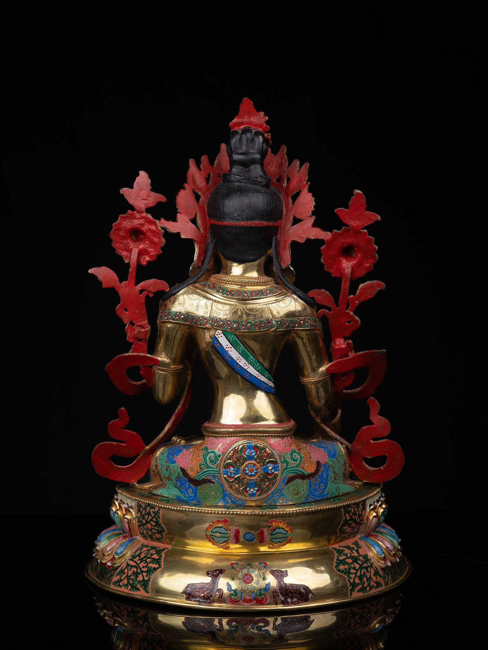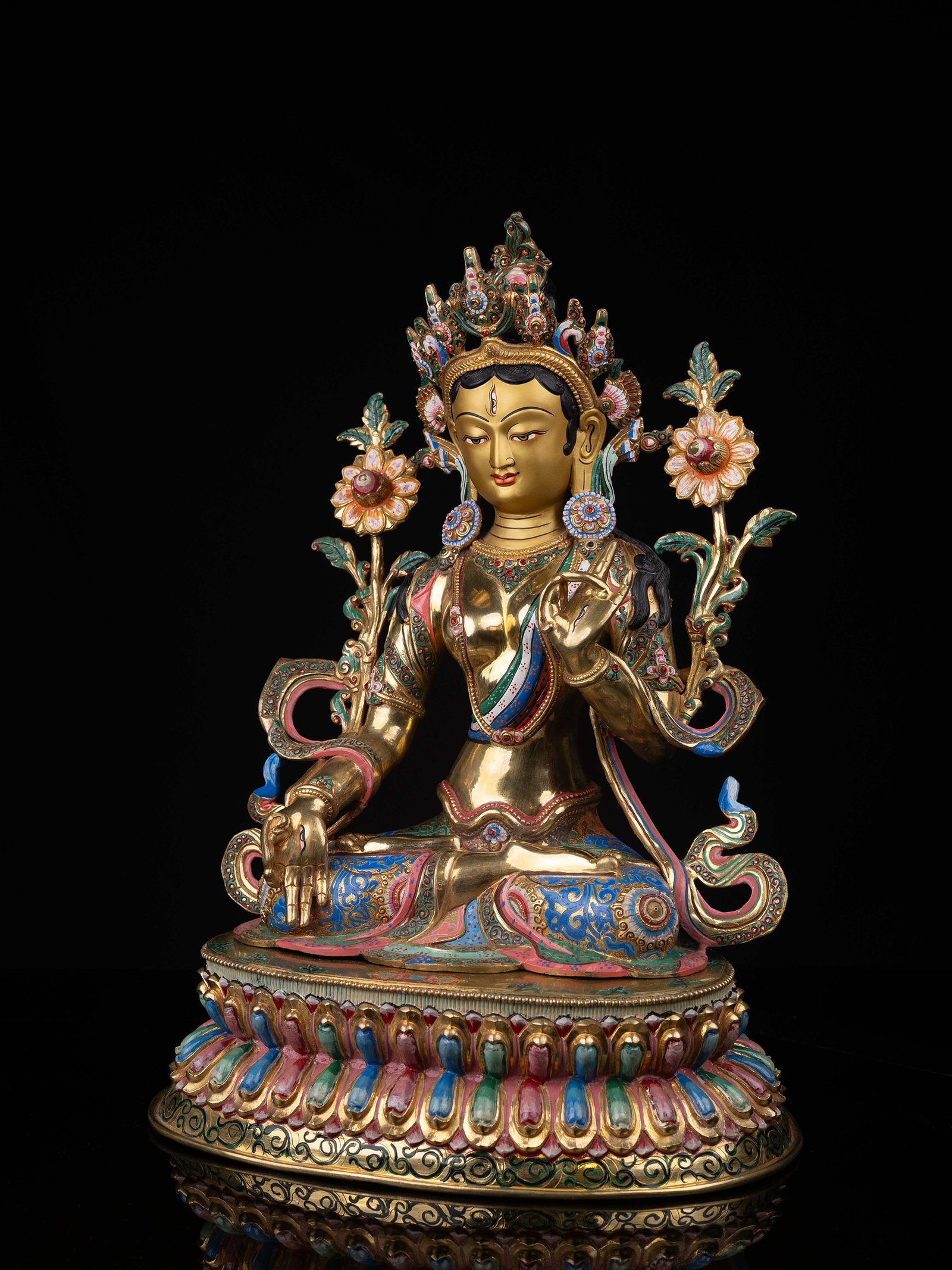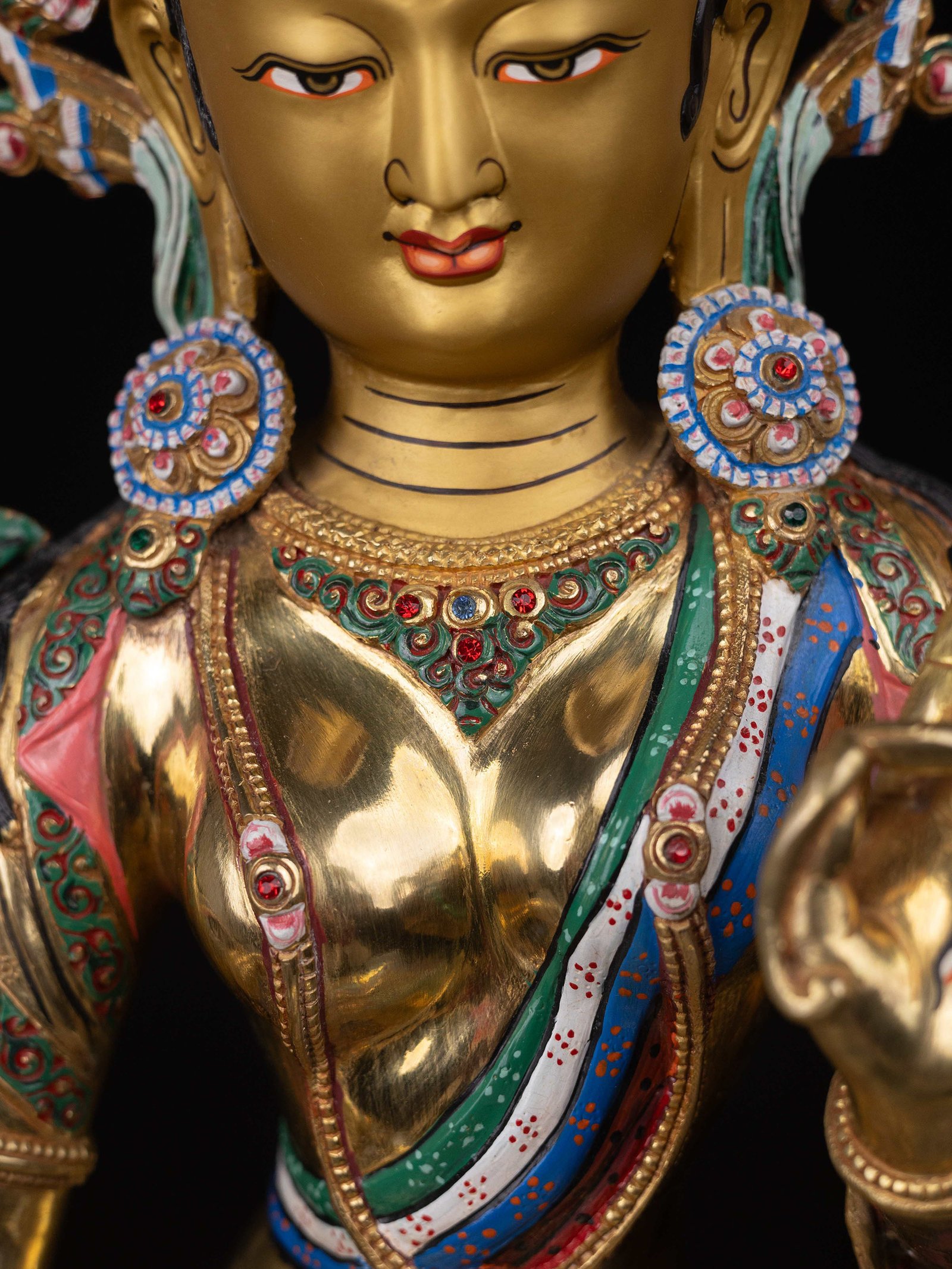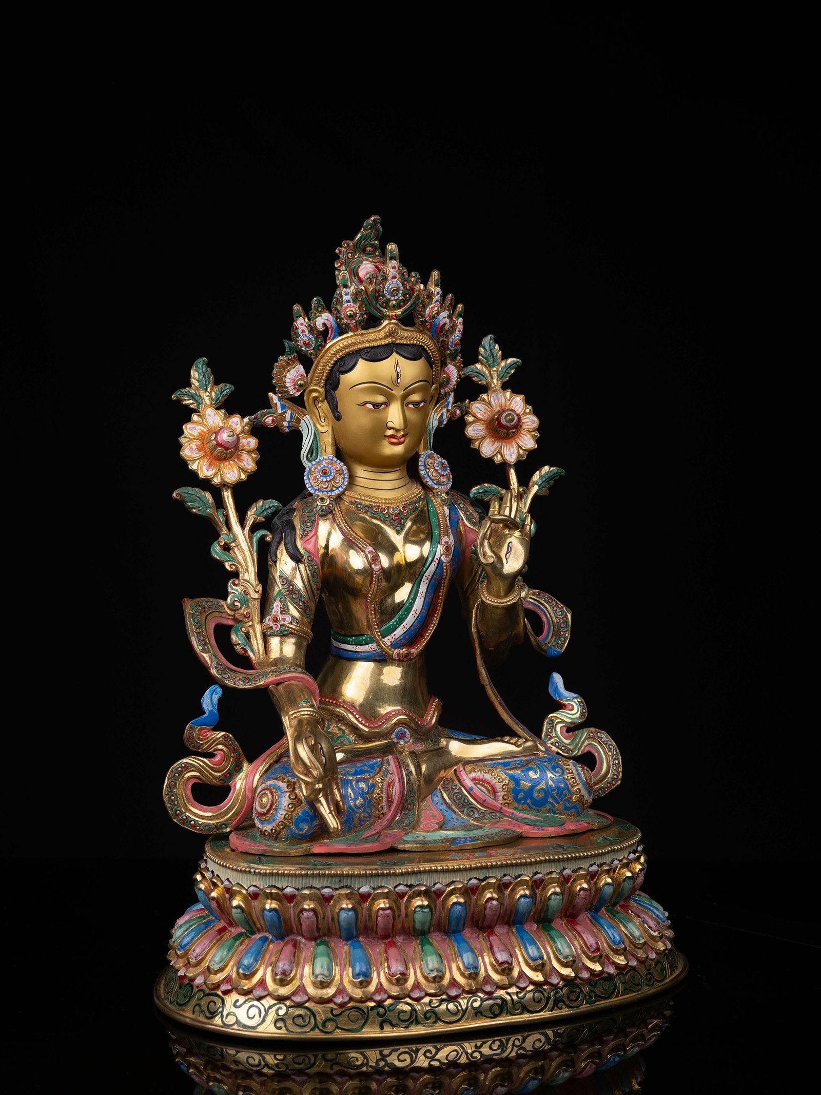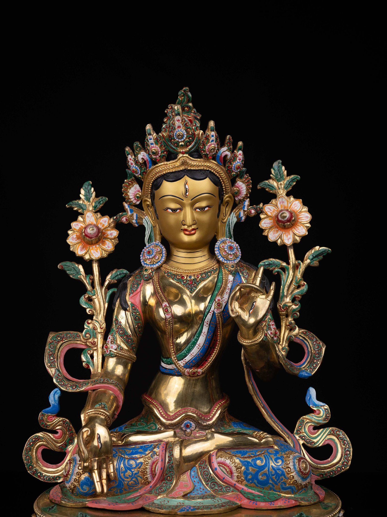 The face of White Tara is painted with gold to enhance its significant features, particularly the eyes, and lips. This detailed painting is essential as it brings forth the crucial attributes of the expression of eyes and lips that metal carving alone cannot capture.